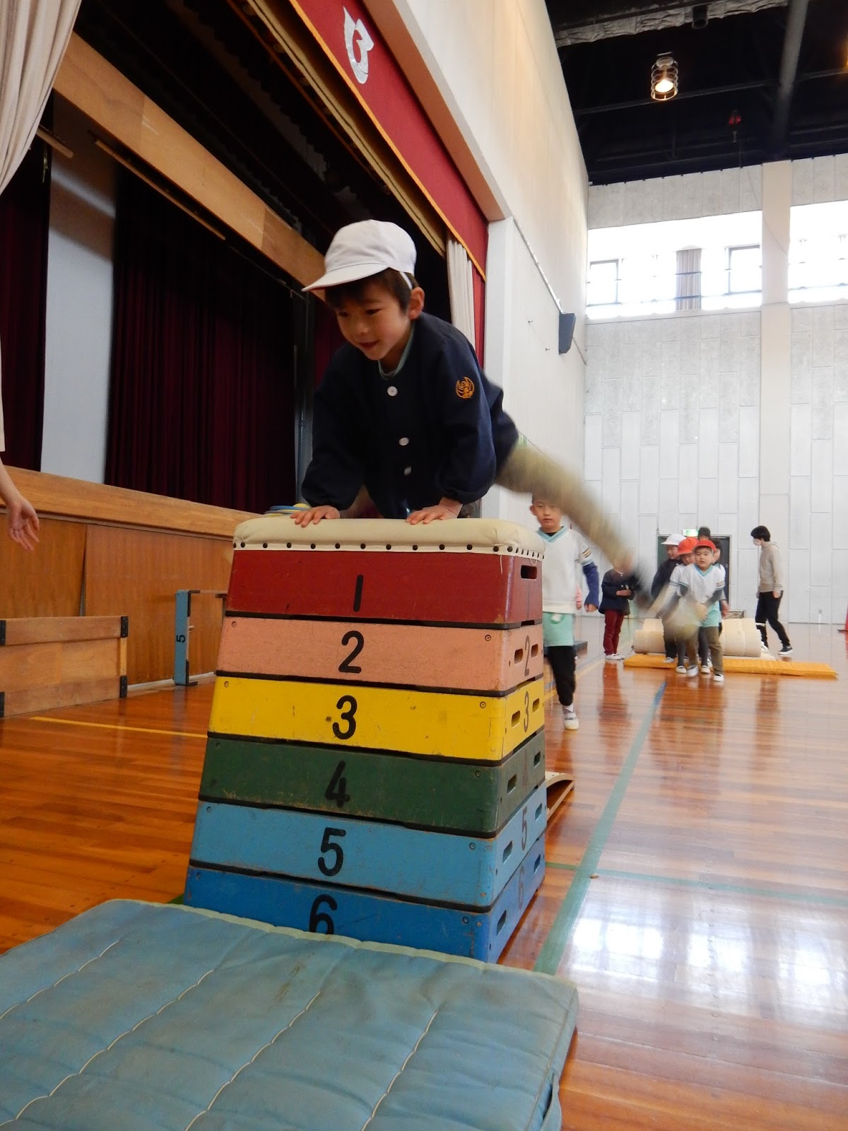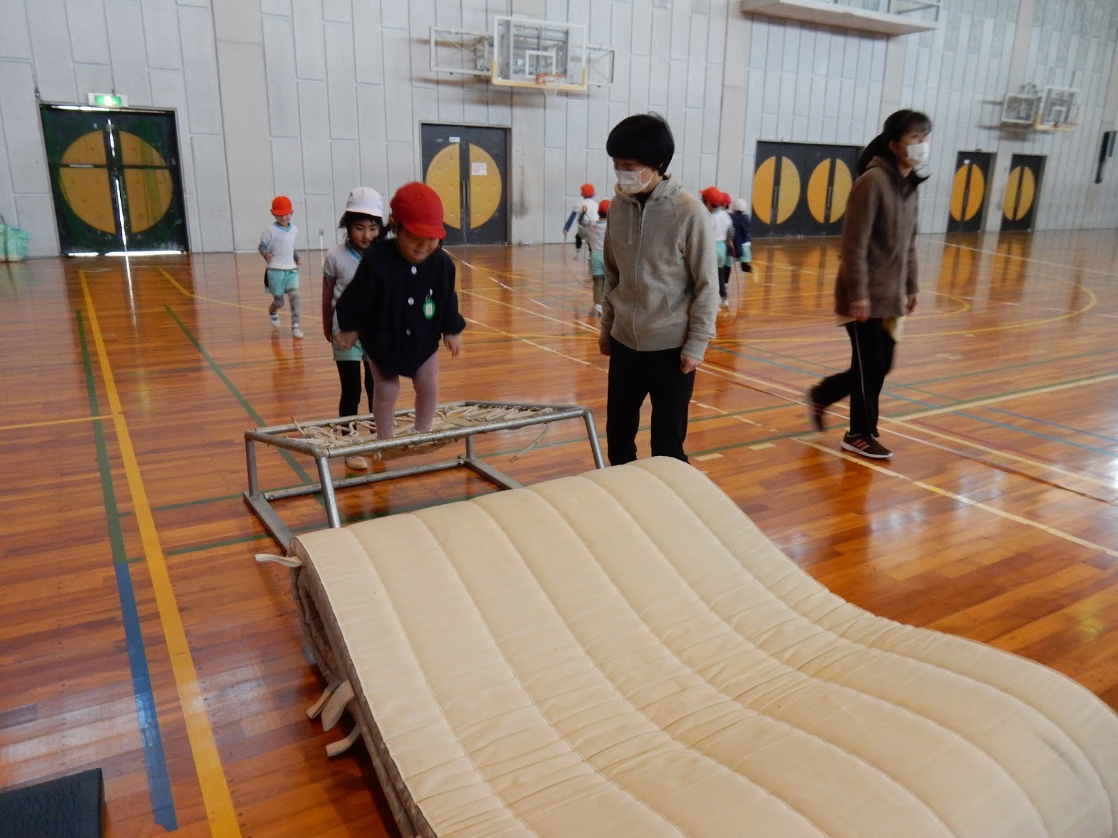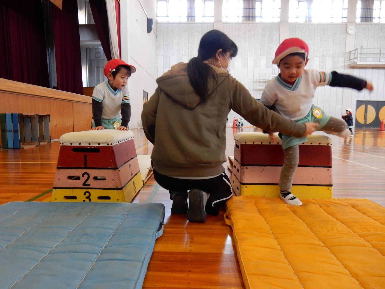 ゆりさんには、跳び箱4段をもう軽やかに跳びこすお友達がいましたよ!しっかり足を開いてだいに乗れる子ばかりで、来年の取り組みが楽しみになりました!トランポリン運動も、しっかりバネを使う事が出来れば、これも跳び箱に向かう力になりますね!