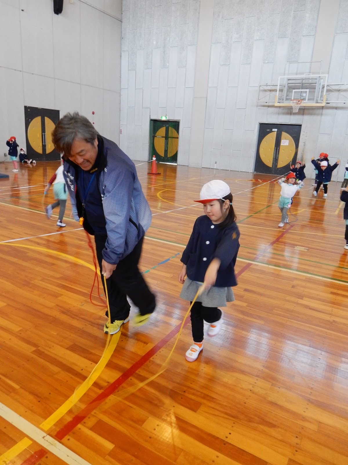 たんぽぽさんも、縄跳びを取り出し、二人で電車ごっこをしたかと思ったら、実際に走り跳びの間隔で縄を回したり。もちろん跳ぶ事はできないので、回しながら思い切り走ります!でも、腕を大きく回す運動って普段なかなかやらないので、ぎこちなくなってしまう子が多いんです。走りながらだと、何となく楽しく、勢いがついて回せそうですよね!