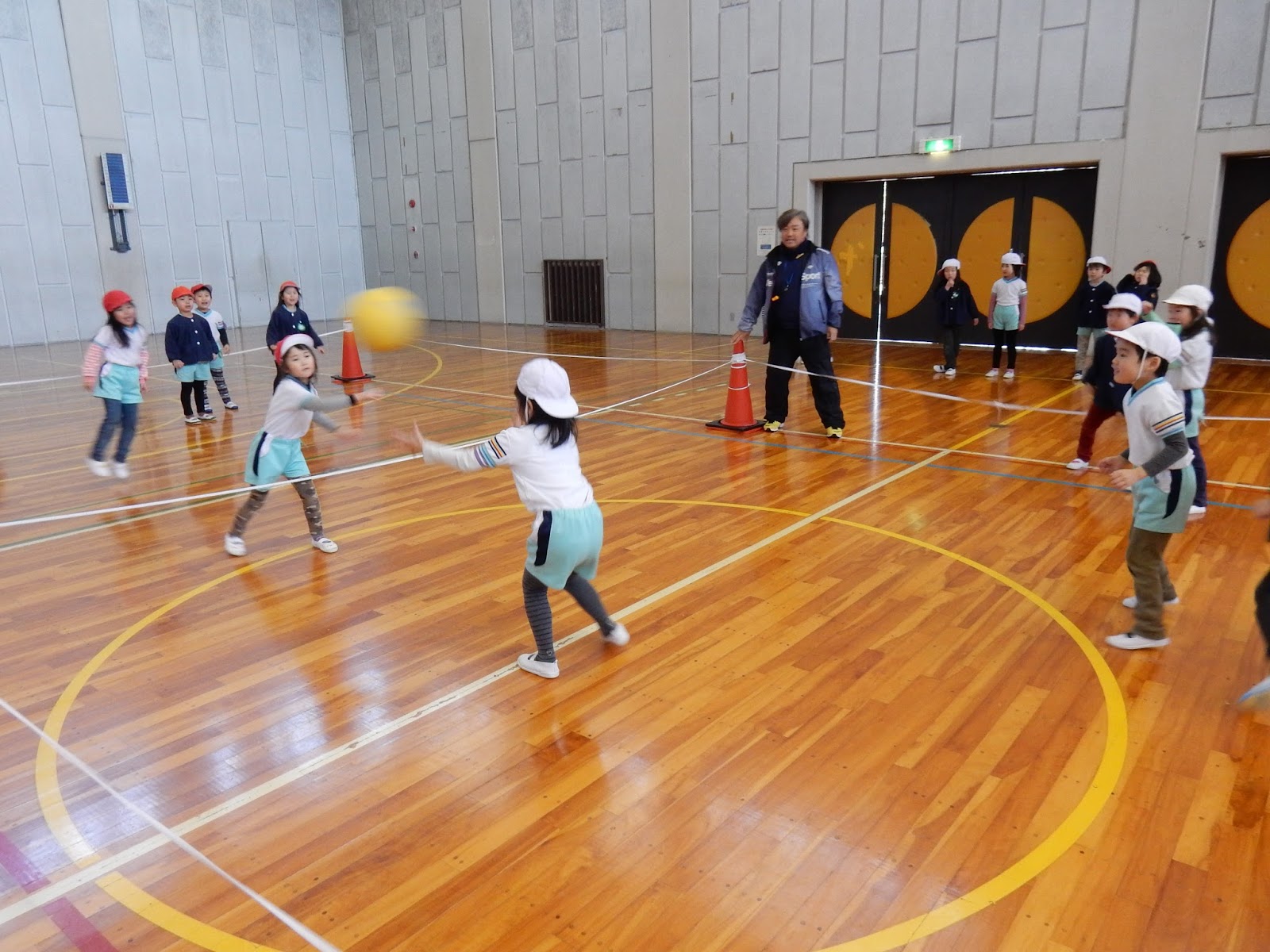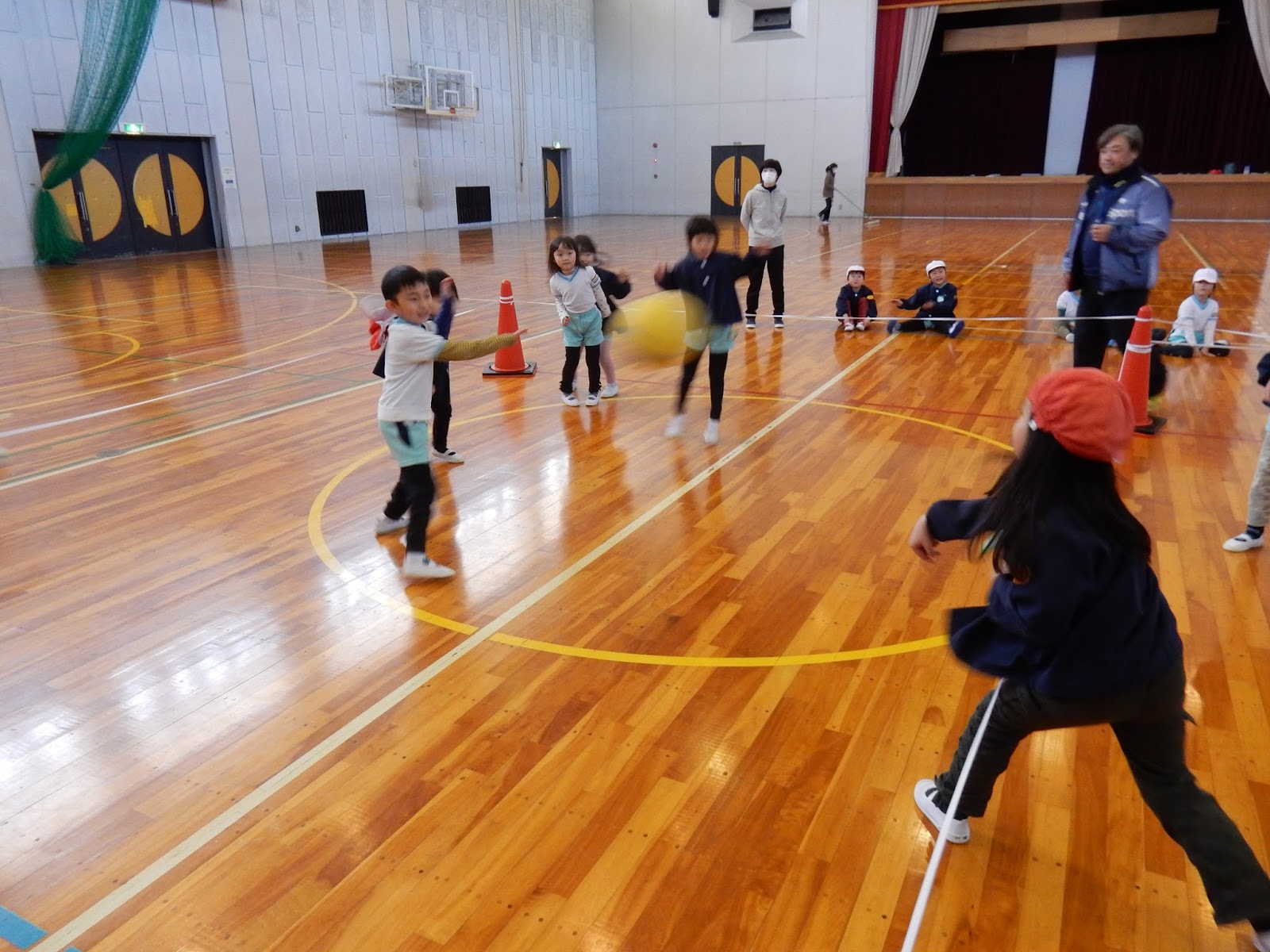 ゆりさんの爆弾ゲームは、みんな逃げるのに必死で、“ここから出ないでね!”の三角コーンは完全無視!(笑)ゴロゴロ先生も苦笑いでした。ひまわりさんは、お友達の事も考えて、受けやすい玉にしたり、思い切り遠くへ投げたりと、力のコントロールもできるようになってきました。
