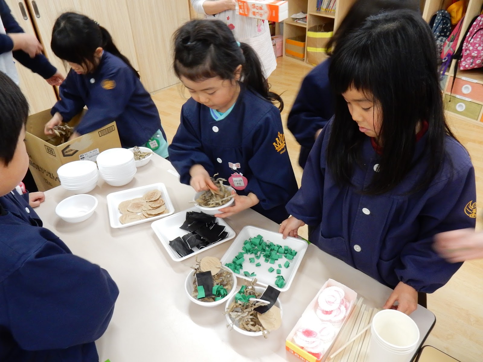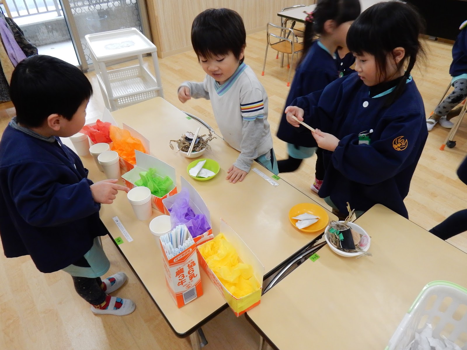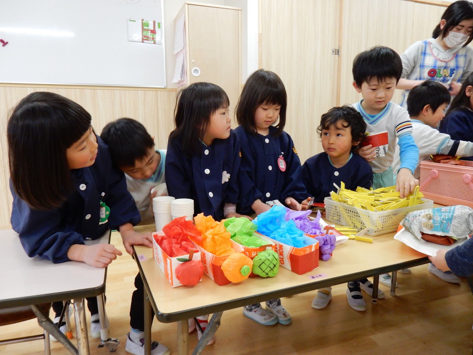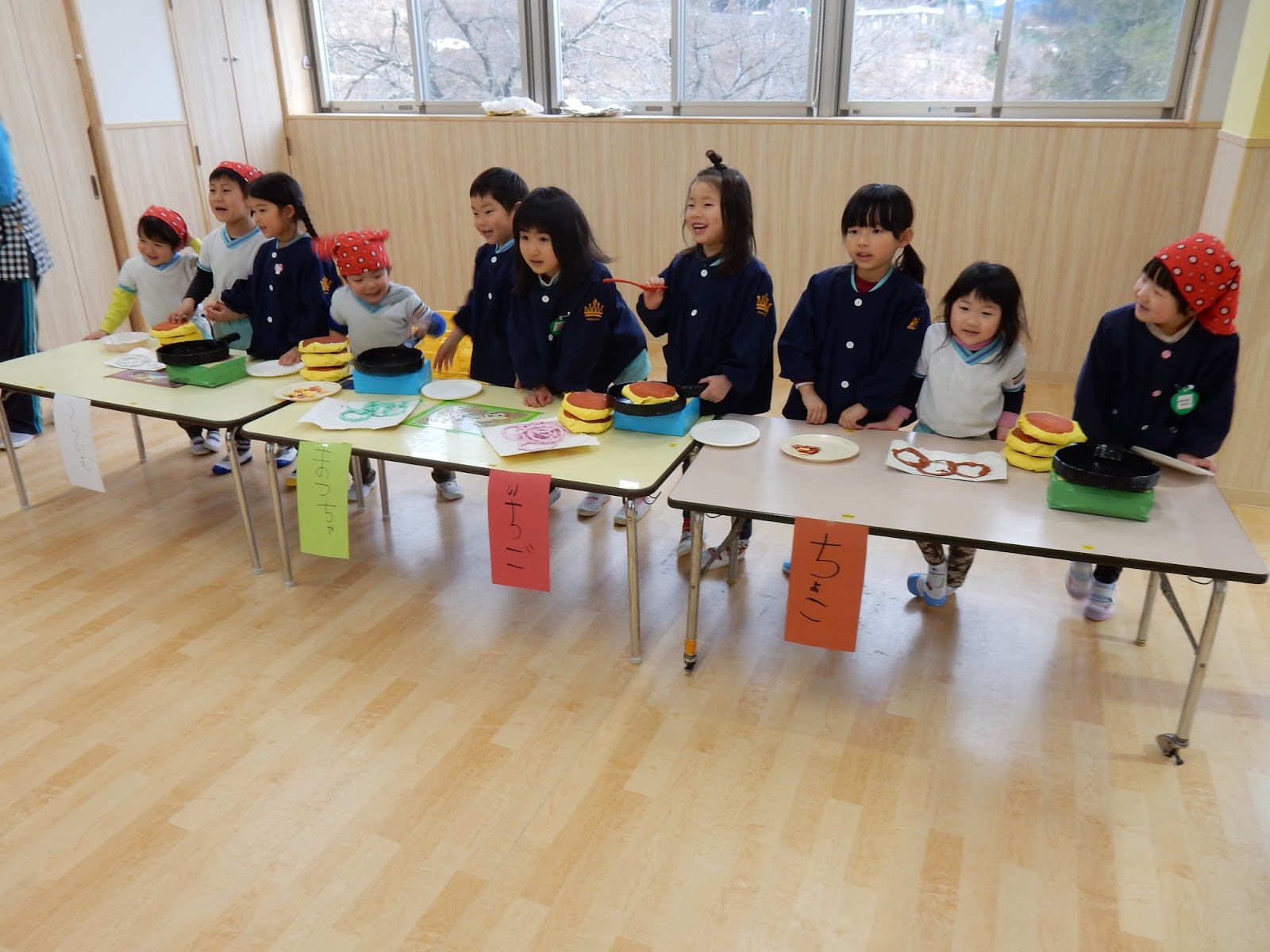 午後から、大きい3クラスは、来週のわいわいデーお店屋さんごっこに向けての開店準備をしましたよ!先日作った品物を並べて、実際にどんな風にお客さんに食べてもらうかを、それぞれのお店ごとに別れて練習をしました。どのお店屋さんでも、大きい子がリードしてくれて、店番も、お客さんもとっても楽しそうでした!益々、来週が楽しみになりましたよ!