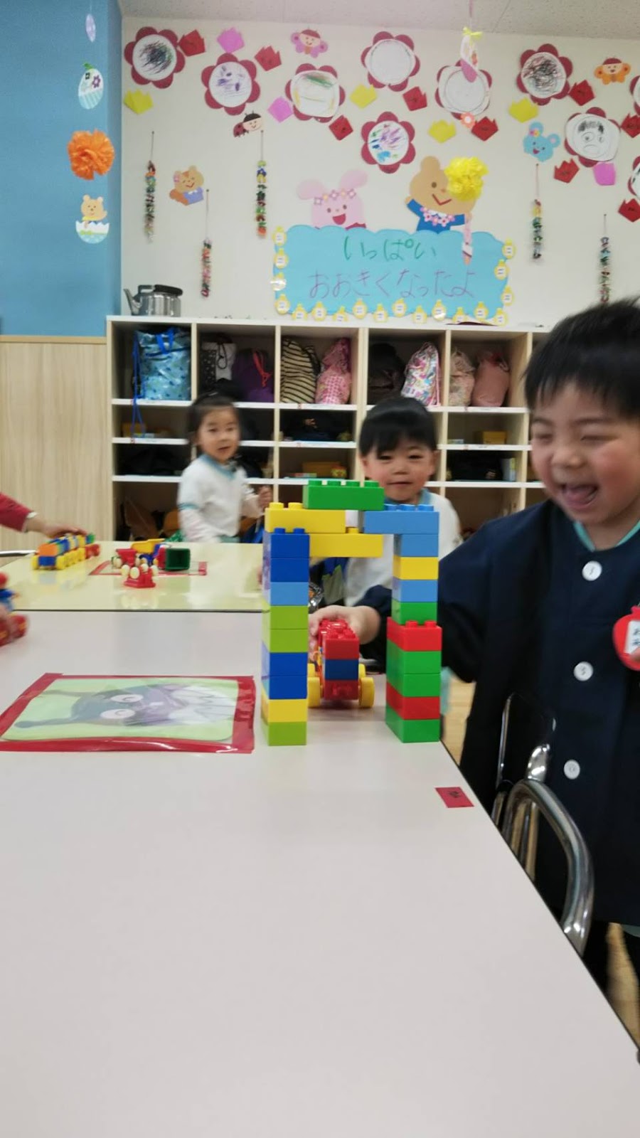 すみれ組のお部屋では、男の子たちがブロックでトンネルを作って遊んでいましたよ!
