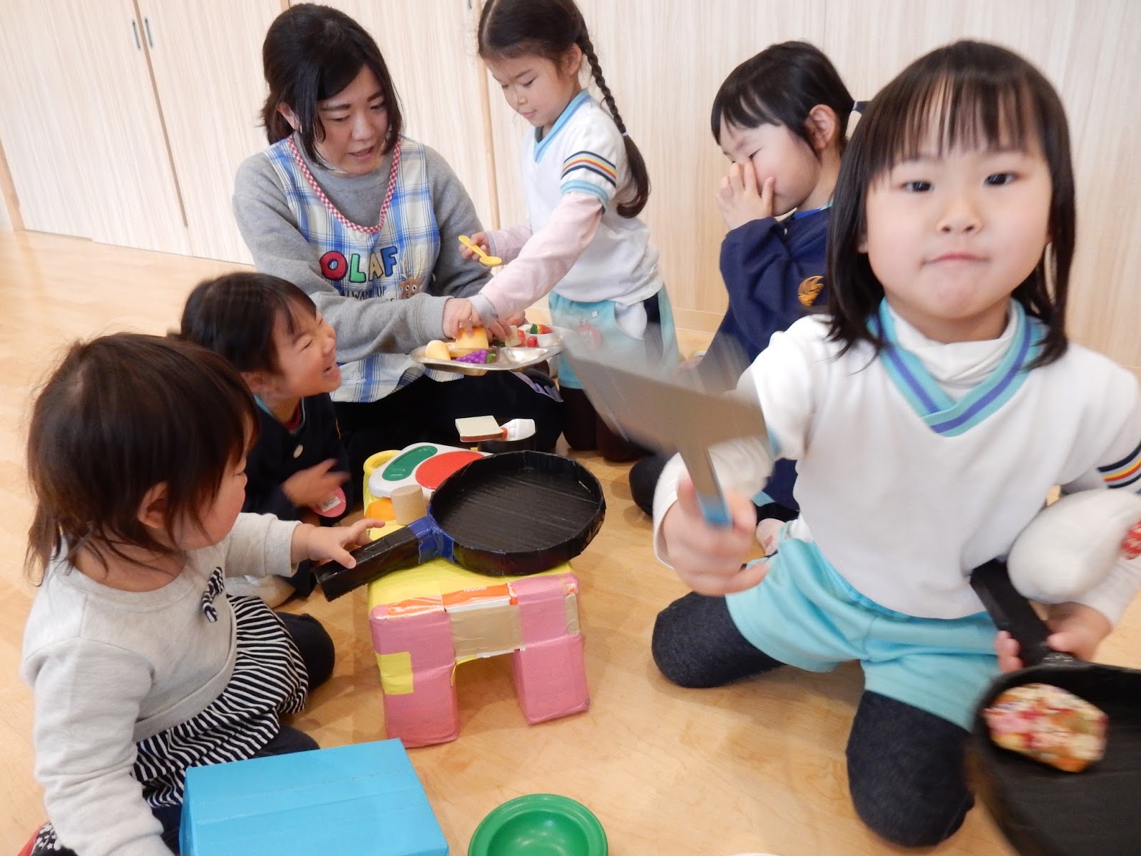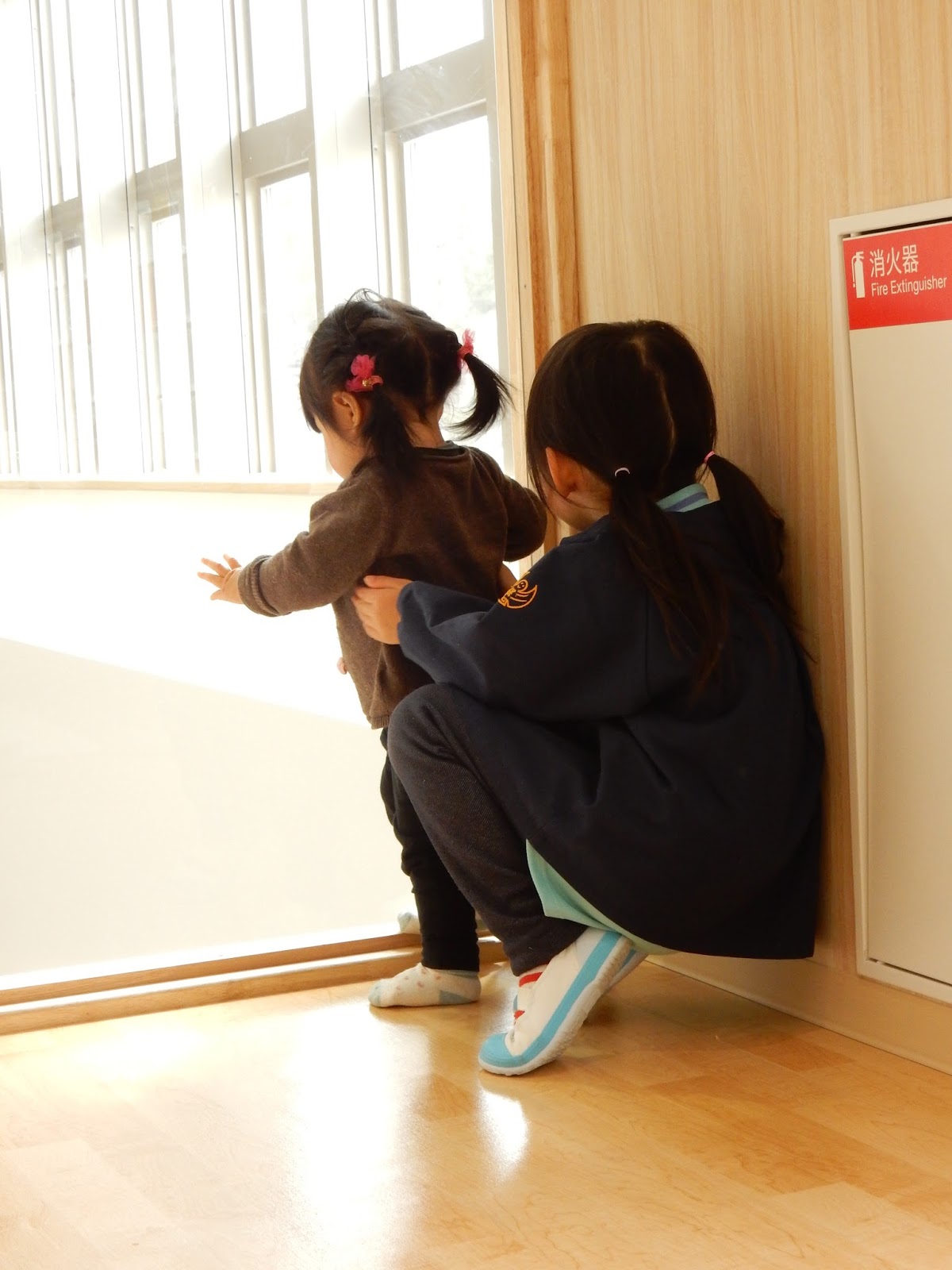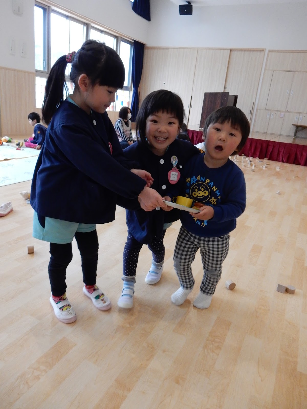 ホールで遊んでいるのは...ゆりさん!と、ひよこさん!今日は2クラス合同で遊んでいたみたい♡兄弟で遊んだり、おにいちゃん、おねえちゃんは小さい子のお世話が大好き♪可愛がってくれる姿が微笑ましいです。時には優しさが行き過ぎちゃって…なぁんてこともありますが、関わる中で、お互いの気持ちを知っていけるんだと思います。楽しい時間が過ごせましたね!