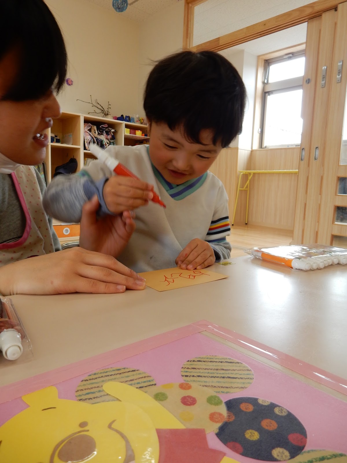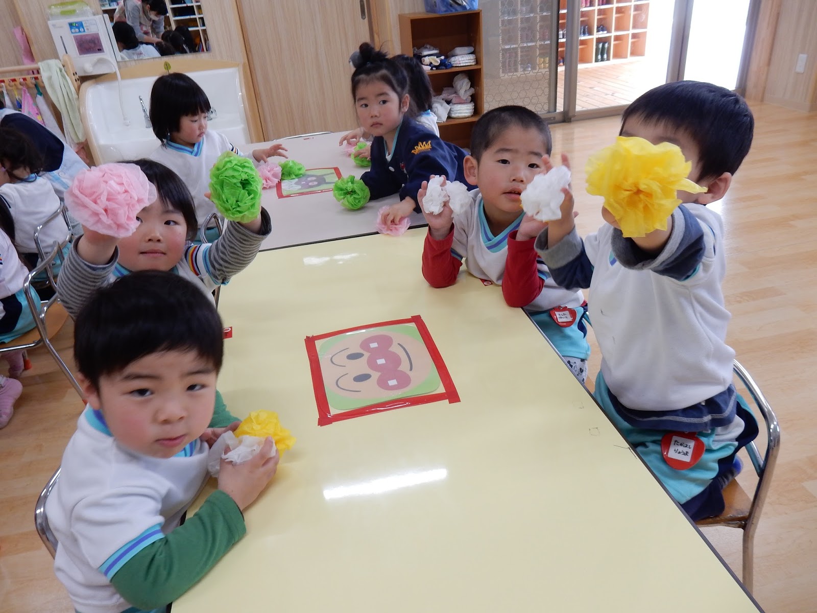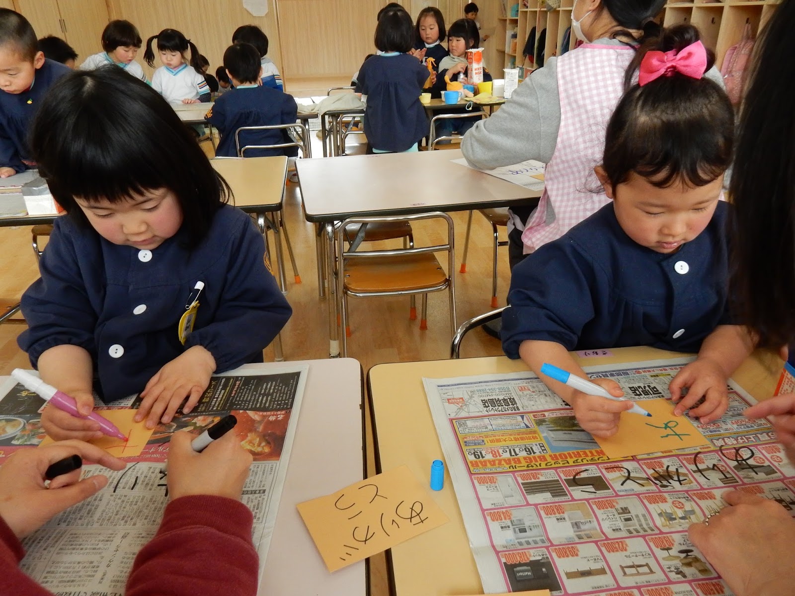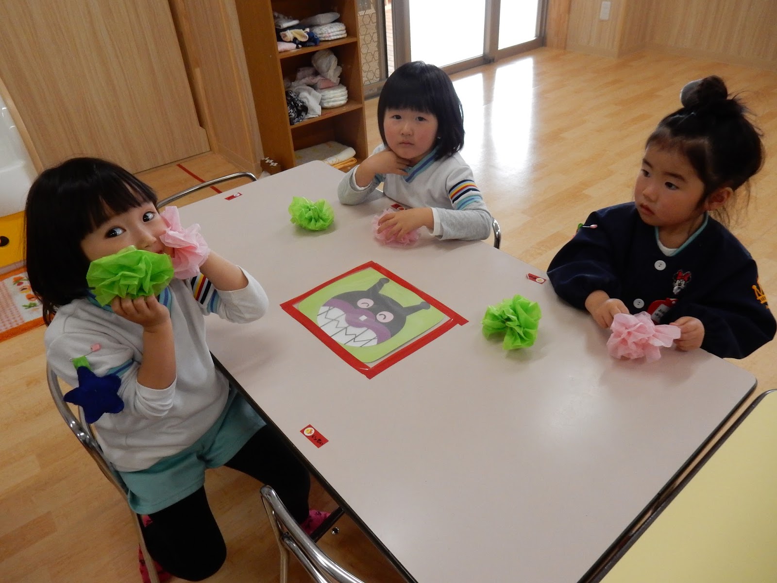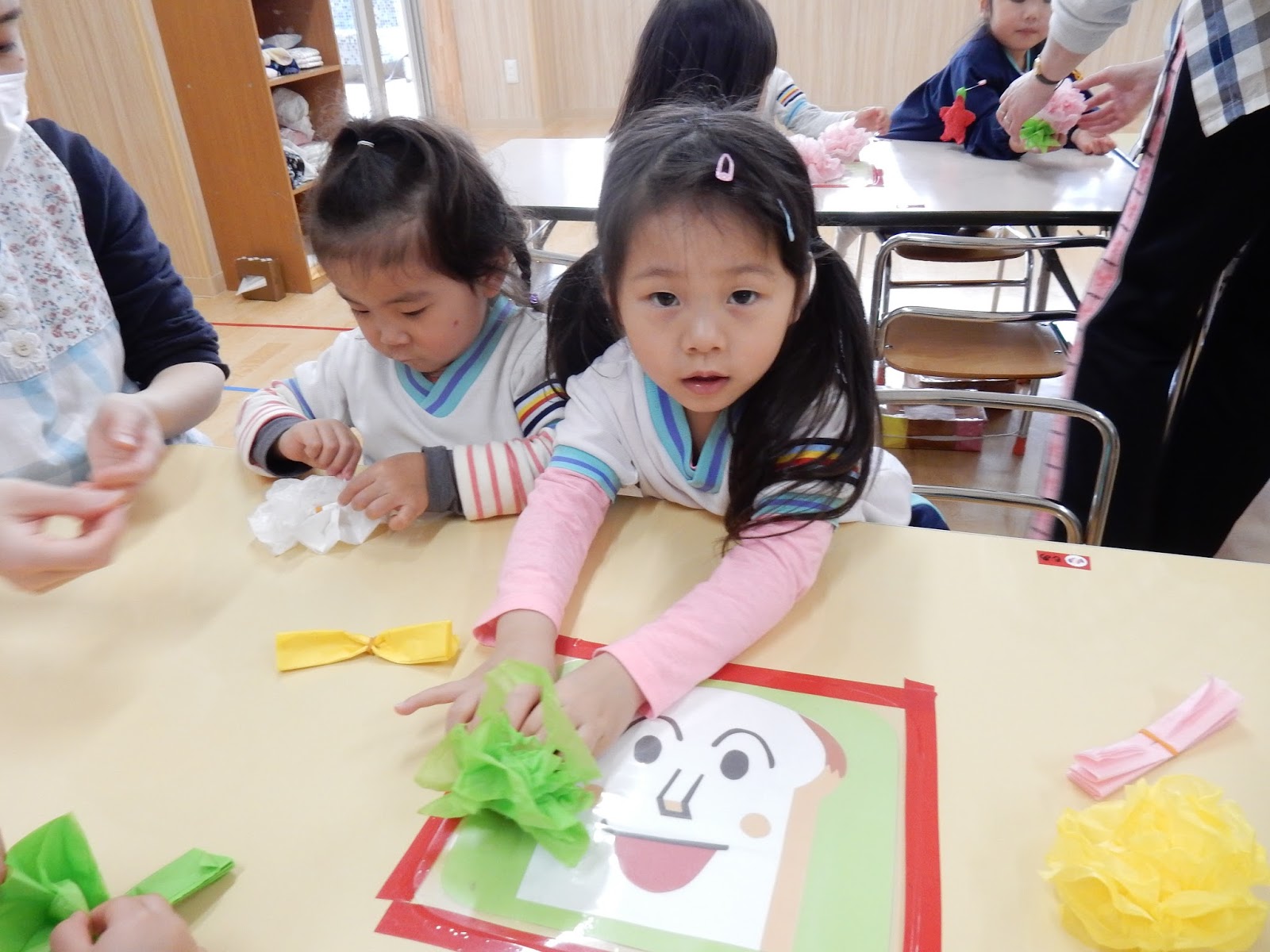 製作をするみんなの表情はとっても真剣!すみれさんは、何枚も重なったお花紙を1枚ずつめくってかわいらしい花を作っていました。たんぽぽさんは、先生のお手本をじーっと見ながら字を書いています。なんて書いたか、分かりますか??一生懸命書いたことが伝わる可愛らしい字です。この時期の作品は、本当に今限定!の可愛らしさ♡今日は、1年間で作った作品をみんな持って帰りますよ!ご家族でご覧になって下さいね!きっと、その時々の様々な思い出話が聞けることと思います!