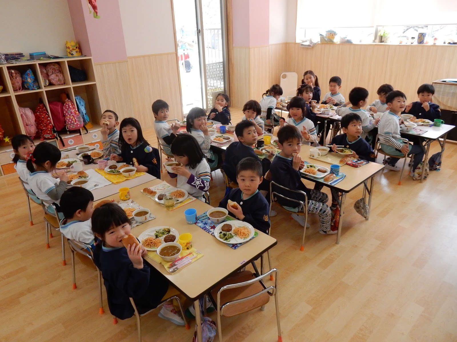 今日は、ひまわりさんと一緒に給食を食べました。いつもは時間が違うすみれさんや、ひよこさんのお部屋にも、お兄ちゃん、お姉ちゃんが来てくれましたよ!
