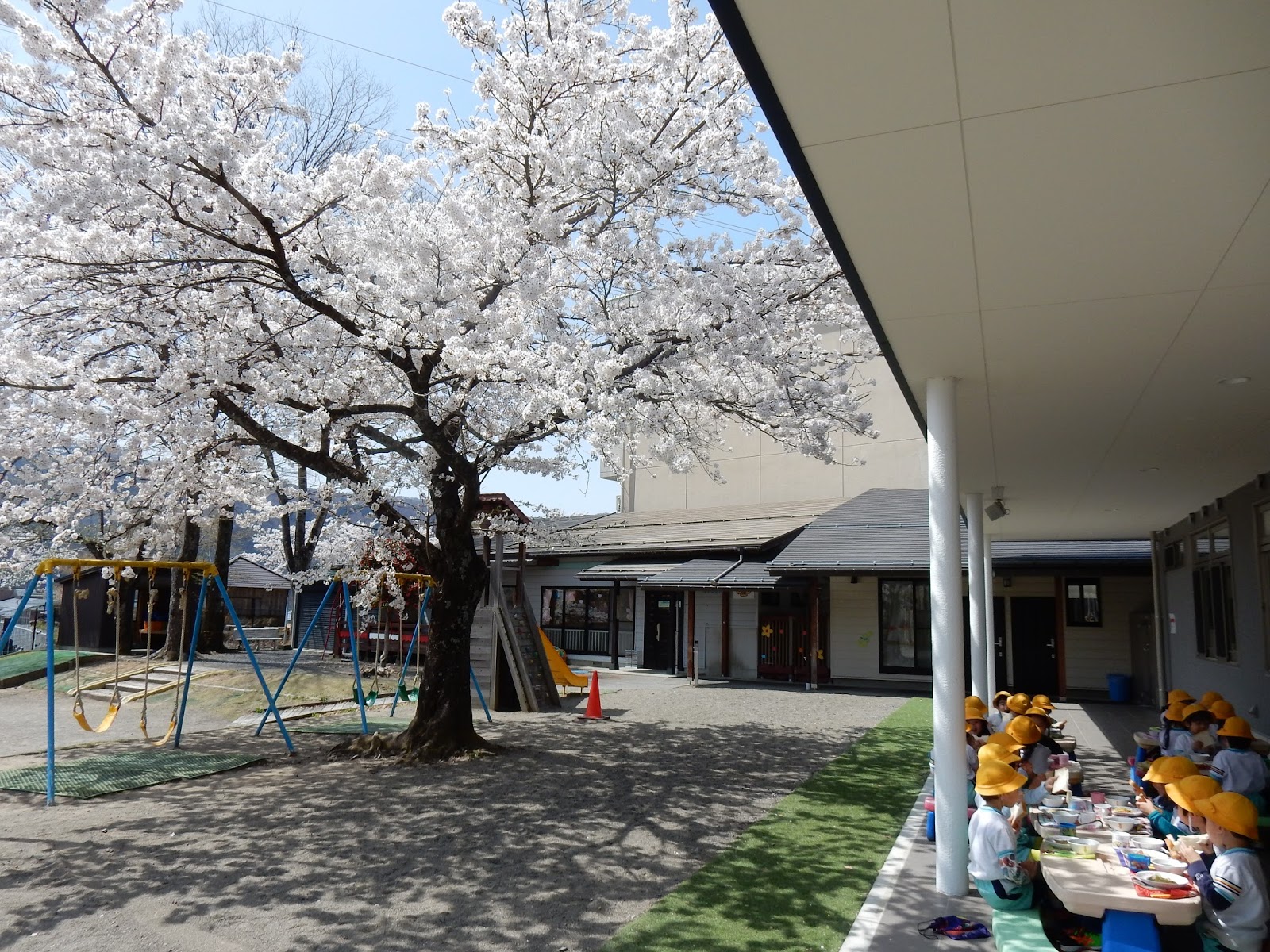 満開の桜の木の下で、ひまわりさんはお花見給食♪美味しい給食が、益々おいしく感じますね!開放感もあって、とっても楽しそうな時間を過ごしていましたよ♪