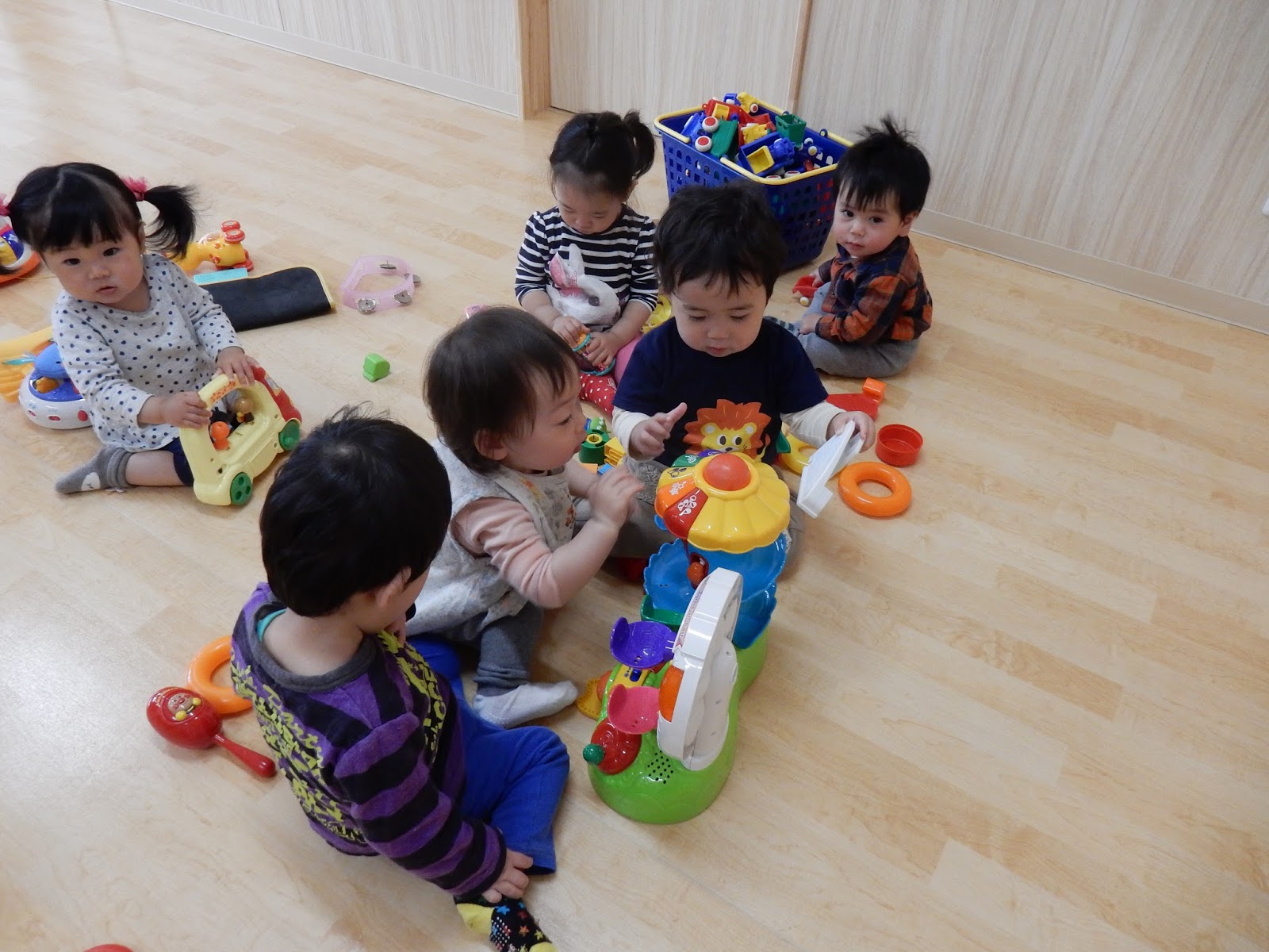 早速おもちゃを出すと、みんな好きなおもちゃを手にしはじめました。最初は少し遠慮がち。そこがまた可愛らしいですね!きっとこれから、一杯ケンカもするでしょうが、そのたびに、お友達の気持ちにも少しずつ気が付いていくんですよね!