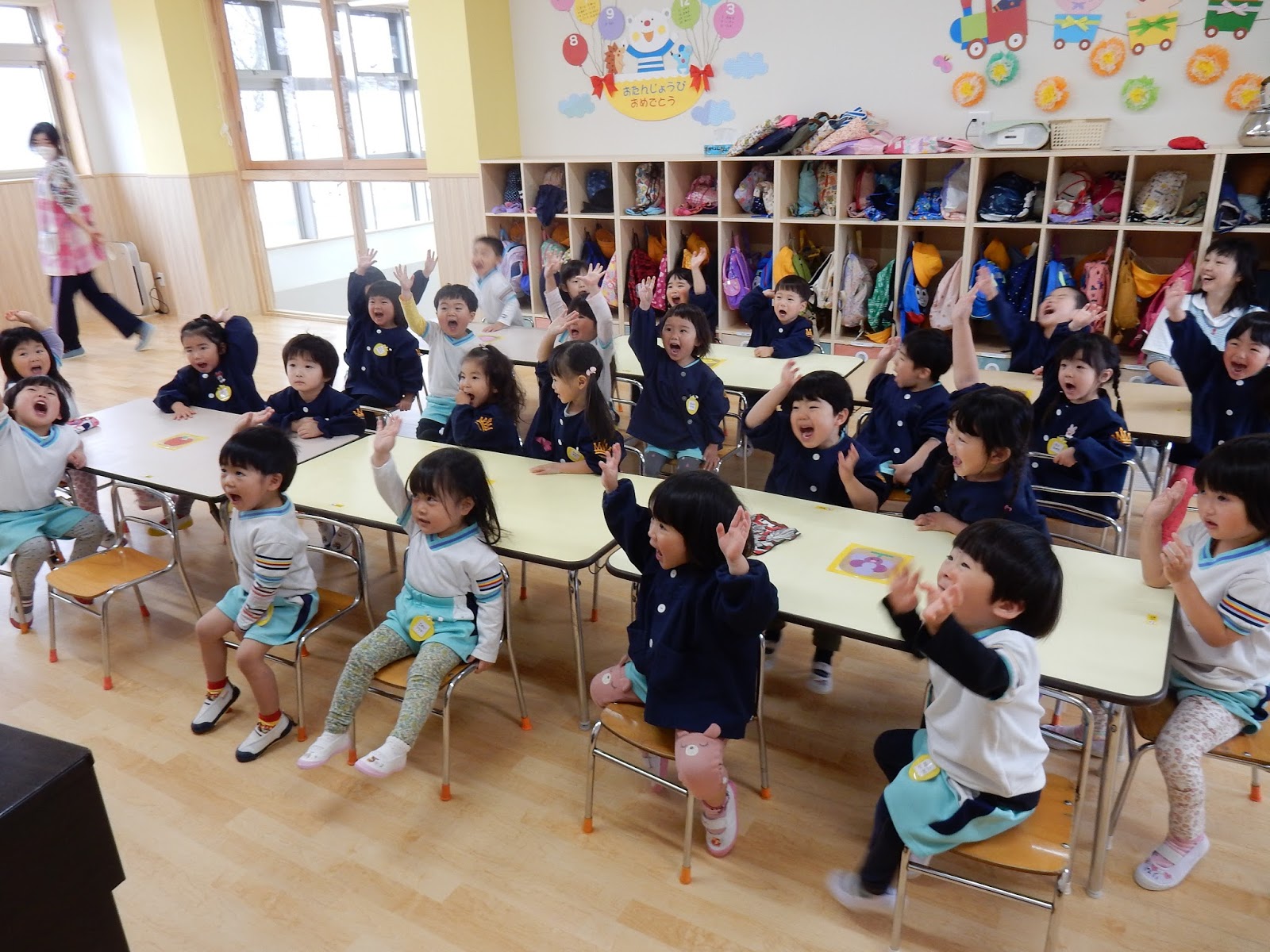 『はぁぁぁぁい!!!』と元気な声が聞こえてきたのはたんぽぽぐみさん。お椅子に座って、先生から名前を呼んでもらうと、進級児さんはもちろん、新しく園に来始めたばかりのお友達も、手を高く上げて“ここだよ!!”とお返事してくれたんです!この姿にはビックリしました!お名前と、お顔、はやく覚えて、みんなで仲良くあそびたいね!
