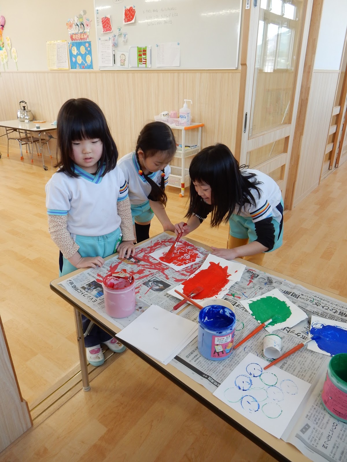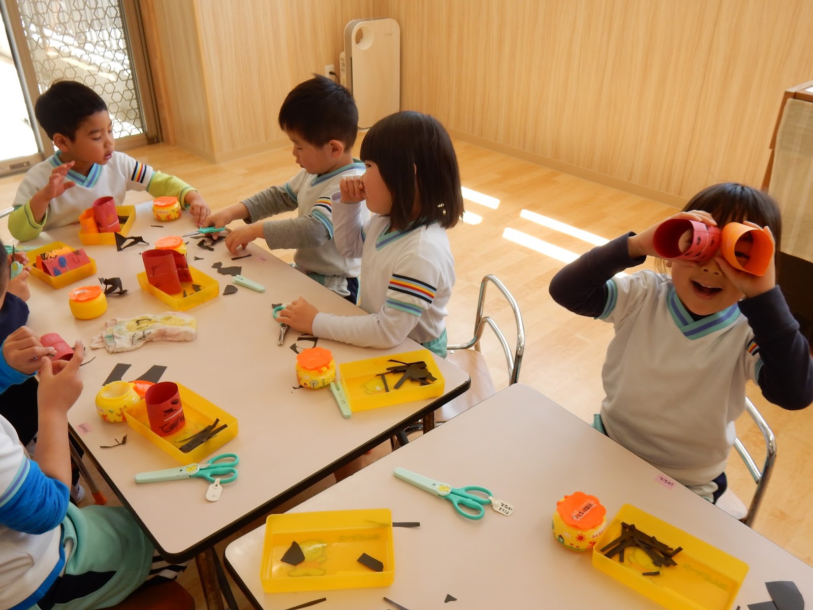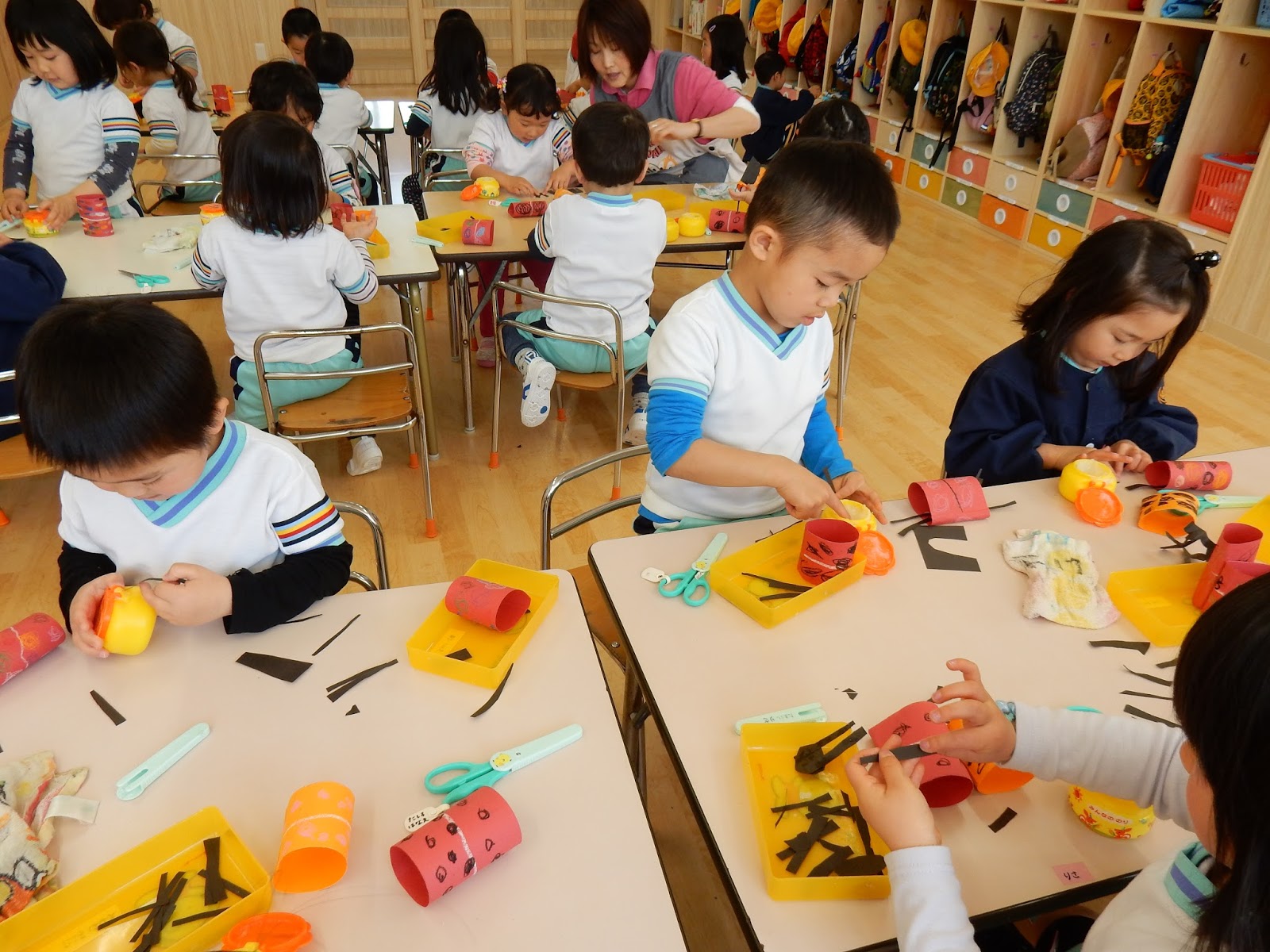 ゆりさんは、たんぽぽさんの時にたくさん使って上手になったはさみで、画用紙を切っていきます。筒型の赤とオレンジの画用紙には、黒い斑点模様が。こちらは、春の虫が可愛らしく出来そうですね!