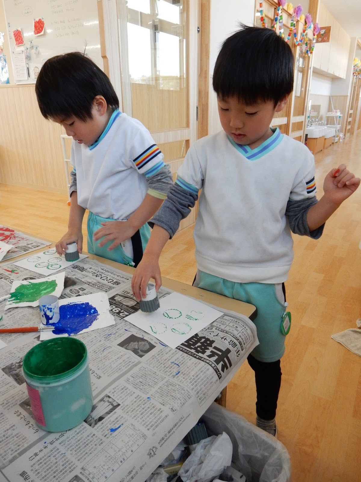 ひまわりさんは、自分で作ったスタンプに絵の具を付けておしたり、真っ白の画用紙に白いクレヨンでお絵描きした上から絵の具を塗ってみたり。製作あそびを楽しみました。トイレットペーパーの芯を組み合わせて作ったスタンプは、みんなが違う模様!そして、白いクレヨンが浮かび上がると、みんなから歓声が上がりました。