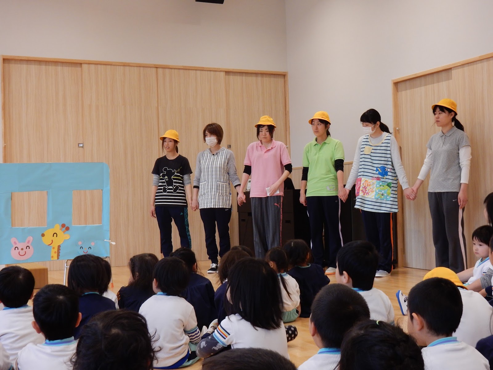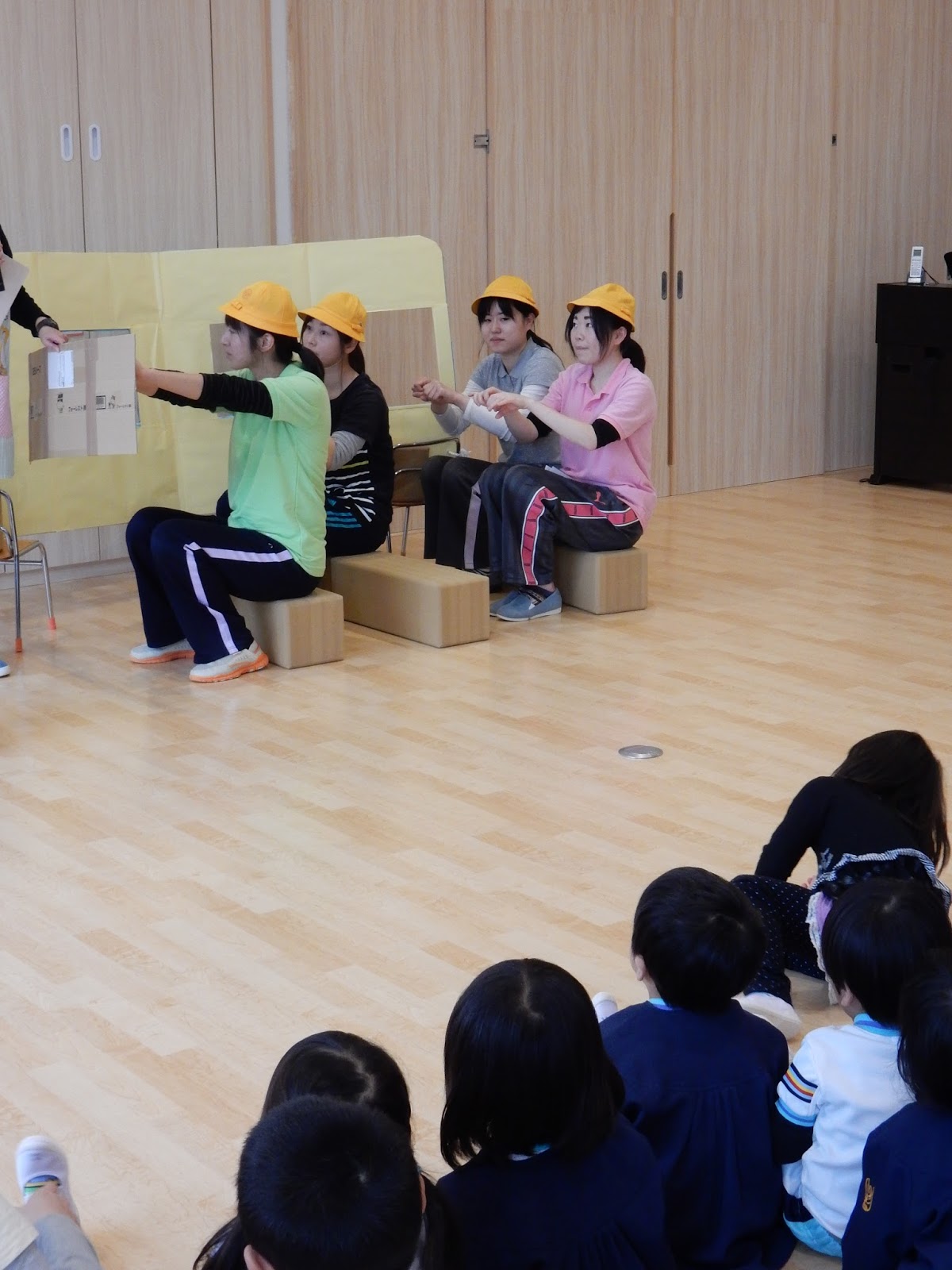 今日は、みんながホールに集まって、交通のルールをお勉強します。今月は、バスの乗り方について。せんせいたちが、劇をしながら分かりやすくお話してくれましたよ!