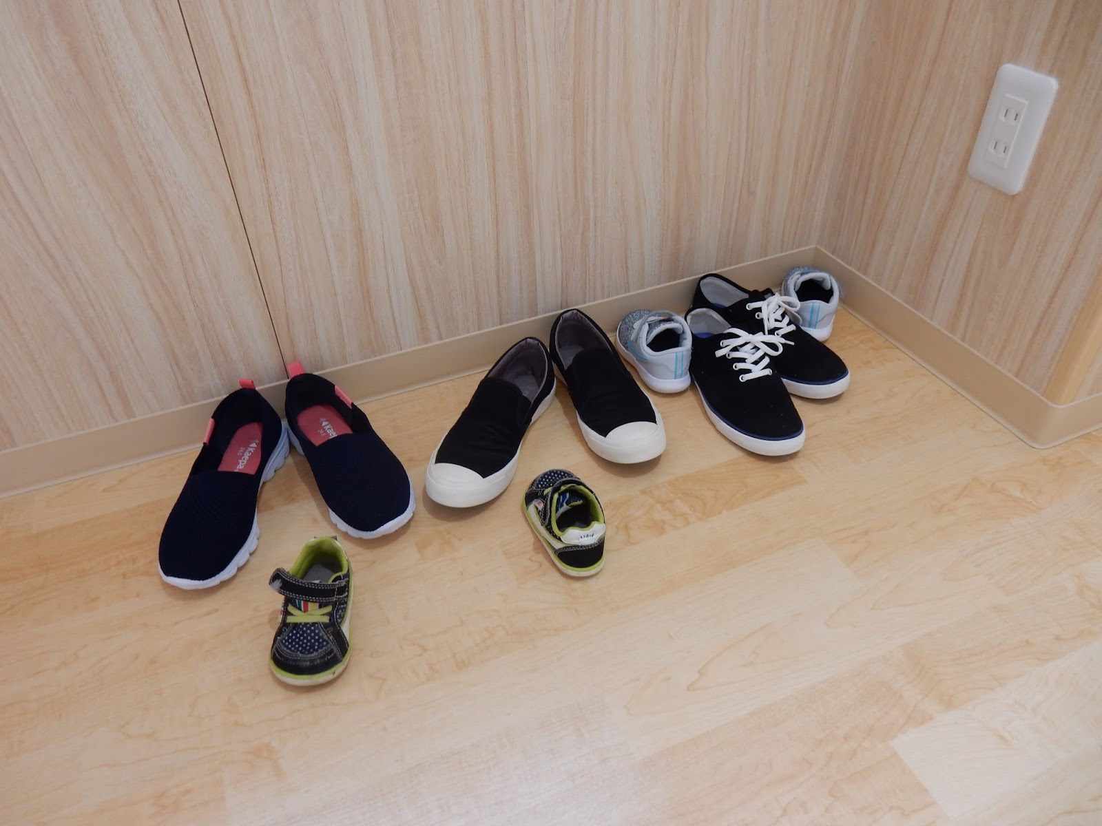 ひよこさんのお部屋の前の廊下です。床暖の聞いたお部屋なので、お部屋の中では靴を脱いで生活しています。先生たちが廊下に靴を並べておくと、朝バスで登園したお友達が、それにならって靴をここに置いていきます(笑)靴箱は別の場所にあるけれど、自分で持ってきて、ここにちょこんと置いていく姿が可愛らしいですよね♡