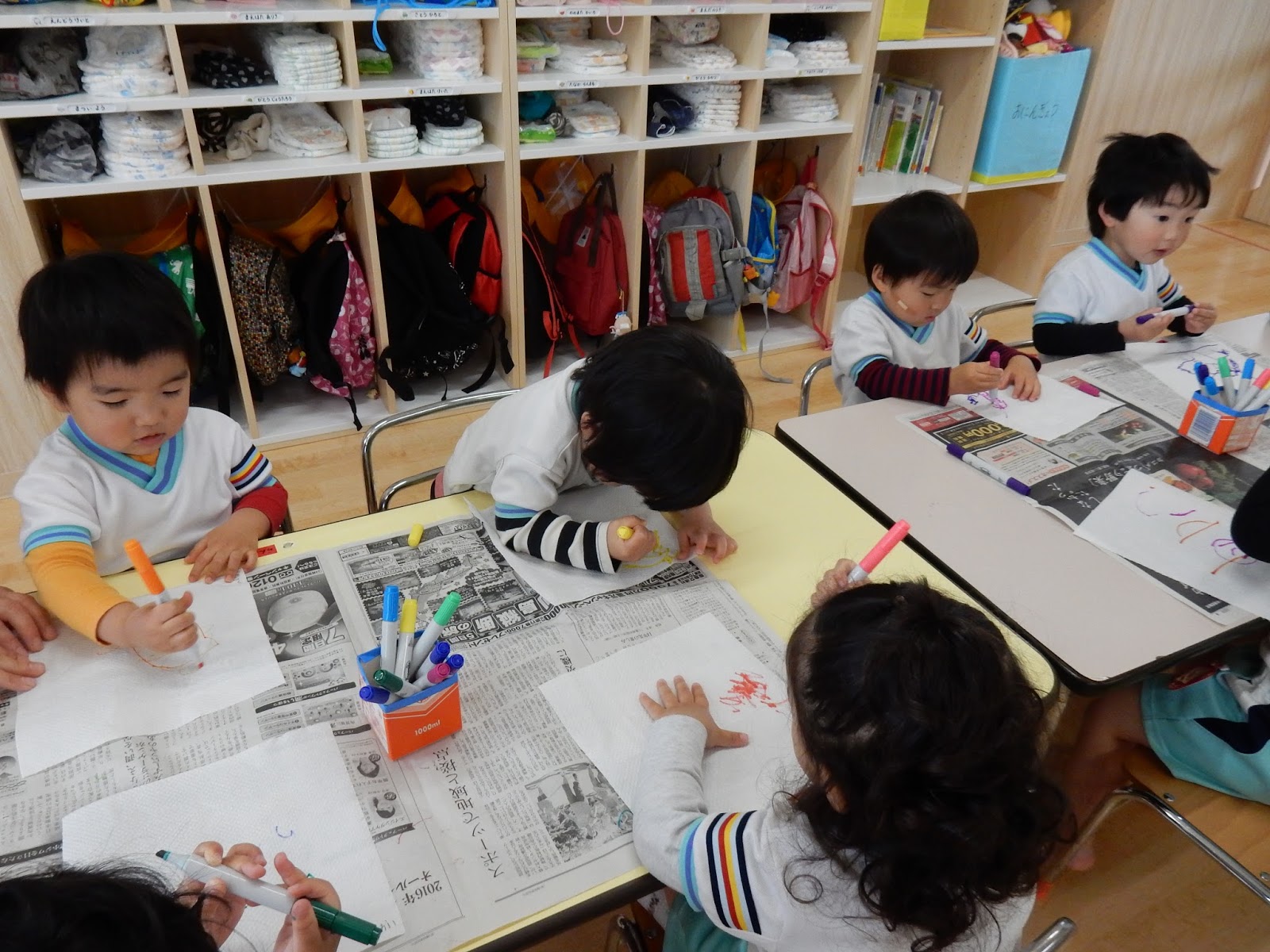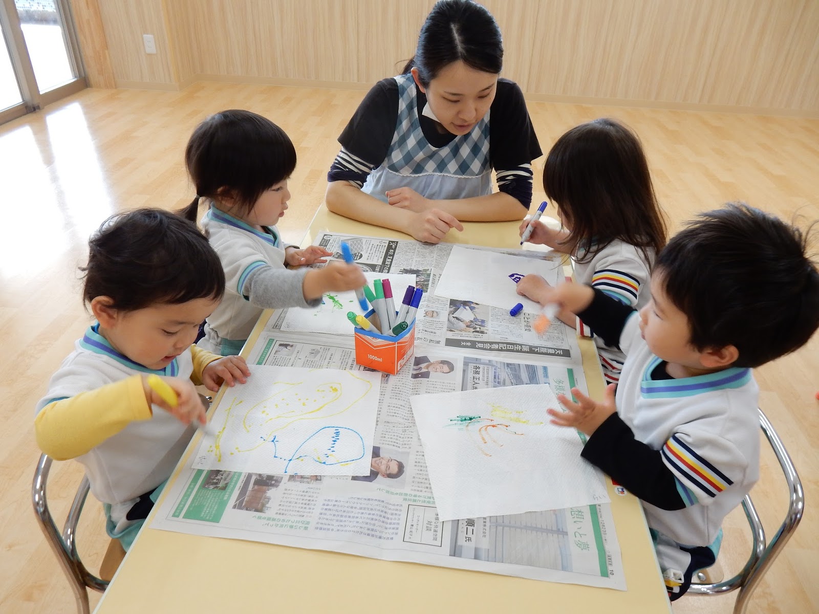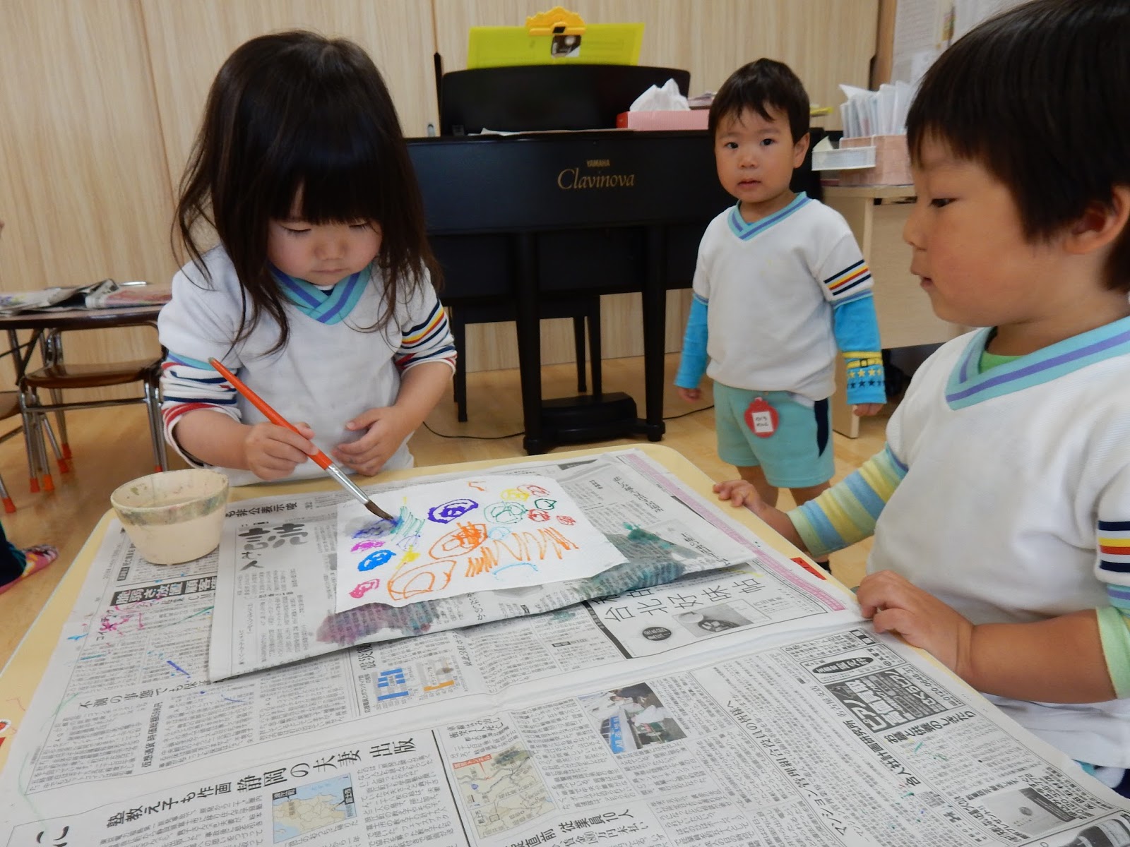 各クラスの制作の様子を紹介します!ひよこさんは、おもちゃで遊びながら順番に絵の具でお絵描き。今日は筆ではなく、指に絵の具を付けていましたよ!ちょんちょんと小さな指スタンプをしたり、ゴシゴシと強く描いたり。かすれ模様や、水玉など、いろんな模様が描けました。