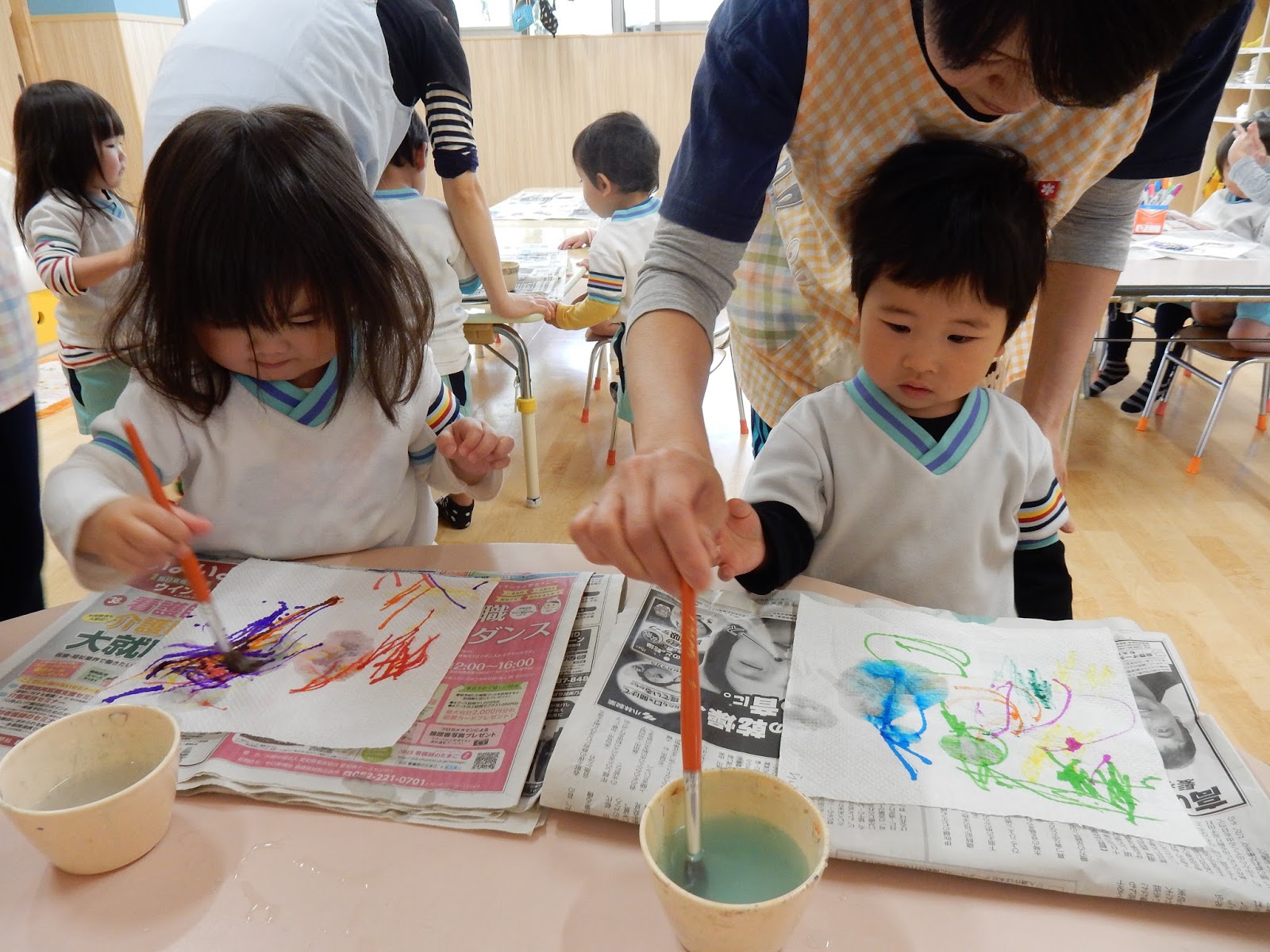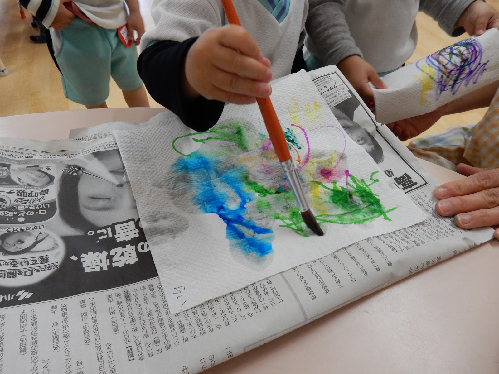 すみれさんのお絵描きは、お家にもあるキッチンペーパーにマジックで。たくさんいろんな色で描いた後には、今度は水をつけた筆でなぞっていきます。水を付けたところから、じわーっと色がにじんでくると、『うわ~!!きれい!!』と子ども達も嬉しそう!混ざり合った色が、お絵描きの雰囲気とはまた違って可愛らしいです!