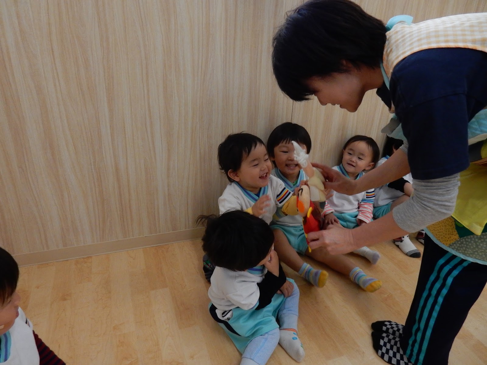 今日、すみれさんにはアンパンマンが遊びに来てくれましたよ!エプロンをつけて、お話をする“エプロンシアター”をみずき先生とみなみ先生がやってくれました。みんな釘づけ!最後にはタッチ!もしましたよ♪