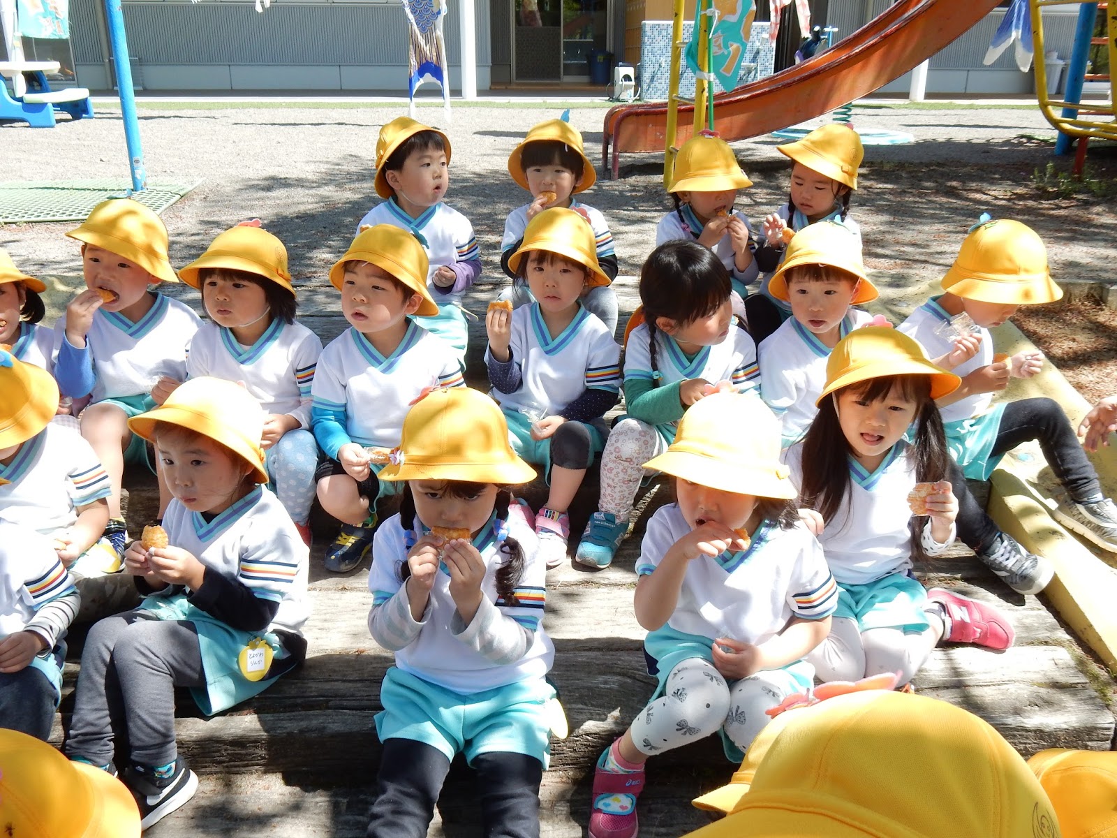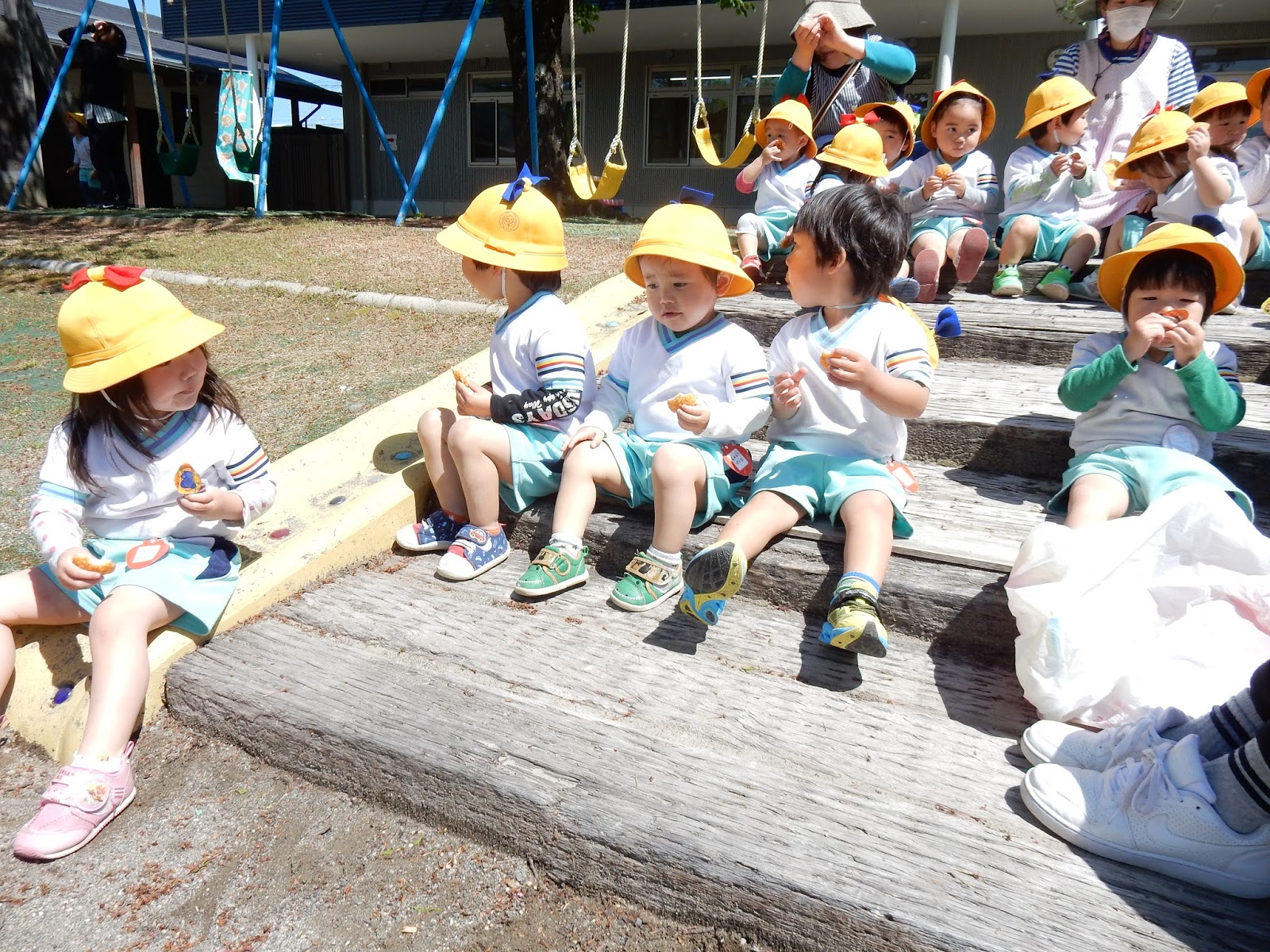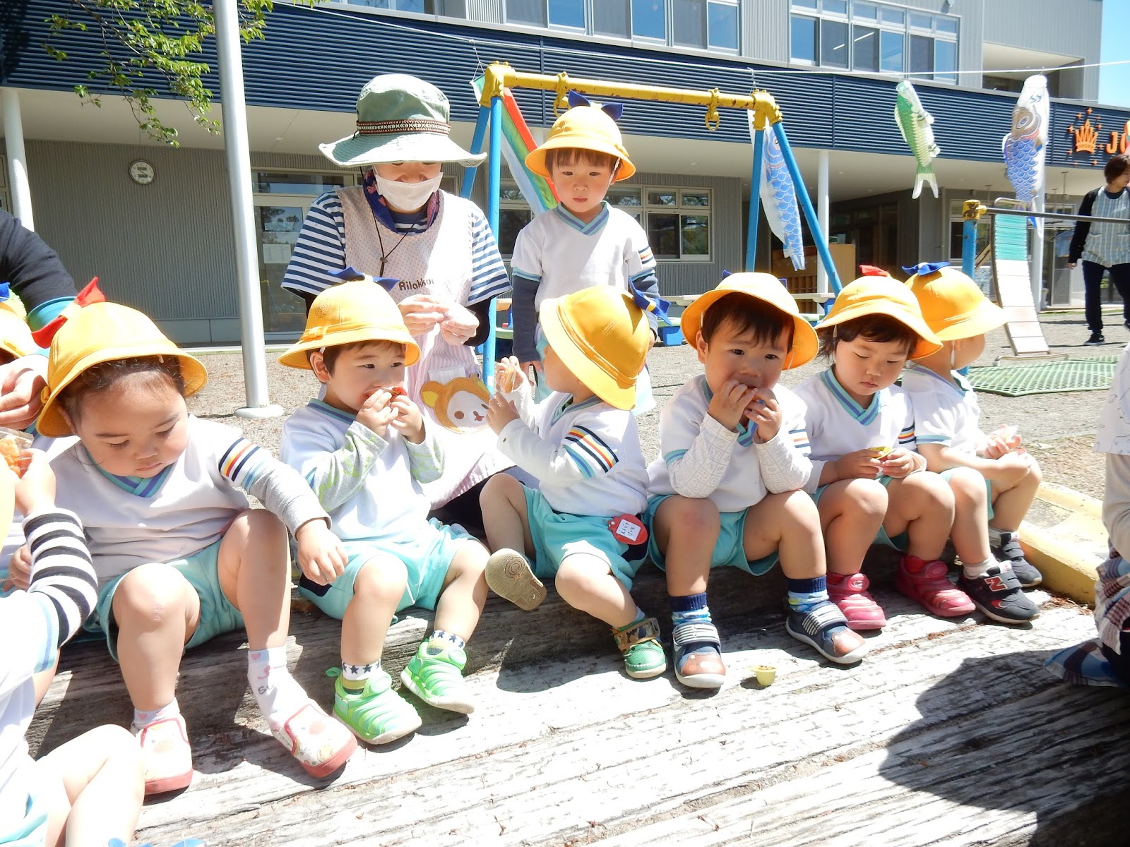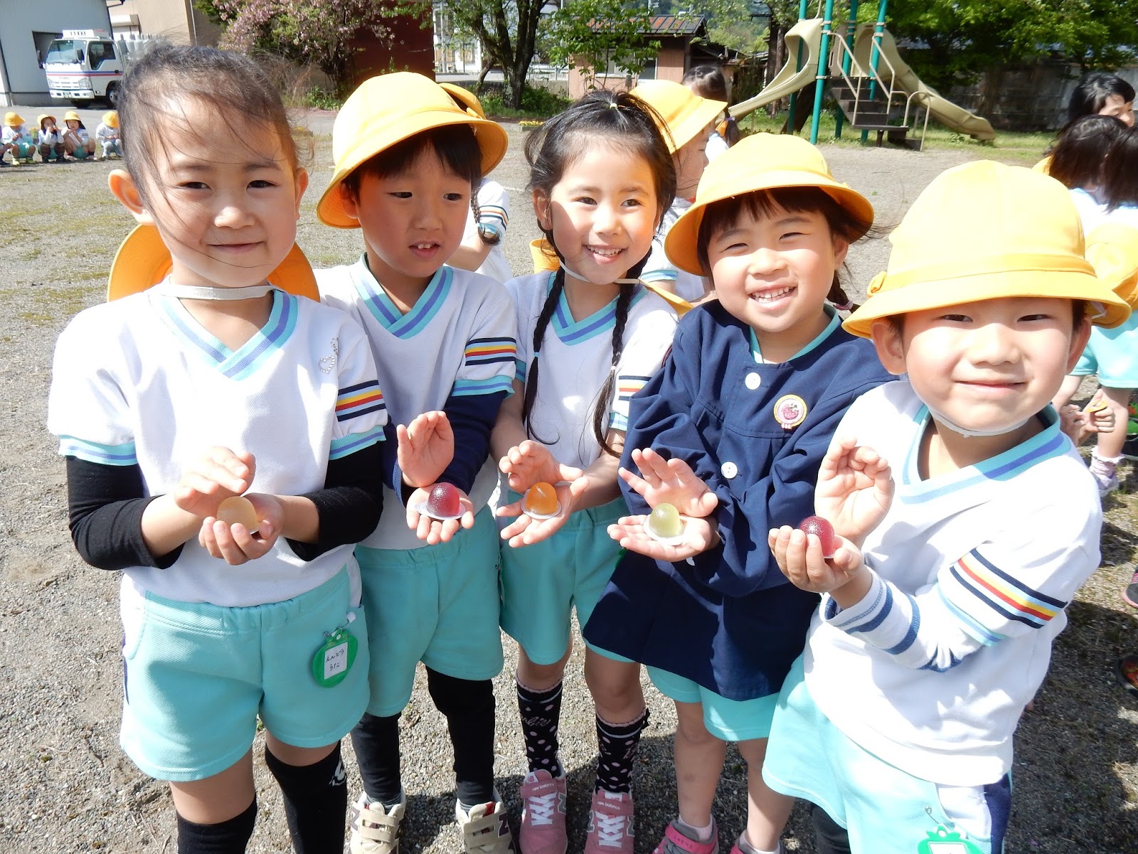 そして、みんなの笑顔がもう1段階キラキラしたのは、カードと交換にゼリーやお菓子がもらえたとき♪やった~!!!と、お外の気持ちいい風の中でエネルギー補給。このあと、給食までは、目一杯、お外で遊びましたよ!