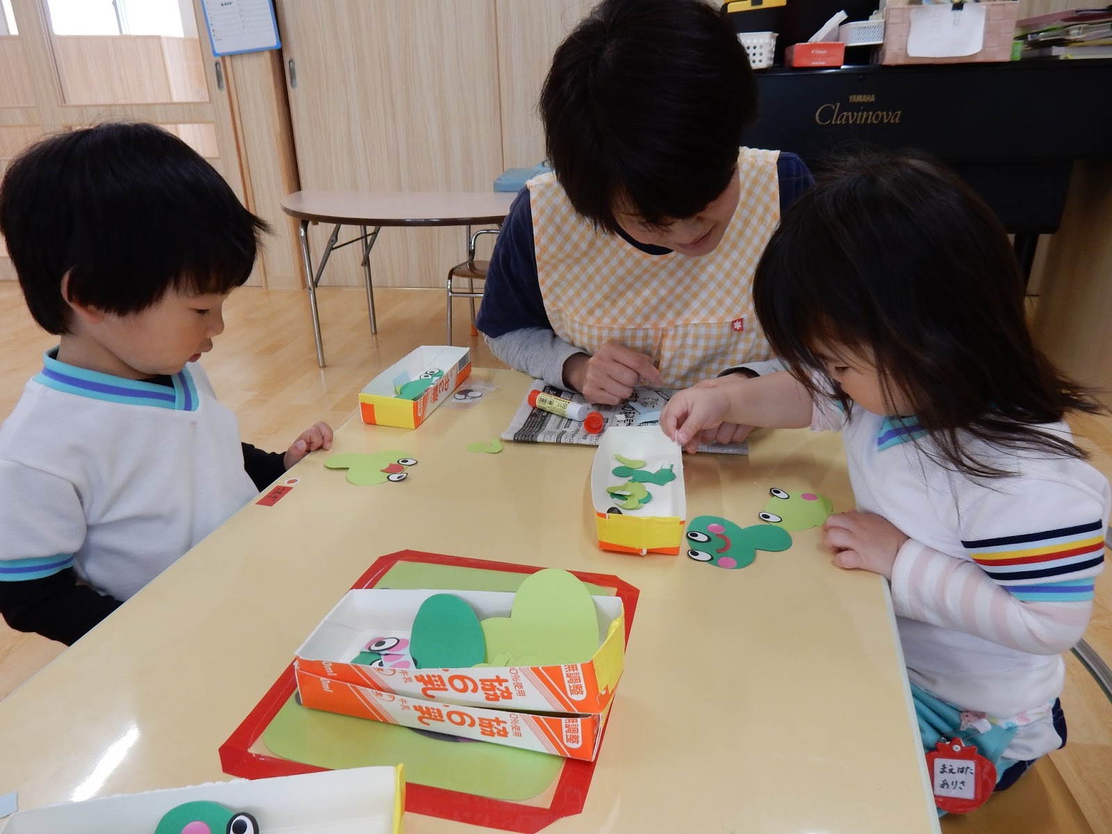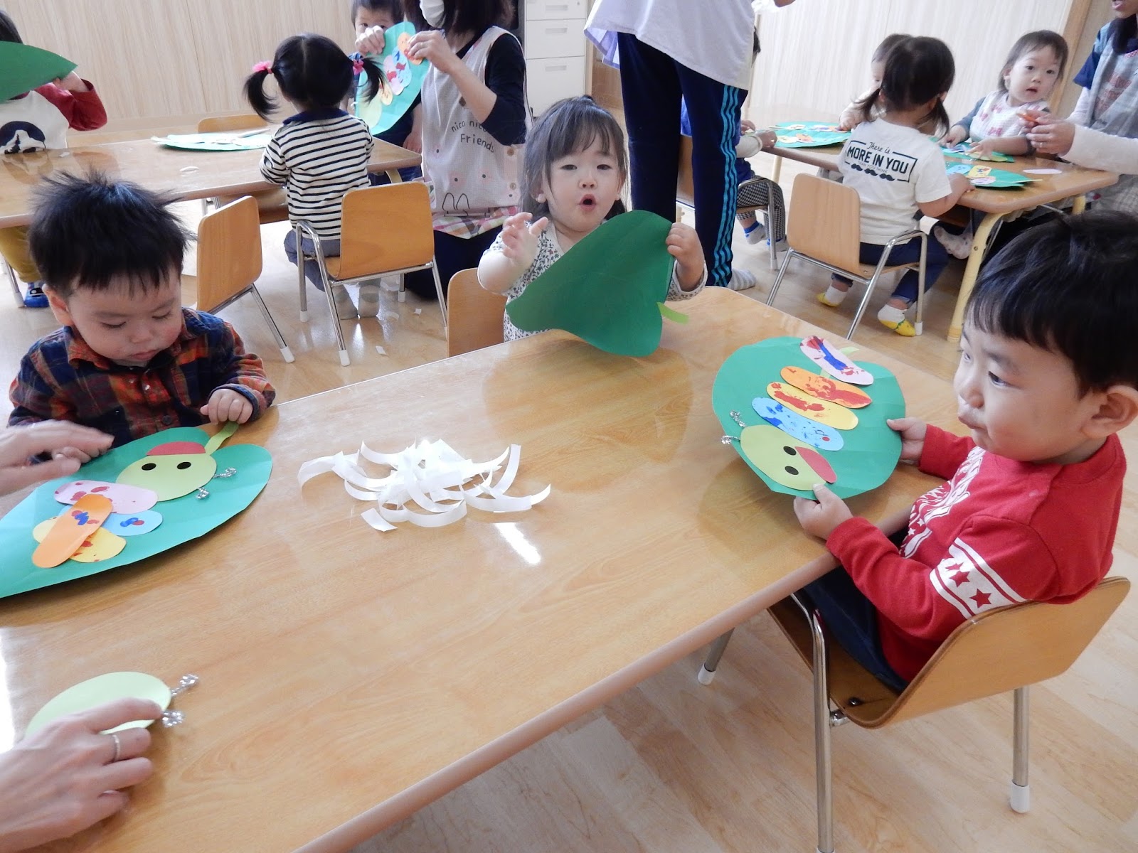 すみれさんと、ひよこさんはそれぞれお部屋で製作あそび。すみれさんは、カエル。ひよこさんは葉っぱの上にアオムシをつくりました。シールをはがしたり、ペタッと貼りつけたり。みんな真剣な表情ですね!子ども達の作品は、大人では考え付かないところに目が合って、口があって(笑)でも、どの表情もかわいらしくて、またこの年齢らしさが出ています。とってもかわいい作品に、子ども達も満足そうでしたよ!