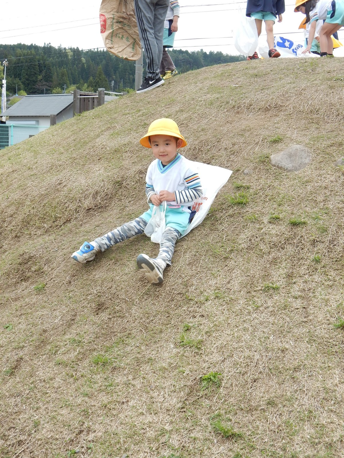 早速すべろうとしましたが、最初はなかなかコツがつかめなかったのと、芝が生えそろっていなかったこともあり、足で一生懸命こいで降りる感じ(汗)でも、上手に滑る子は、体重を後ろにかけてみるなど工夫をして、早く滑れるようにもなっていました!