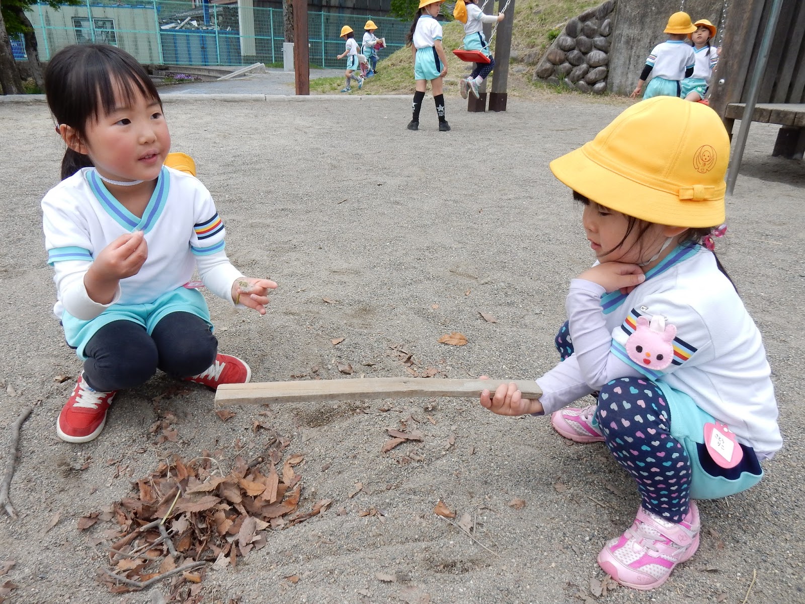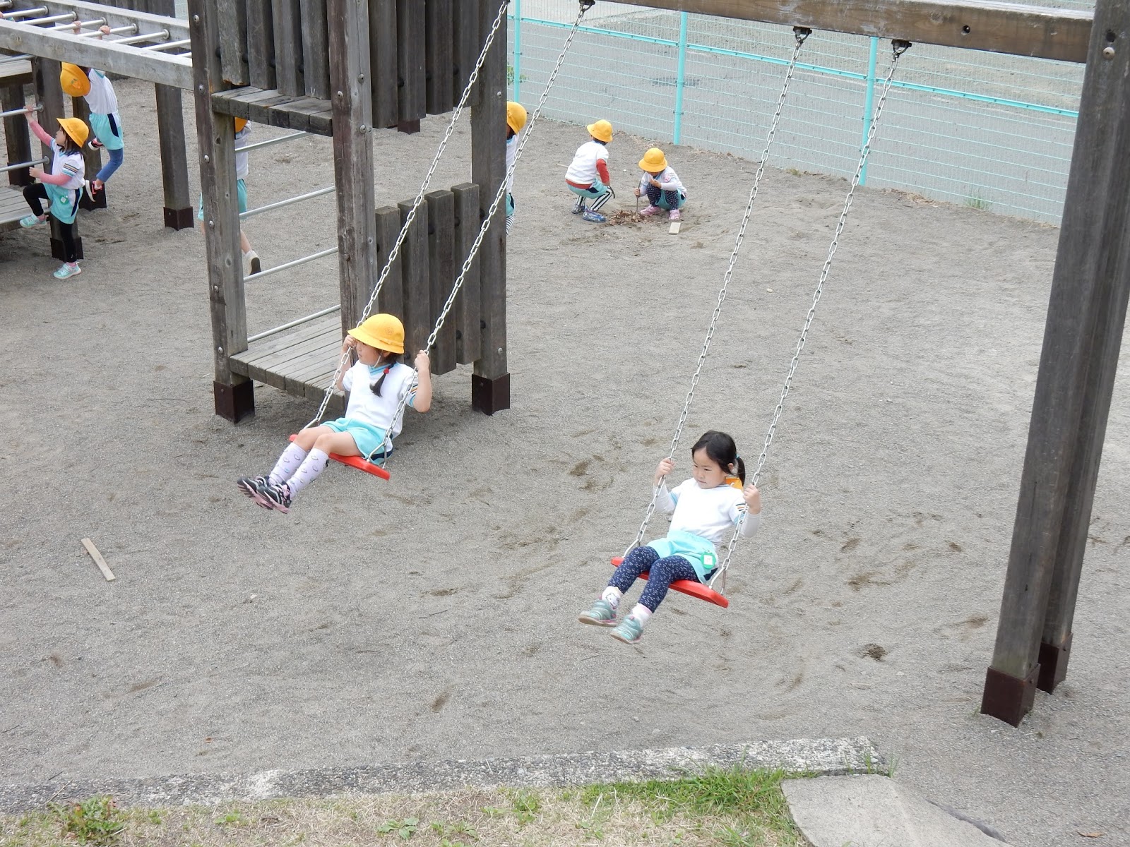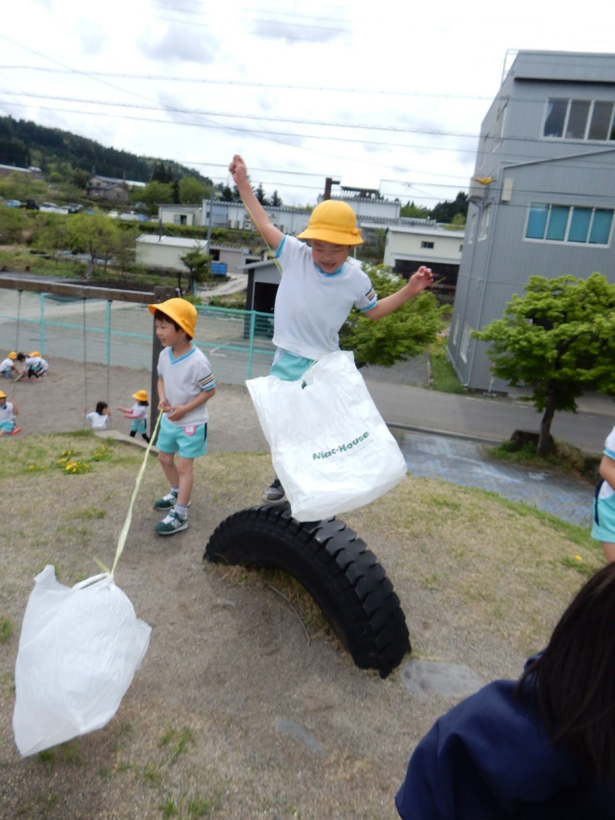 遊具は、髙さもあって、ちょっぴり怖かったみたいですが、それでも登ってみたり、おサルさんのようにうんていで遊んだり。ビニール袋にひもをつけて、思い切り走ると、凧揚げのように風を受けてフワフワ浮かんでいてくれました。バスがお迎えに来るまでの間、たくさん遊びましたよ!