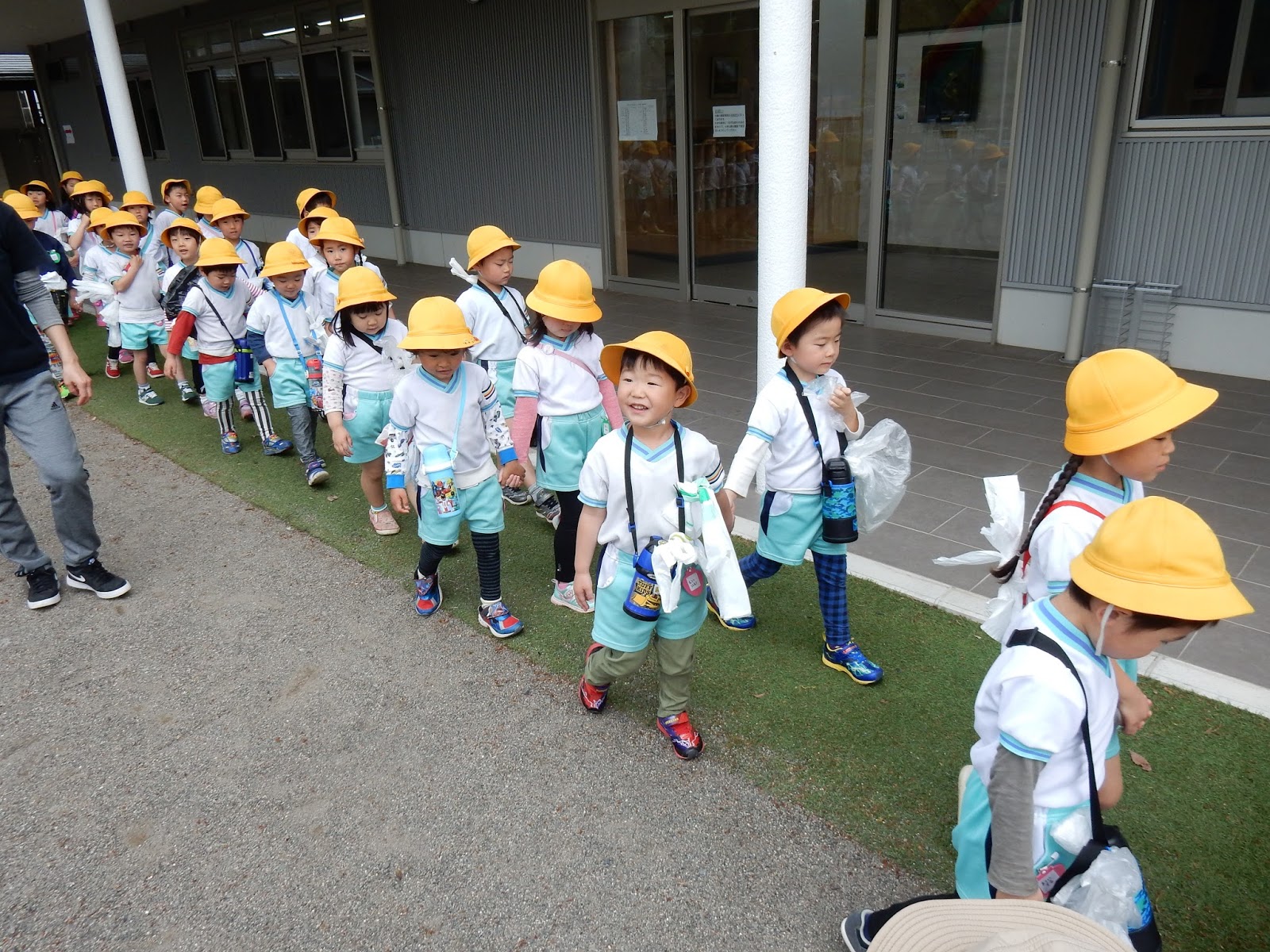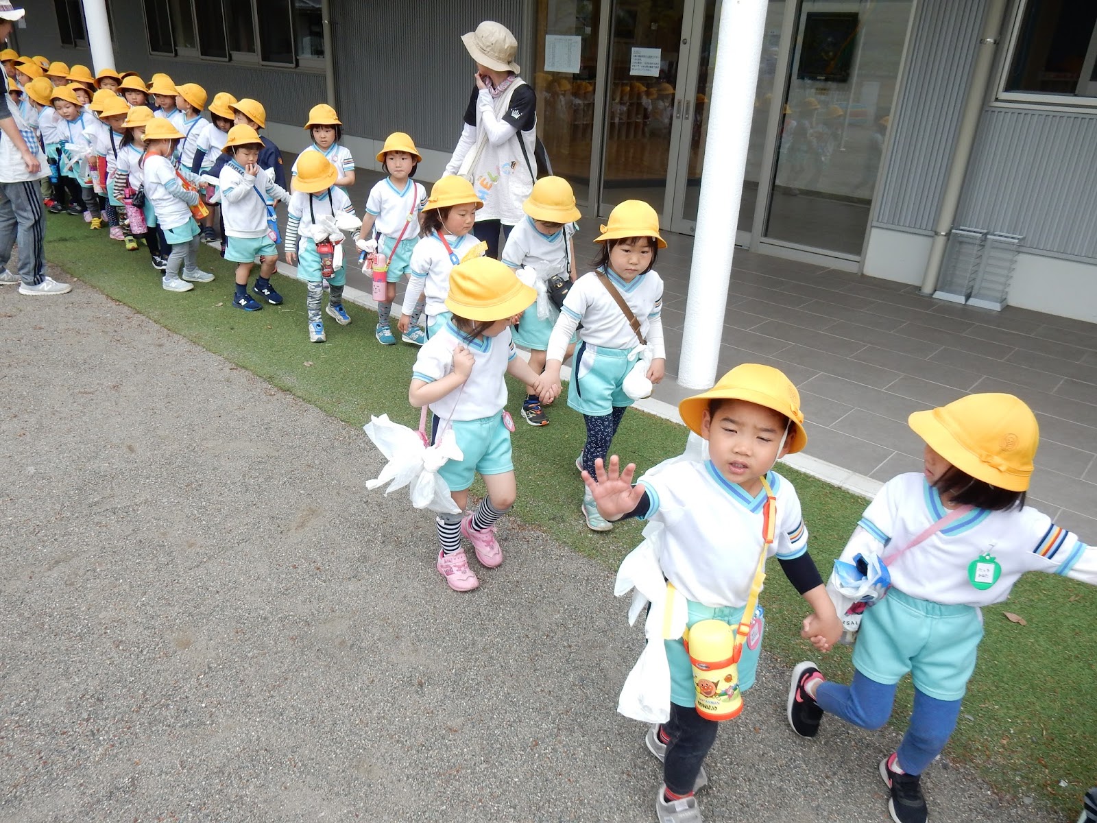 いってきまーす!!!と元気に出かけて行ったゆりさんと、ひまわりさん。今日は、大島のちびっこ広場まで2クラス仲良くお出かけです!水筒と、芝滑り用のビニール袋を持って出発です!