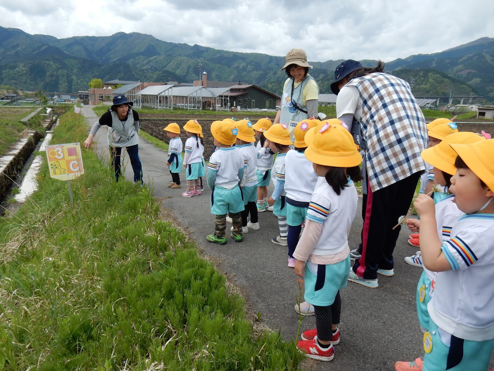 たんぽぽさんも、初めての園外お散歩。お友達と、手をつないで、並んで歩こうね!とお約束をしてから農道に出発です。タンポポの花を見つけたり、ちょうちょを指さしたり。思わずわたげをとるために脱線してしまうあたりは、たんぽぽさんらしいですね。