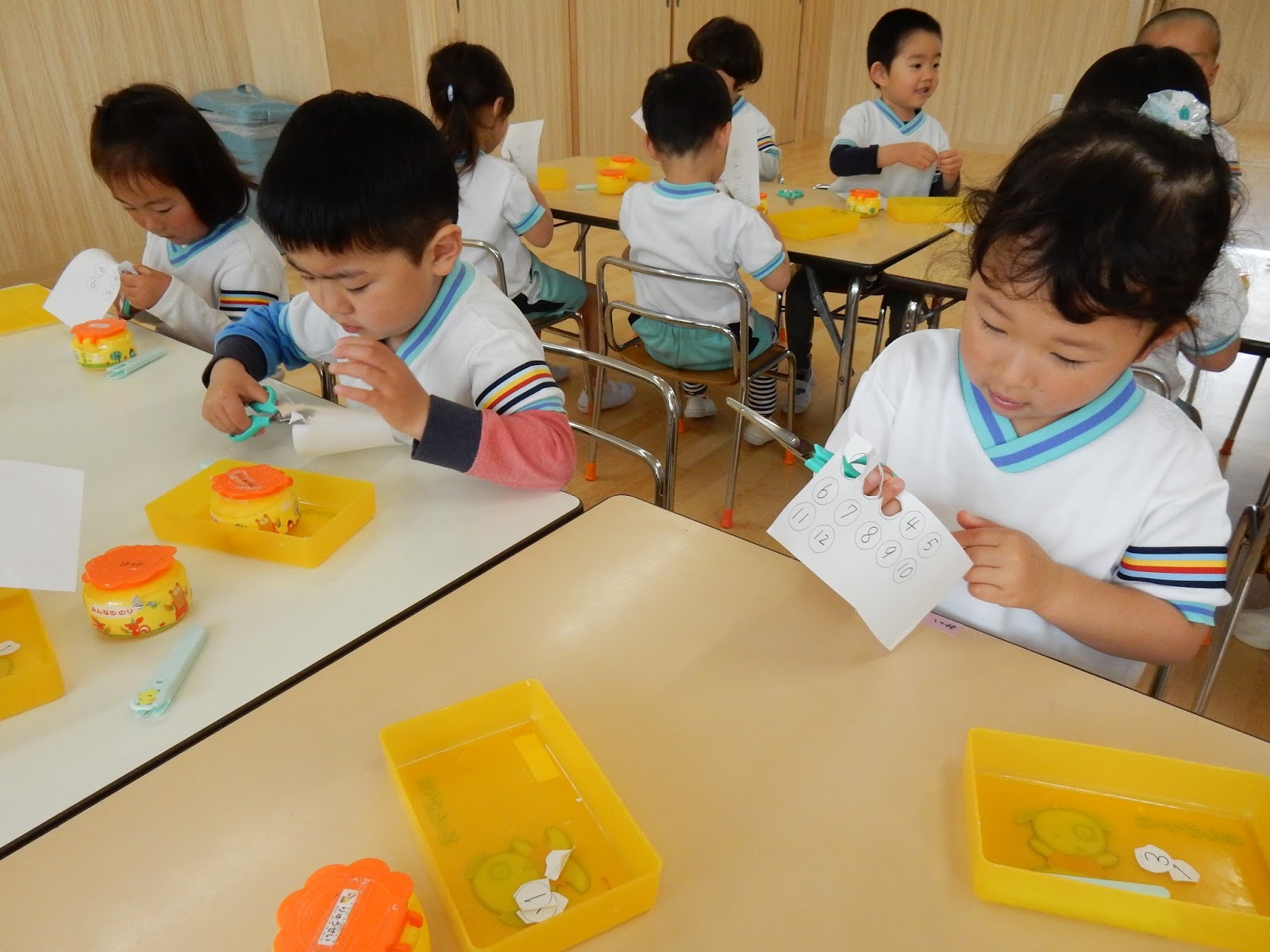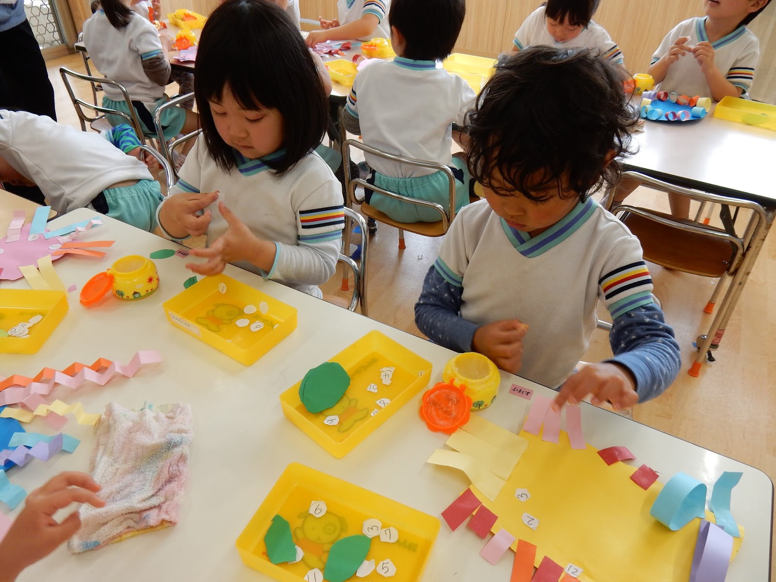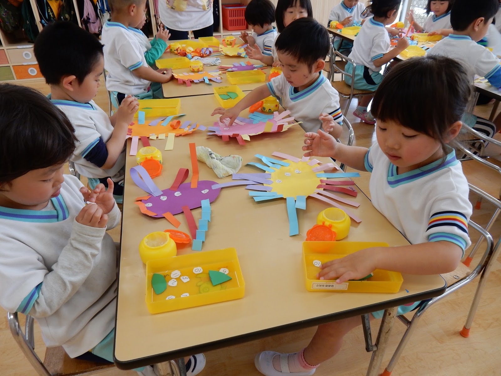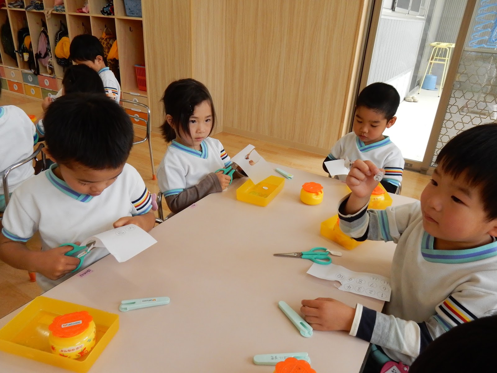 ゆりさんは、細かい12までの数字が書かれた紙を切って、それをお花に貼りつけて。みんなチラリとお部屋にかけてある時計を見ながら『1,2,3・・・』とブツブツ独り言(笑)みんなでオリジナルの時計を作っているんです。6月には時の記念日があるので、時計の読み方や、時間の大切さなんかもお話をしてもらったのかな。ちょっといびつな文字盤ですが、みんなが一生懸命貼りつけたのが伝わってきます!