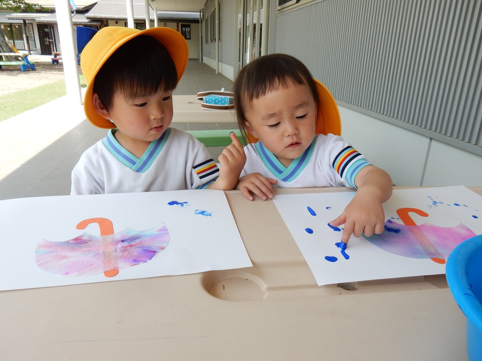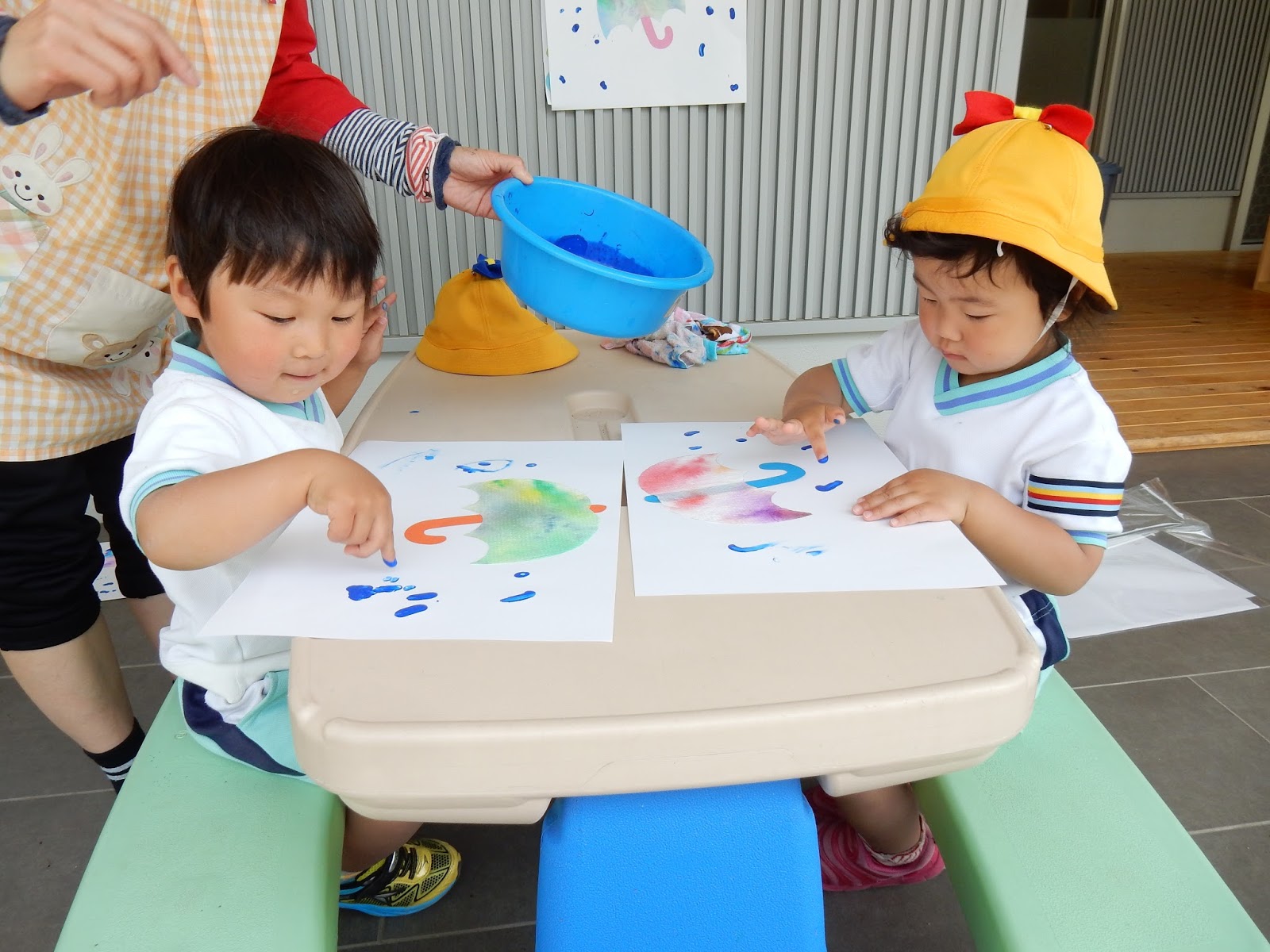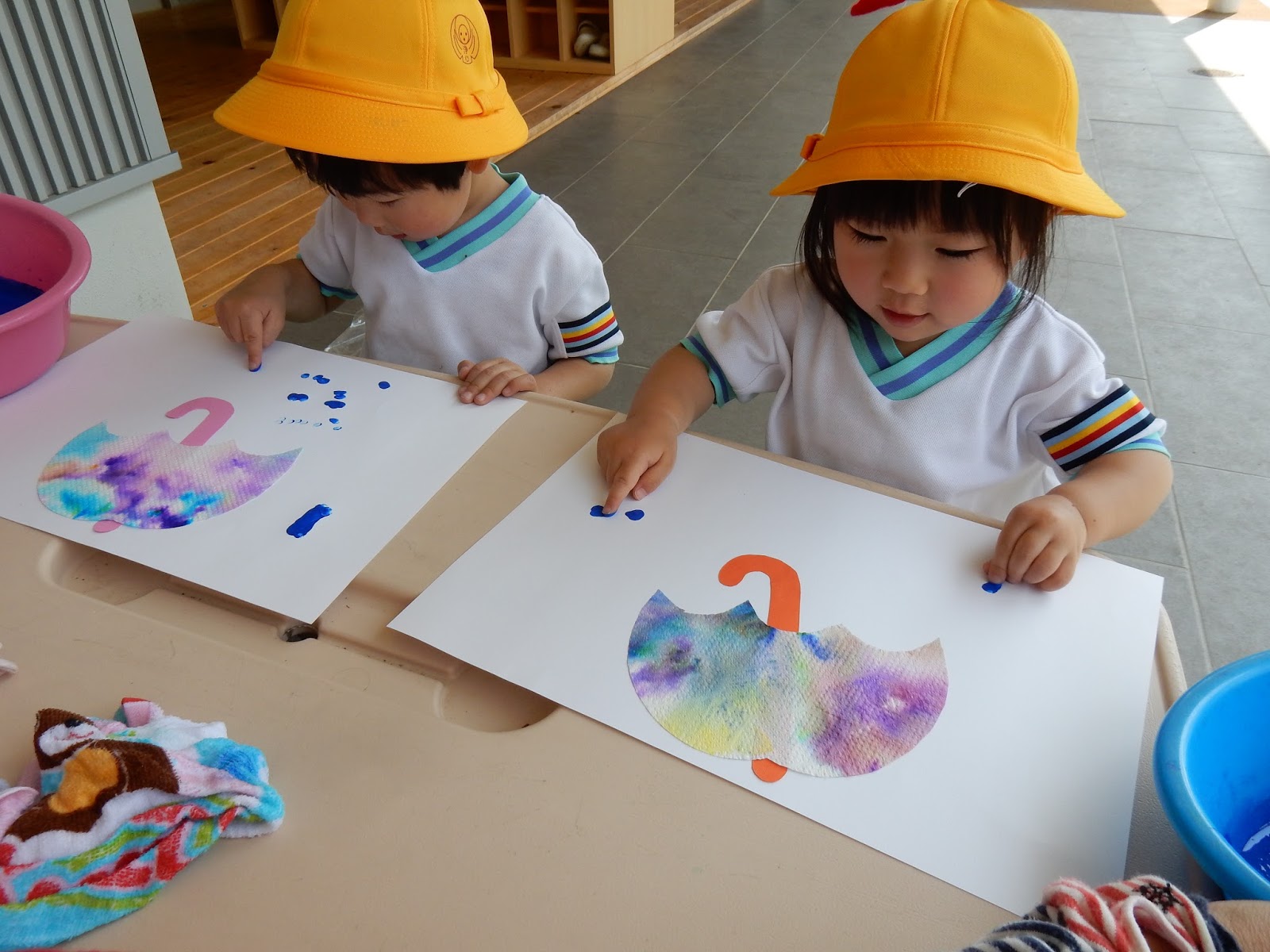 すみれさんはお外で遊びながら順番に製作。外で絵の具あそびをするのも新鮮ですね!先日作った傘に、雨を降らせましたよ~!ポツポツ指で描いたり、ざーざーと長めに描いたりと、いろんな雨模様が完成しましたよ!
