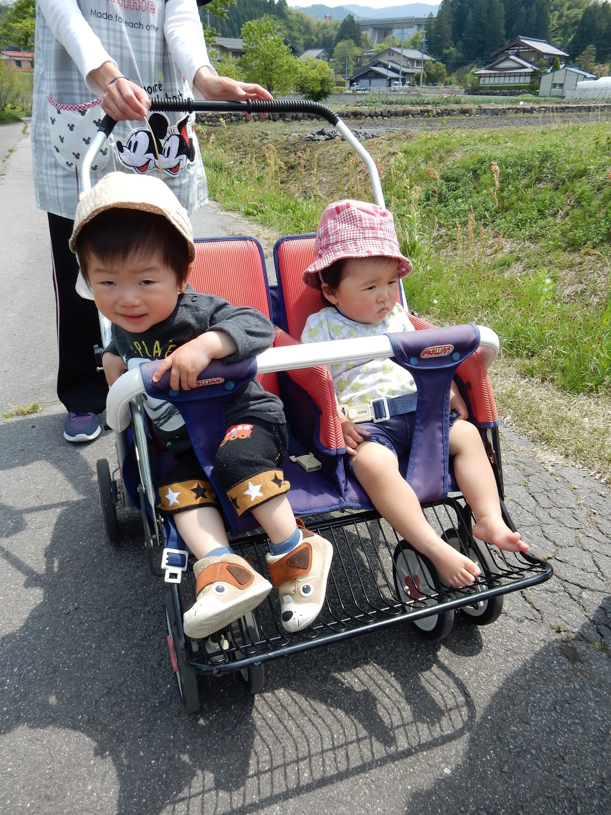 お散歩に出かけたひよこさん。たんぽぽの綿毛を手に持たせてもらって『ふー!!!』口に近づけすぎて綿毛がお顔についていたり(笑)とっても長い草を持って(持たされて!?)ツンツンしてみたり。田んぼにはカエルもいたみたいですよ!発見がたくさんあるお散歩♪楽しそうですね!