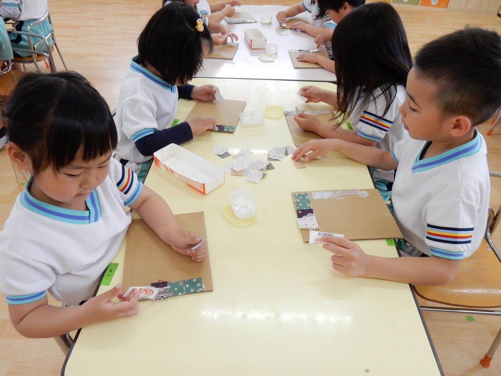 段ボールに布を貼って飾り付け。ボンドをぬる時には、牛乳パックを切って作ったヘラが活躍します!手があまり汚れなくて済みました!『すき間があってもいいよ~』と、ダンボールの感じを少し残してもかわいいね♡という先生の言葉でしたが、性格!?みんなきっちり布を並べてすき間がないように貼ってくれたみたい(笑)もちろん、たくさん用意してもらっていた布はあっという間になくなり(汗)明日続きをやるそうです♪