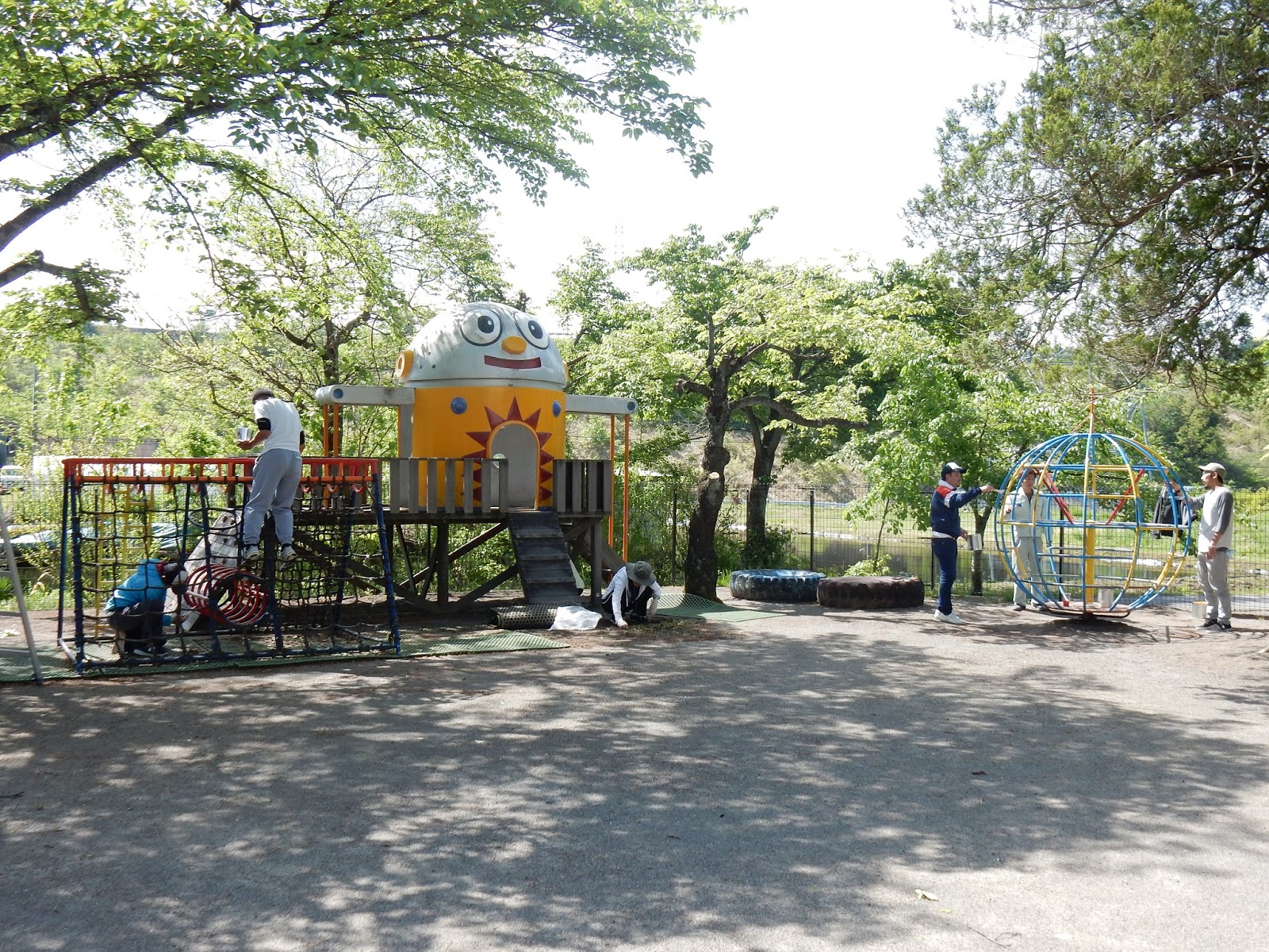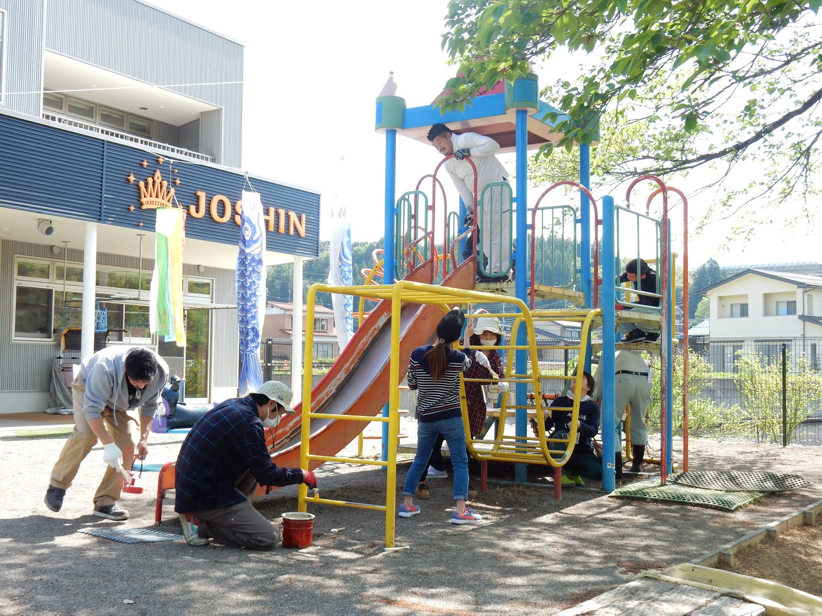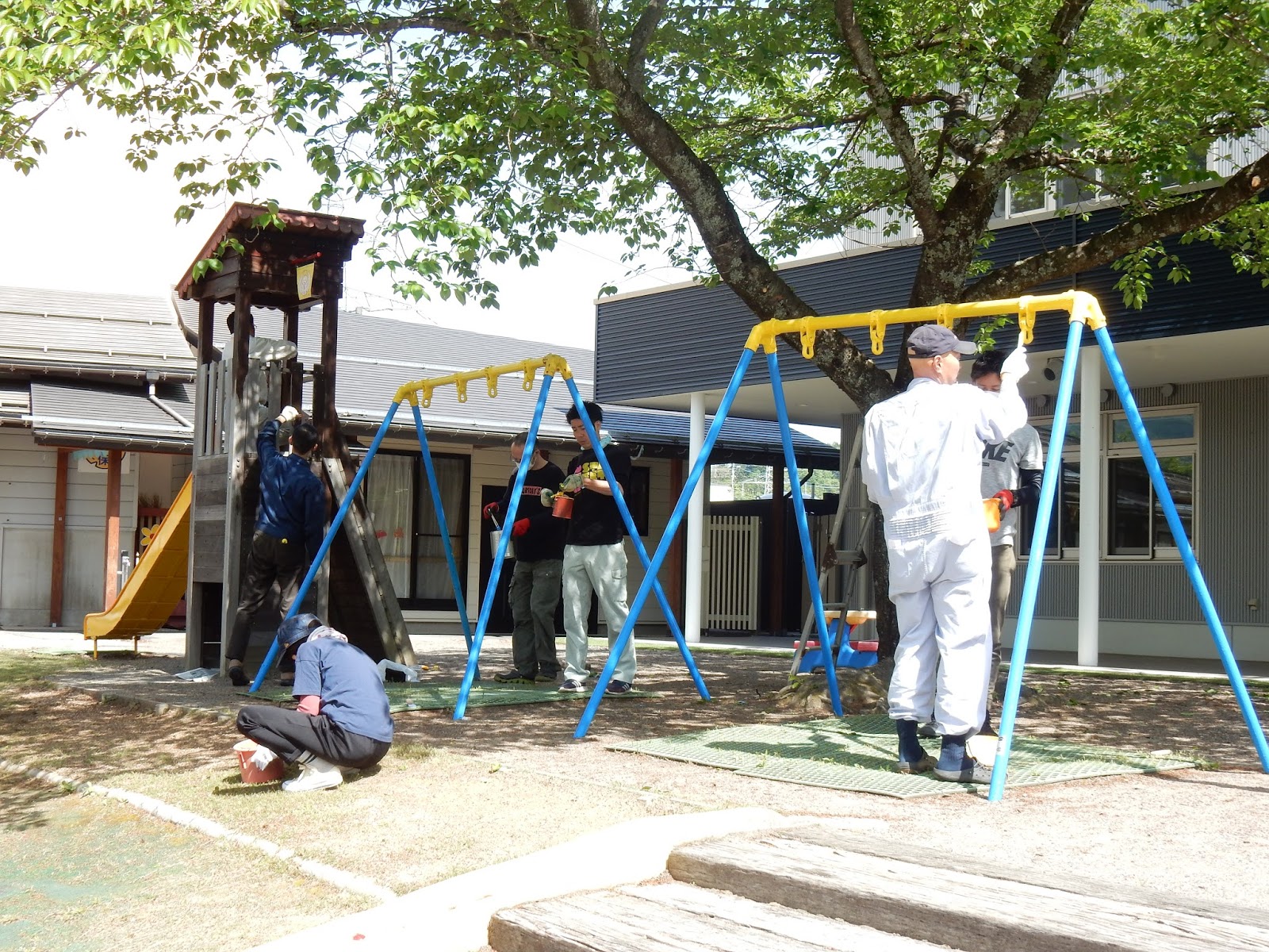 プールの設営から、園庭遊具のペンキ塗り、さくらの木の間伐や、砂場の日よけ、畑の整備など、園内でのお仕事の他にも、油坂桜パークでは植樹祭に向けて草刈りをしていただいたりと、みなさんの力を借りて、普段できないことをやっていただくことができました。本当に、ありがとうございました!あす以降、またこの整った保育環境のなか、子ども達はのびのびと遊べることと思います。