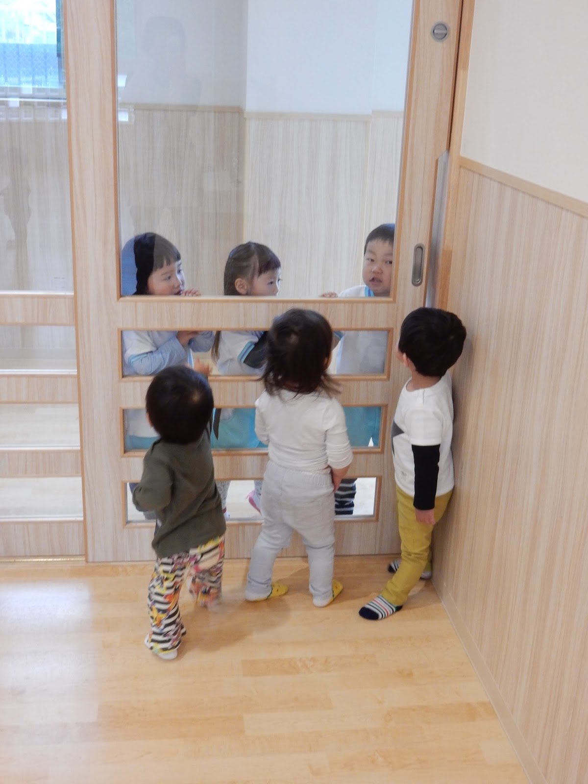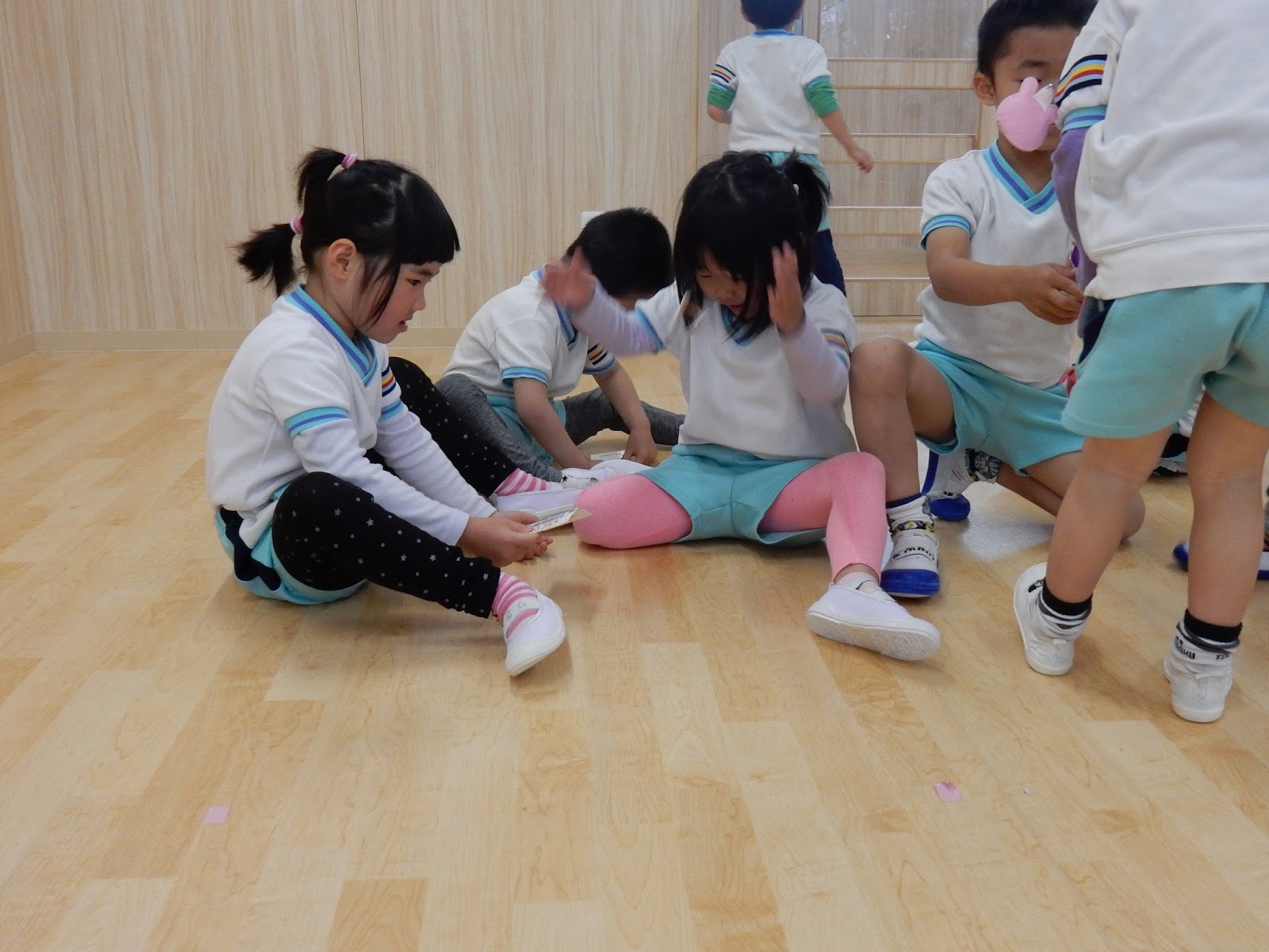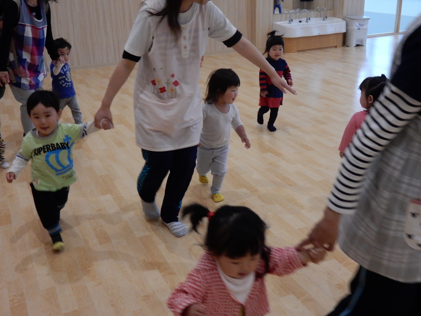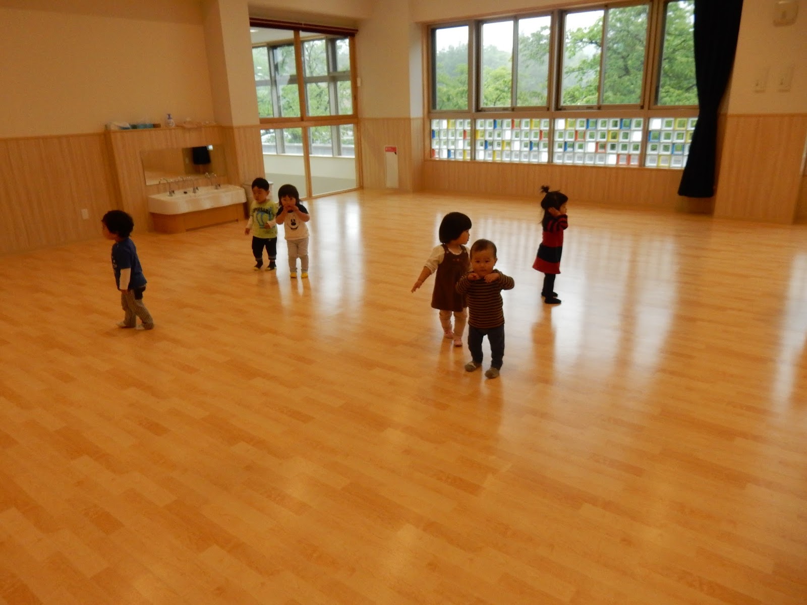 あいにくのお天気だったので、ひよこさんはホールでたくさん音楽をかけて体を動かして遊んでいましたよ!『おおかみさ~ん!!』と音楽に合わせて呼ぶと...どんどんどん!!!!おおかみさんがみんなを食べにやってきました!!『キャー!!!』と一生懸命逃げたり、おおかみ役のあやか先生に抱き着いて行ったり(笑)楽しそうな声に、たんぽぽさんも、ホールの入り口からのぞいていましたよ!