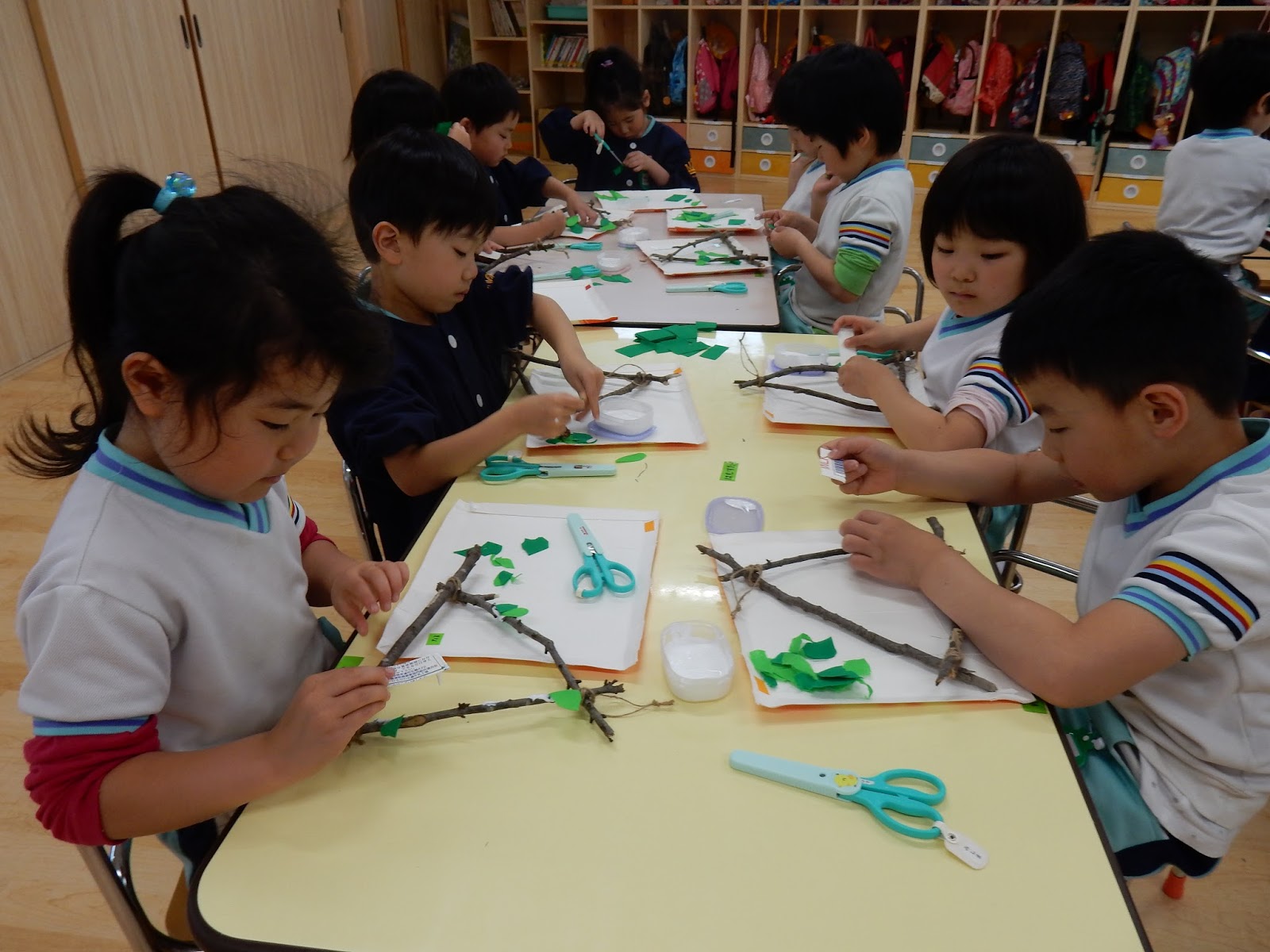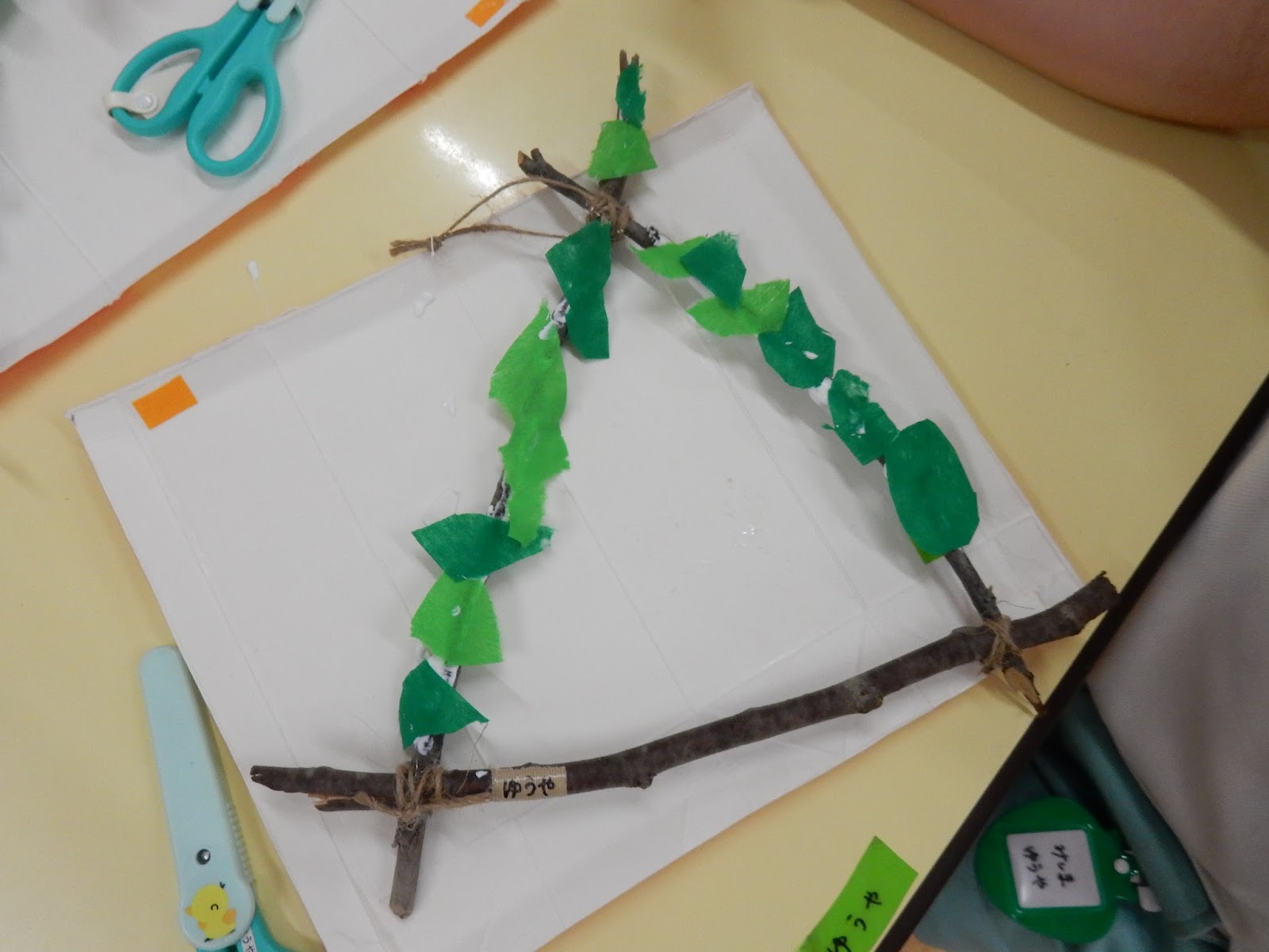 桜の木の枝を組んだものに、今日は不織布で葉っぱを付けました。切るのに少し苦戦していましたが、みんなの小鳥たちが喜びそうな、素敵な土台が出来あがりましたよ!小鳥と組み合わせるのが楽しみです。
