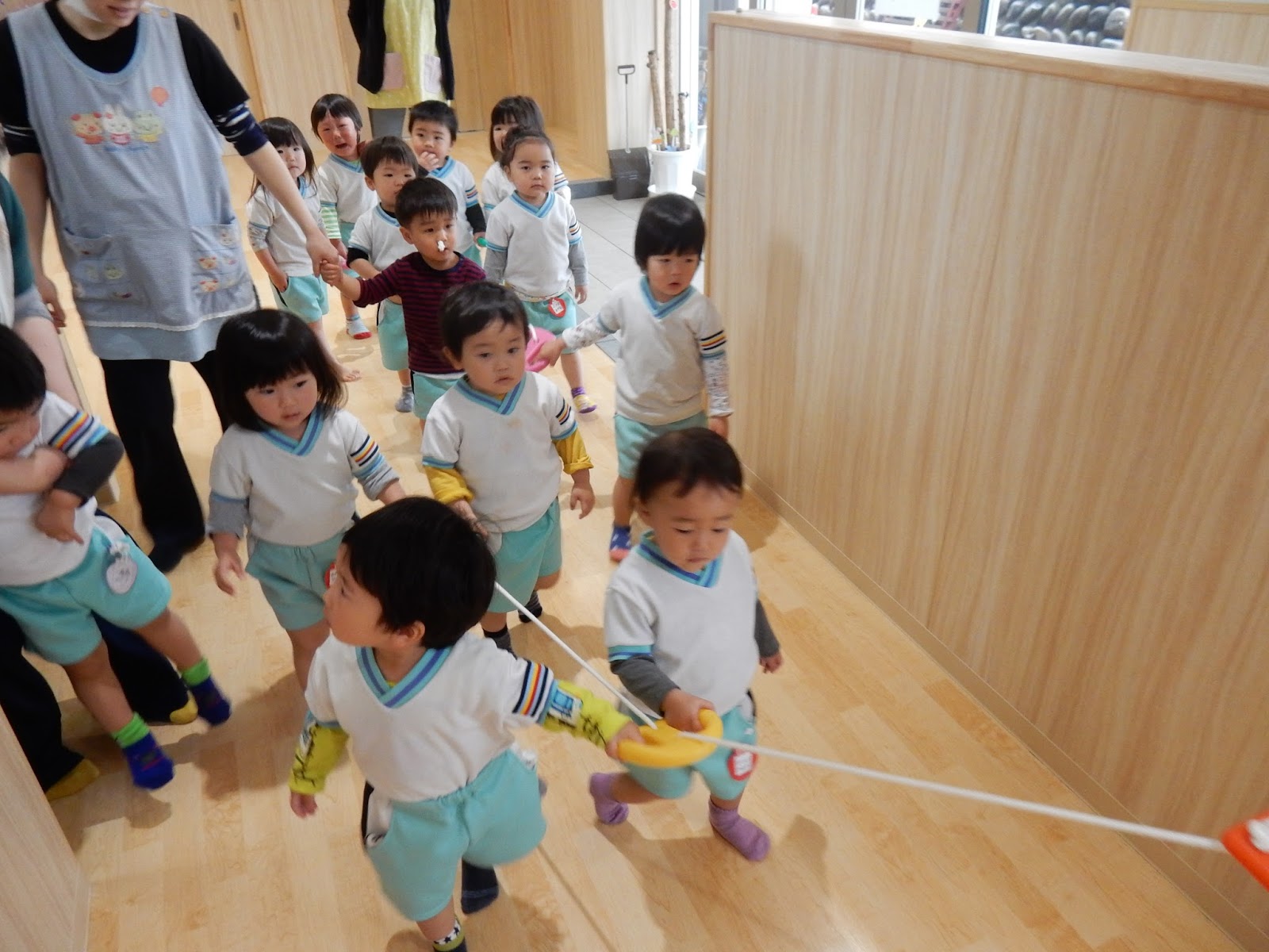 すみれさんは、新しく届いた“お散歩ひも”をもって、園内をぐるり。上手ににぎって歩いて行くすみれさん。今までは、みんなで電車ごっこをして移動をしていましたが、背中をお友達に持たれるのが苦手な子がいたり、つまづいて前の子にぶつかってしまうこともしばしば。これからは、そんな心配もなさそうですね!お外で実際に使って歩くのが楽しみですね!“すみれさん電車”もとってもかわいらしかったので、たまには見たいな♡
