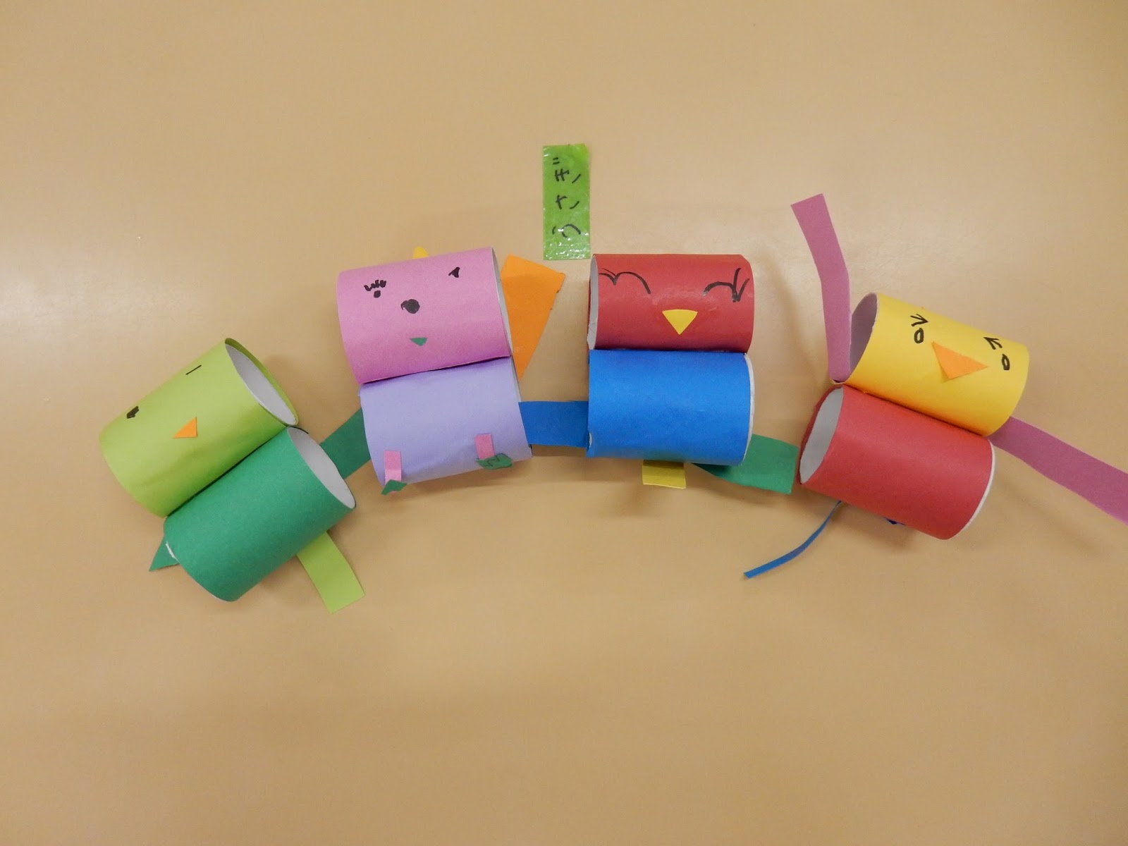 長いお休み明けということもあり、のんびり遊んですごしたたんぽぽさんやゆりさん。レゴブロックや、ぬり絵で遊んだり牛乳パックでピョコン!と飛び跳ねるおもちゃを作りましたよ!写真では、上手く飛び跳ねる所が撮れませんでしたが、床に置いてしばらく待つと...パチン!と跳ね上がる様子にみんなとても嬉しそうでした。