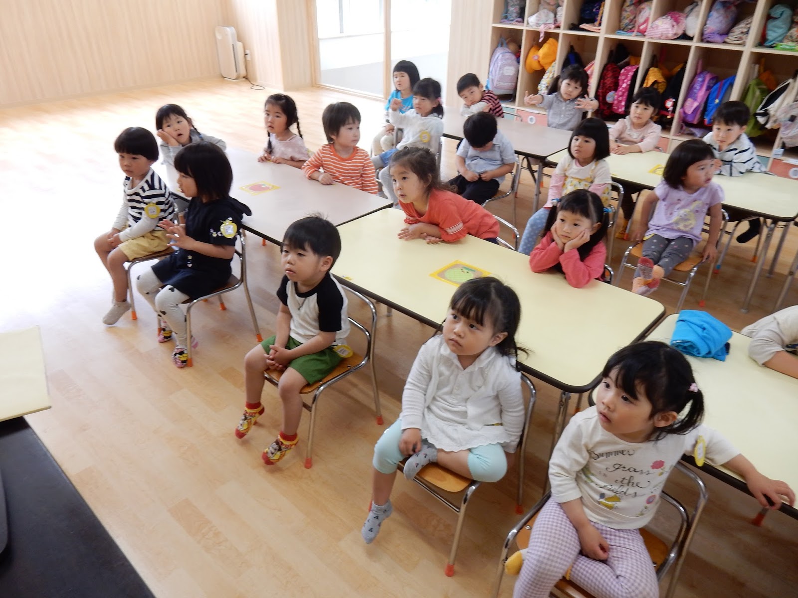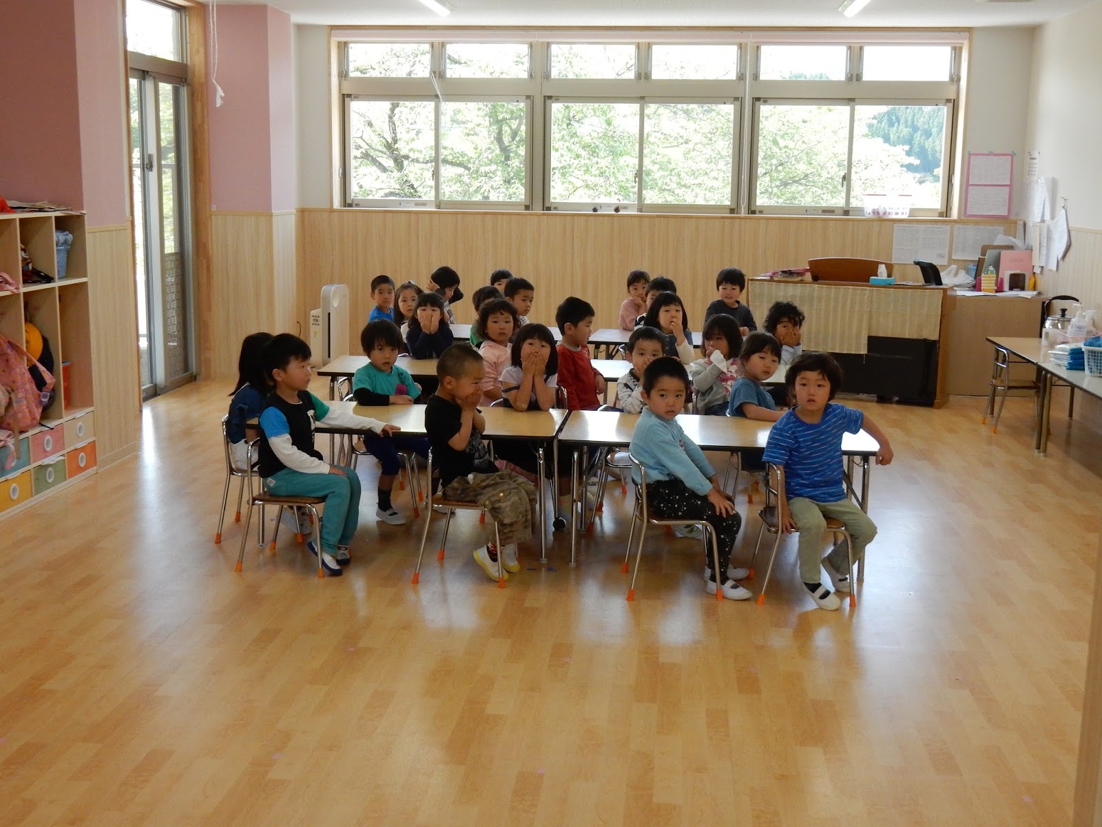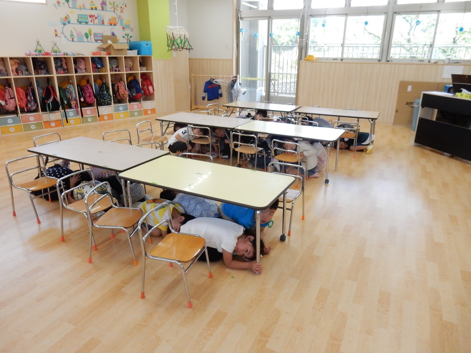 ベルが鳴った瞬間の各クラスの様子です。きょとん…としているすみれさん。たんぽぽさんや、ゆりさん、ひまわりさんは、思わず机の下に隠れて自分を守ろうとしていた子が多かったみたい!煙を吸わないように、口を押えている子もいますね!今までの経験や、お話をしっかりきいていたからこその行動!