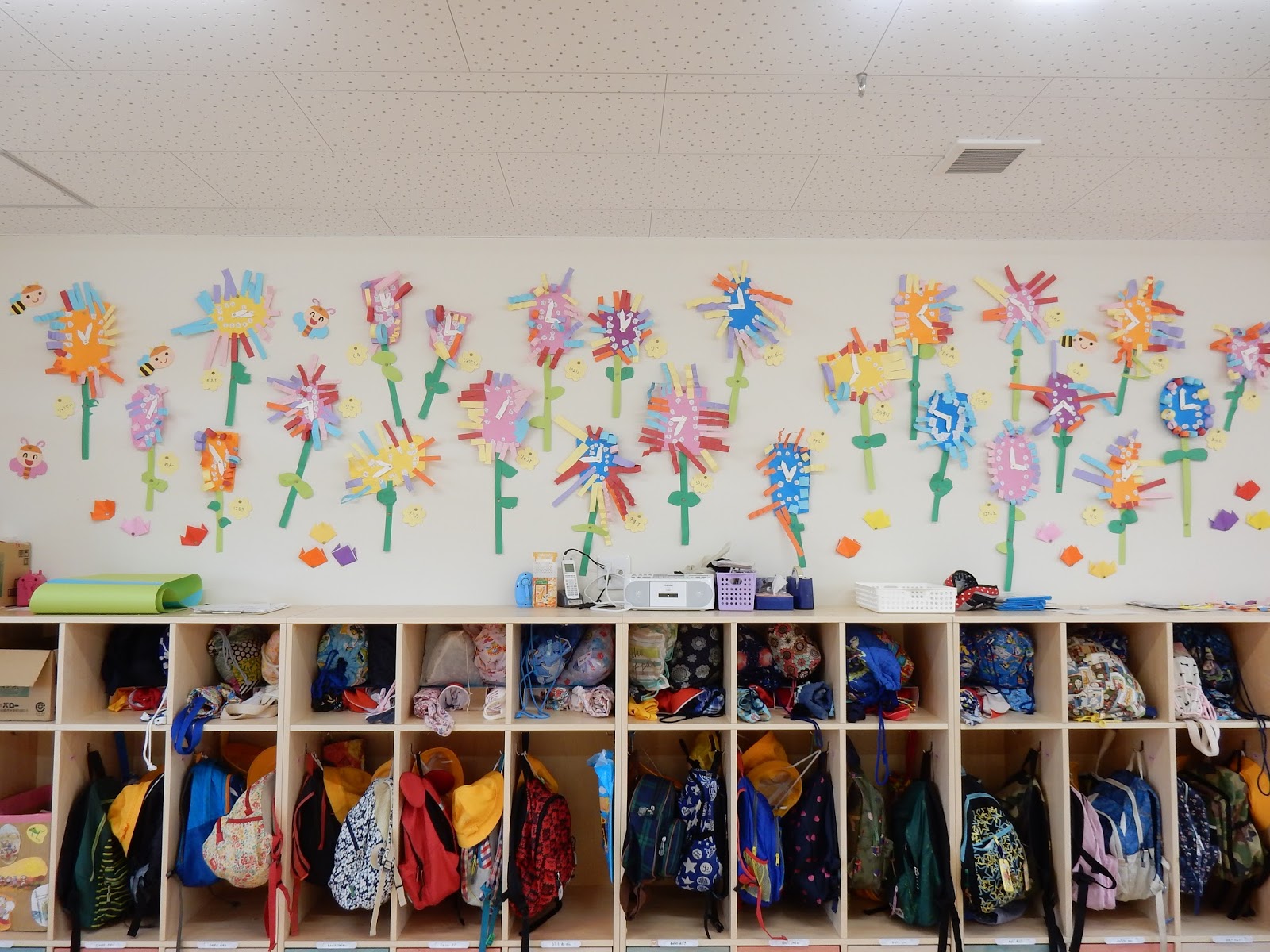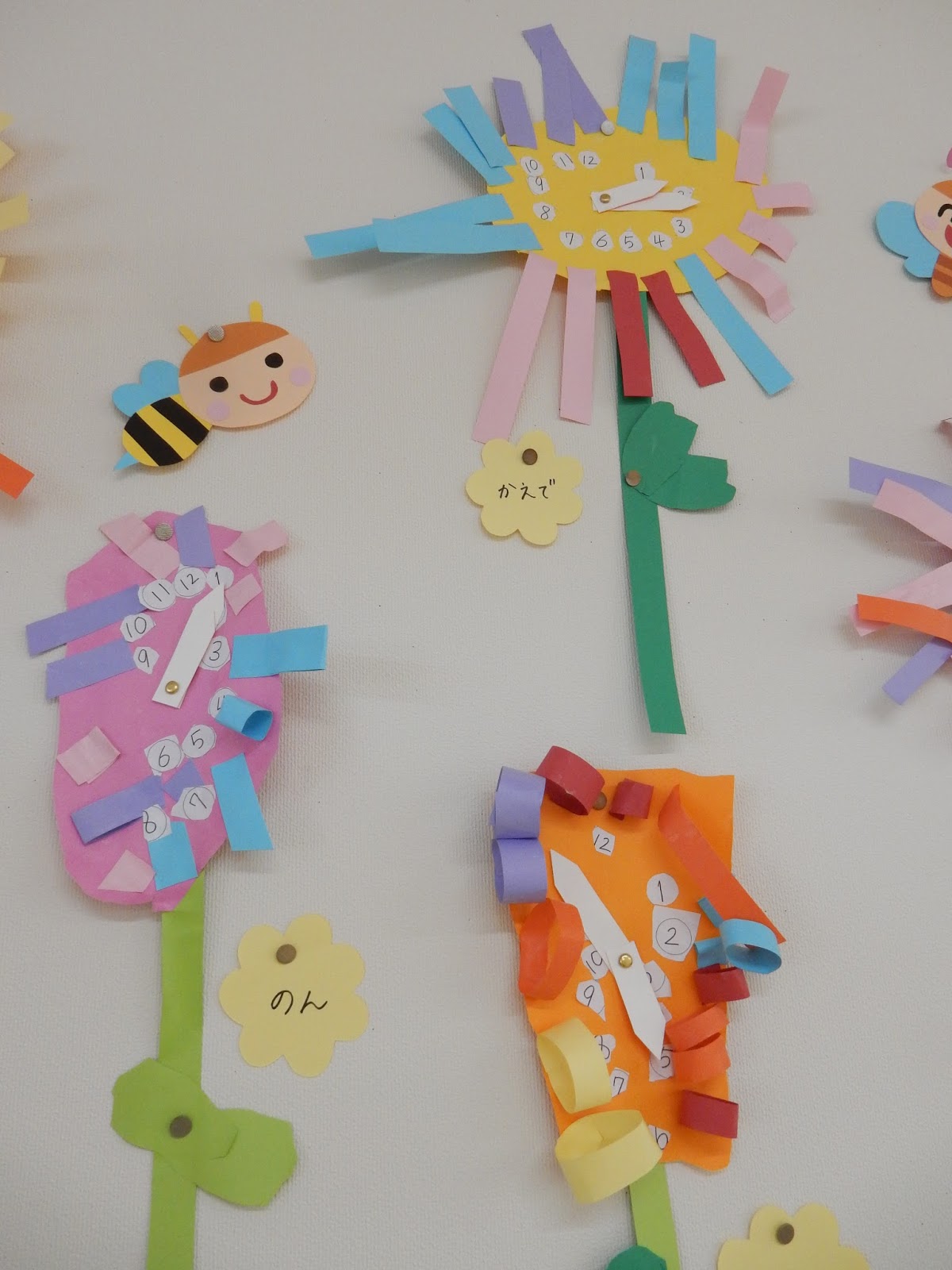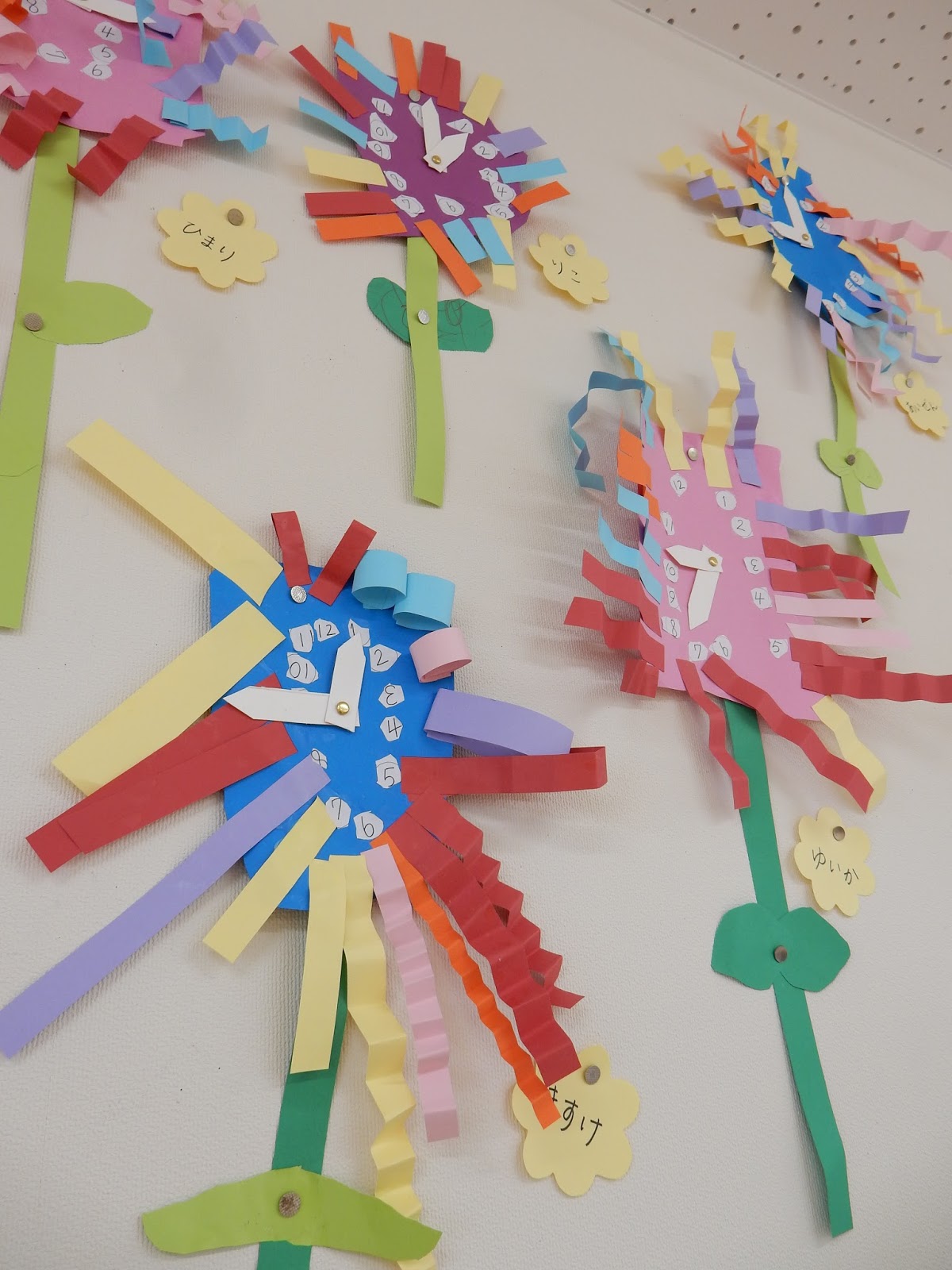 カラフルなお花はゆりさん。よく見ると、時計になっているんですよ!針は動かすことができるので、みんな好きな時間に合わせたみたいですよ!