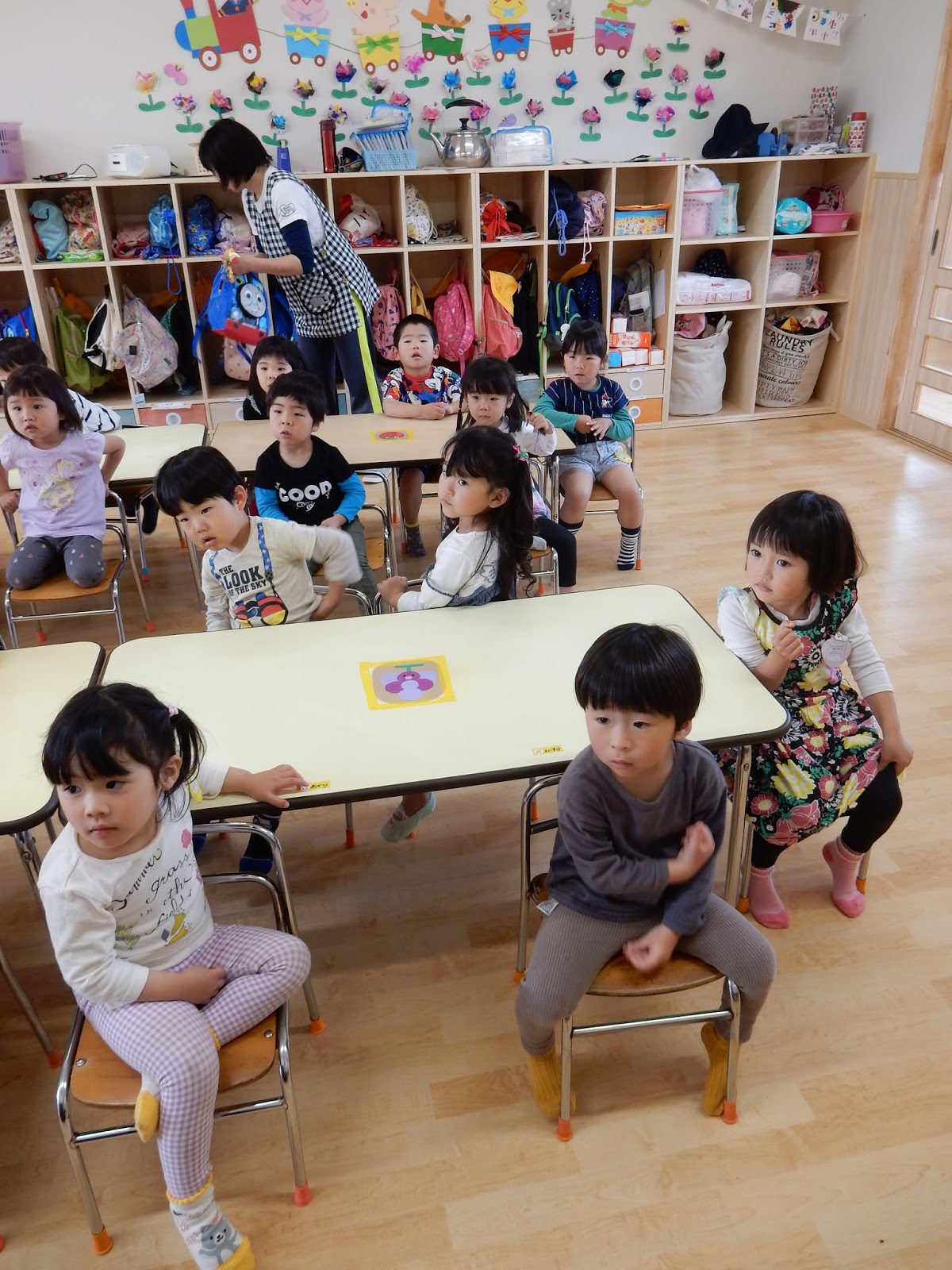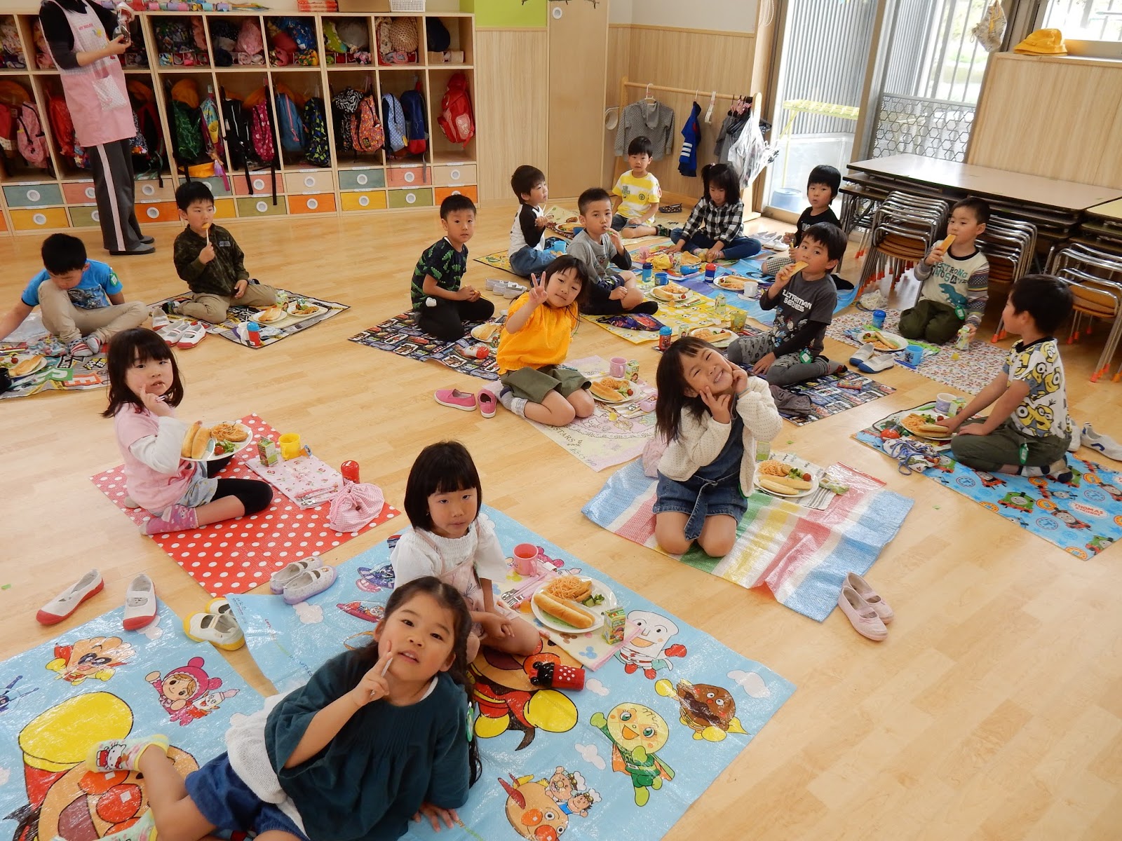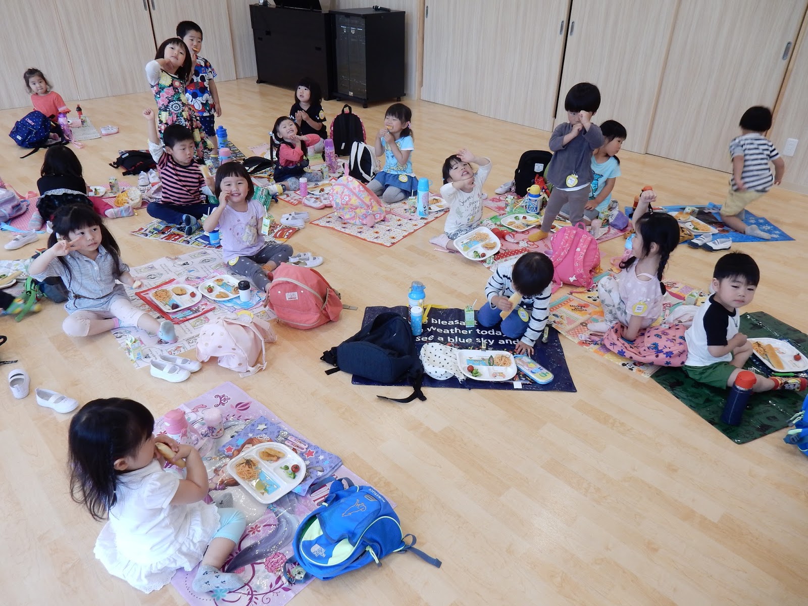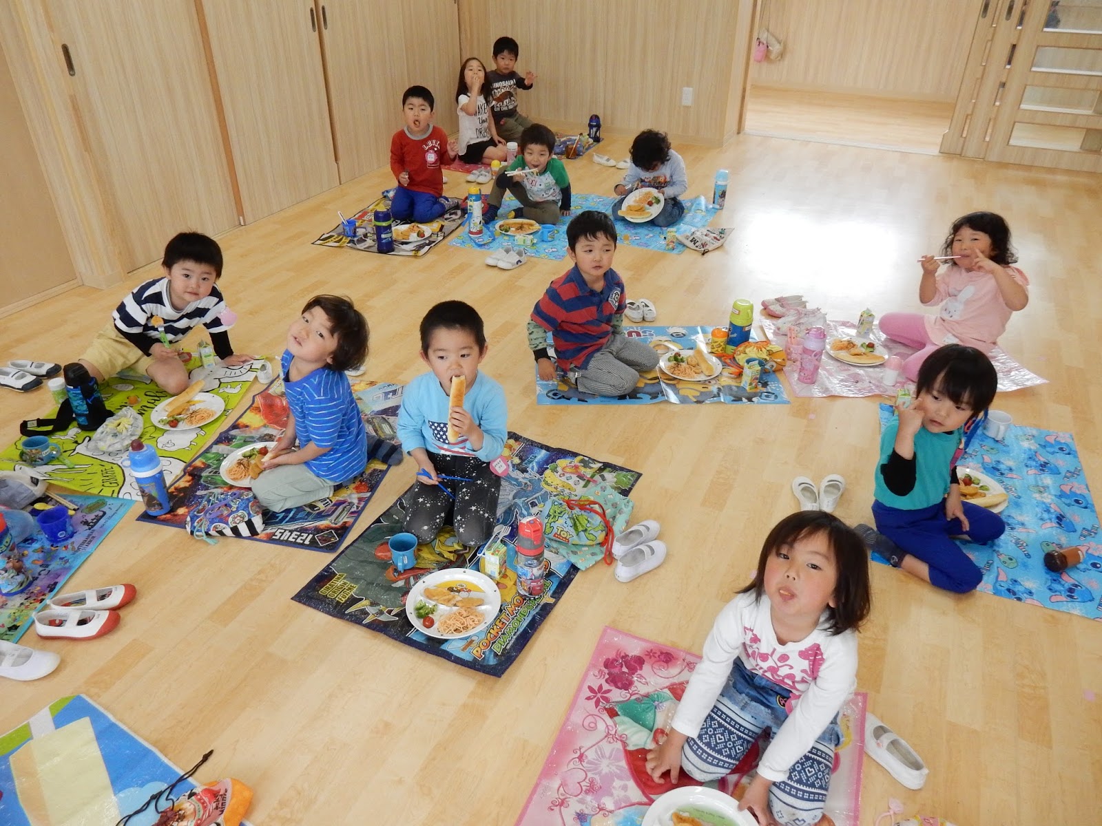 今日は月に1回のわいわいデー♪素敵な服で登園してくれたみんな。今月は、加えて敷物やお手拭もあったので、なおさら朝からみんなのテンションは高め!!お散歩ビンゴは明日行いますが、今日は大きいクラスはそれぞれ敷物を敷いて給食をいただきましたよ!