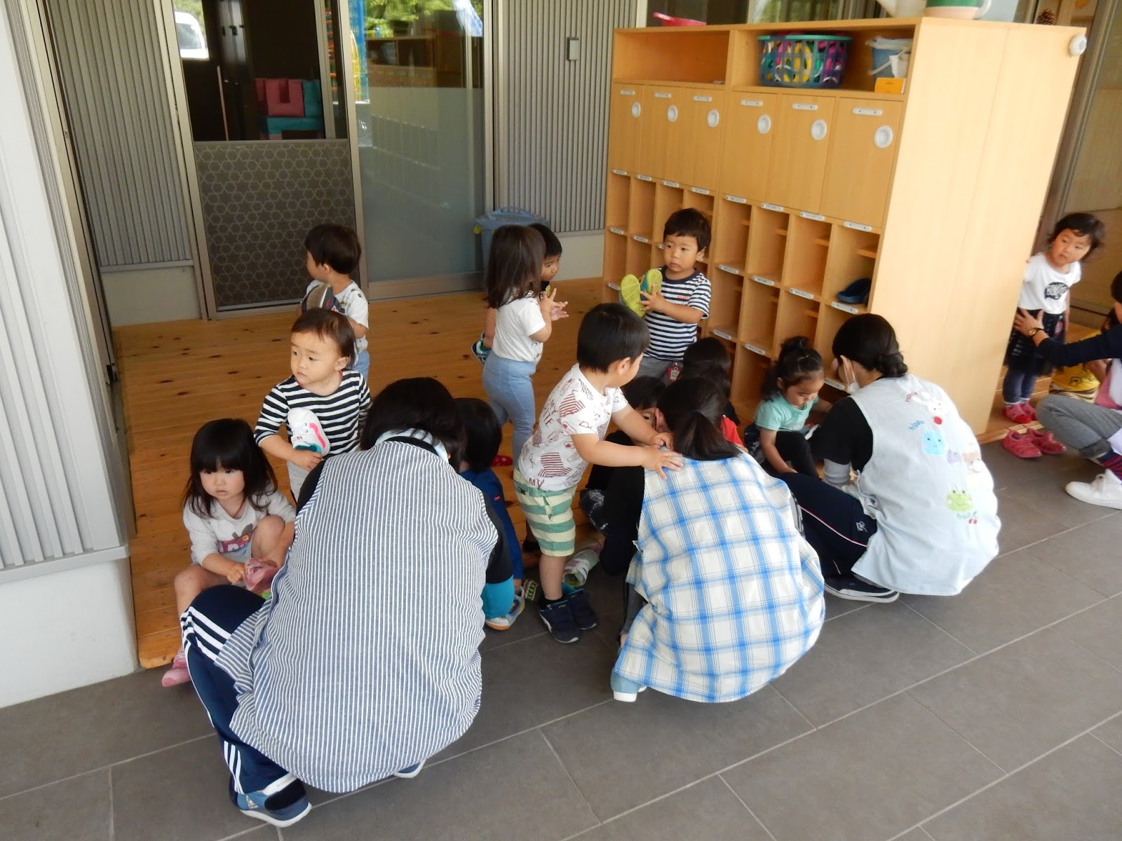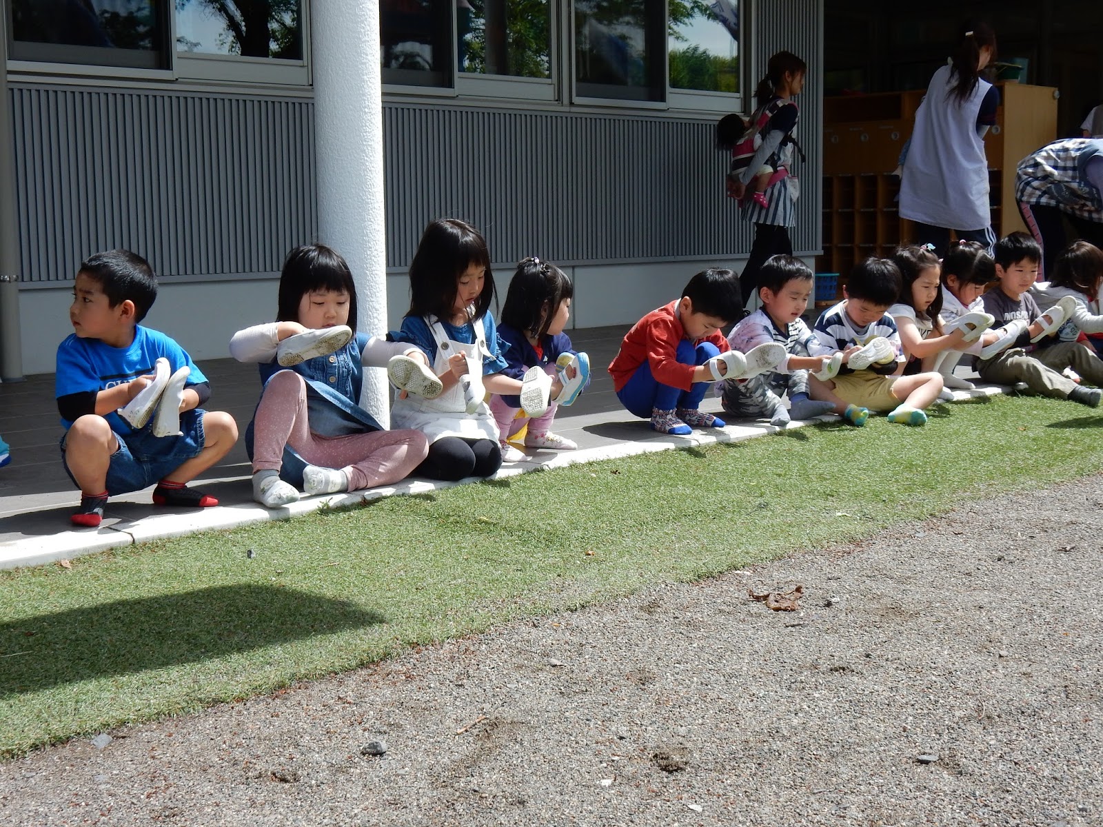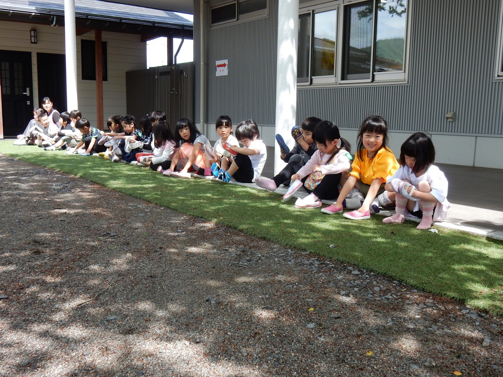 お部屋の靴のまま逃げ出した大きいクラスのお友達は、園内に入る前に靴の裏をきれいにしました!みんなが並んでパンパン!と芝に叩く姿がかわいらしかったです。