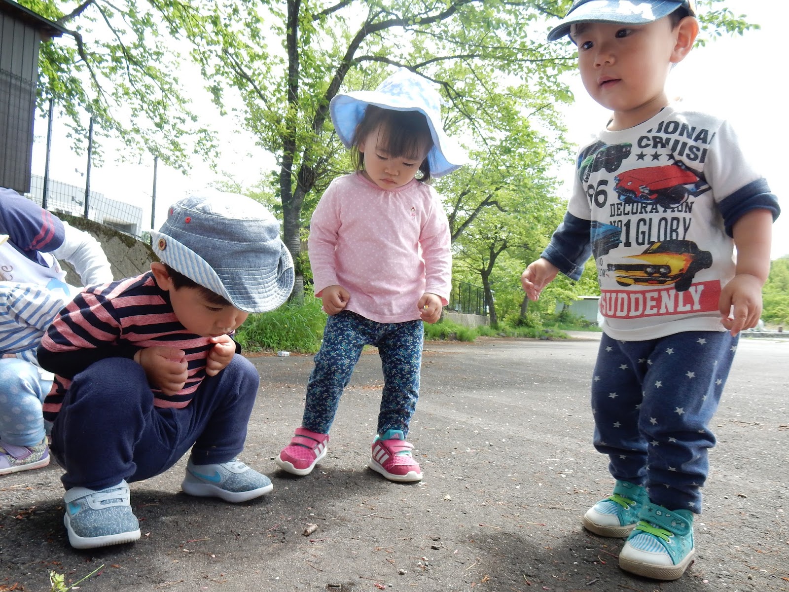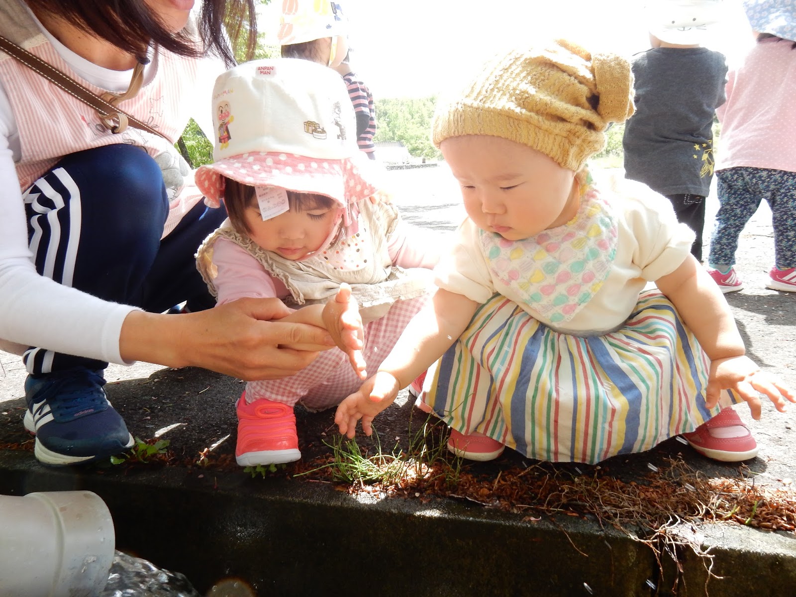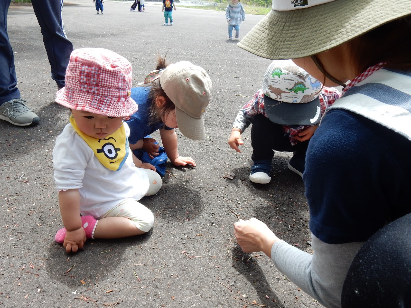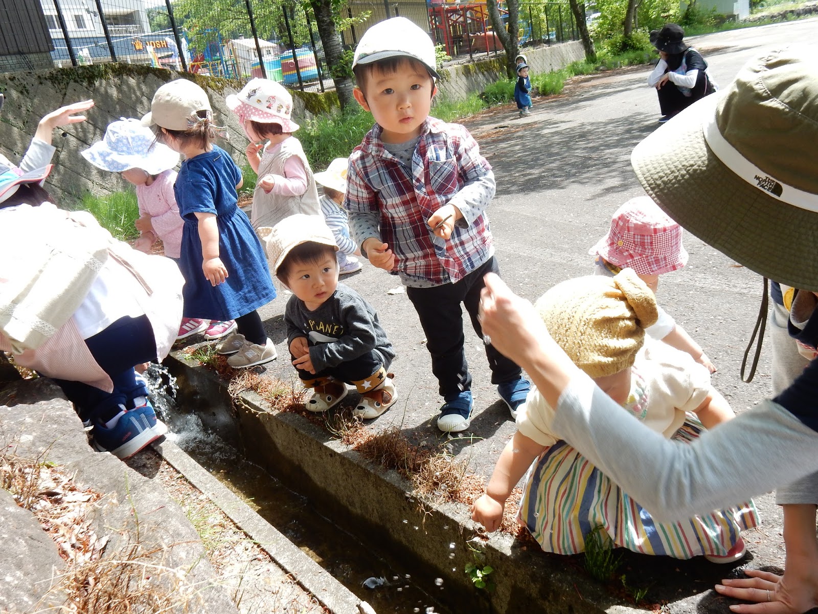 ひよこさんも、集会所を目指してお出かけ。途中で側溝を流れる水を覗き込んだり、タニシを見つけたり。春は、戸外へ飛び出すだけで本当に色々な出会いがありますね!