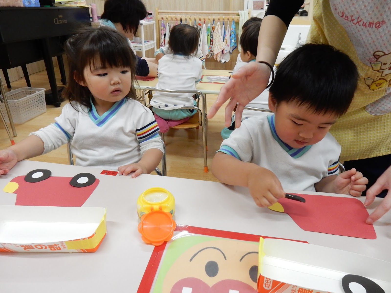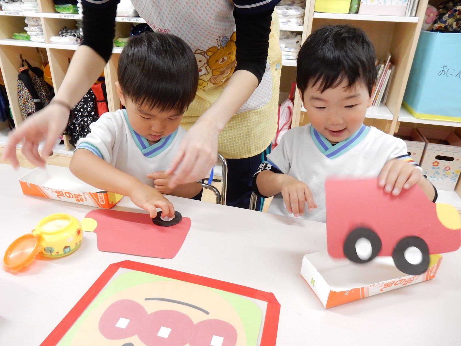 すみれさんは、父の日のプレゼント作りです。子ども達も喜ぶ車のモチーフで、タイヤを貼りつけると、ぶーん!!!と走らせてみるお友達がたくさんいましたよ!ここからどんなものができあがるのか、楽しみですね!