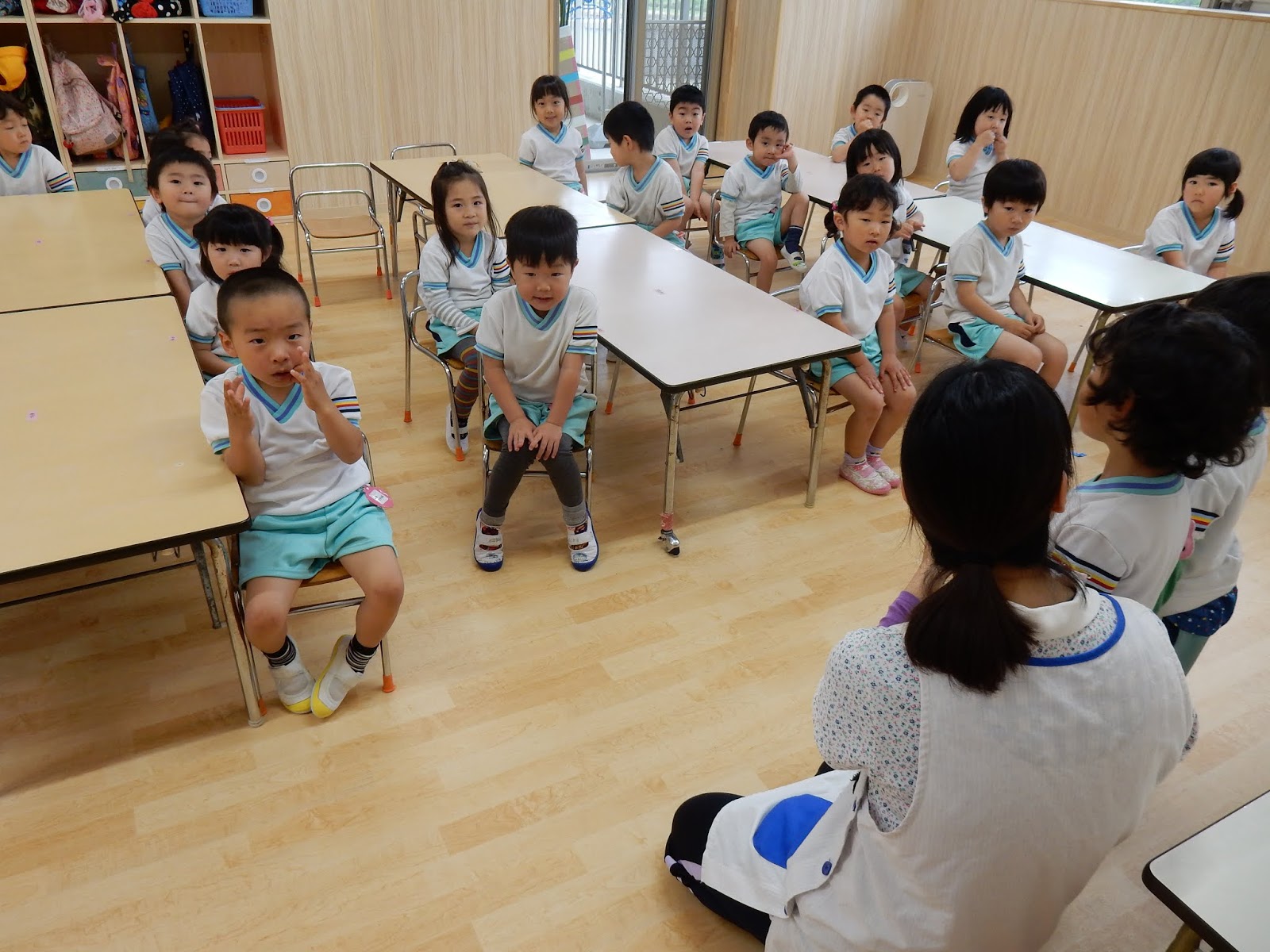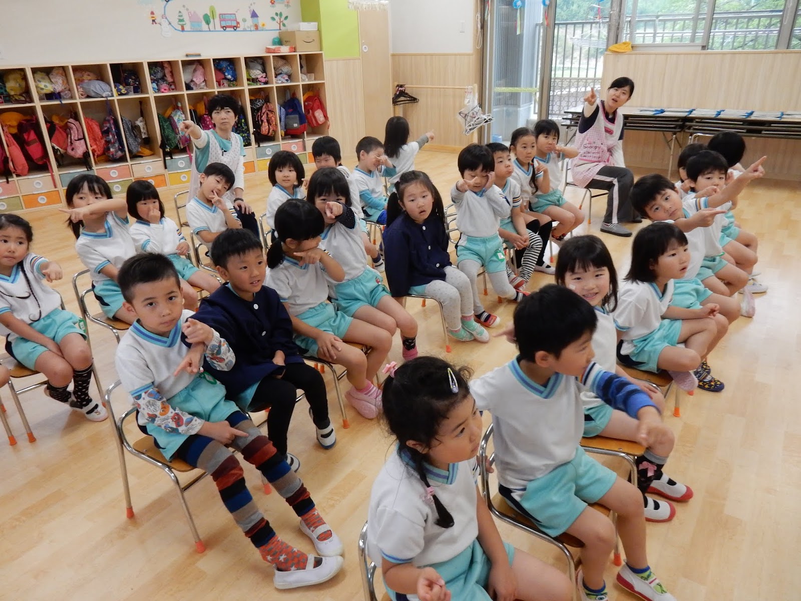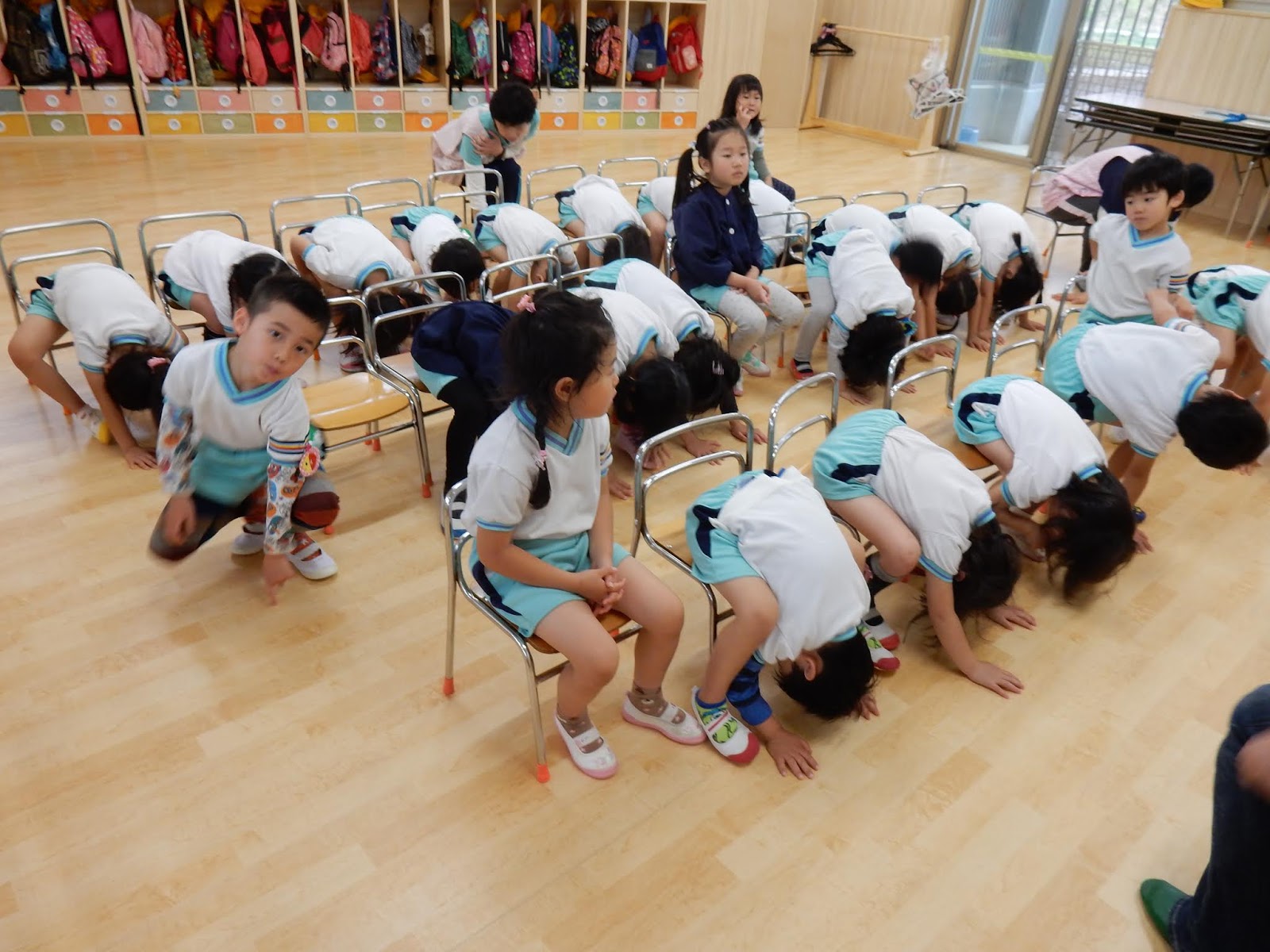 ひまわりさんは英会話。お部屋の中にある物を英語で教えてもらいました。覚えたばかりの単語で、ゲームも。『窓を指さして!』 『床に触って!』という指令を英語で聞いて、答えます。大人でも、あれ??って迷ってしまいますが、みんななかなかいいスピードで反応していました。