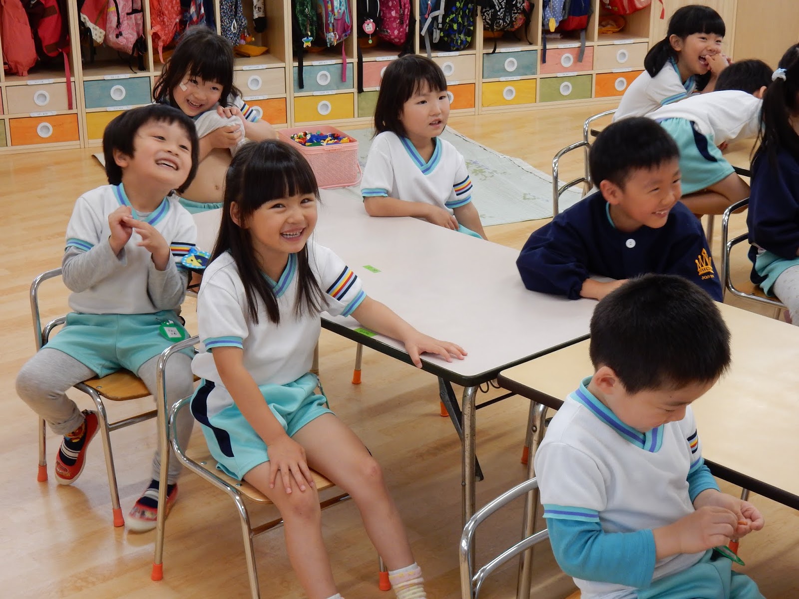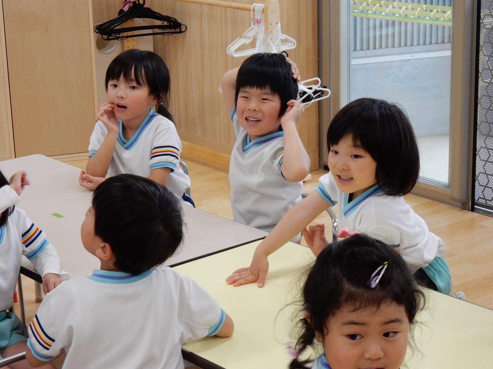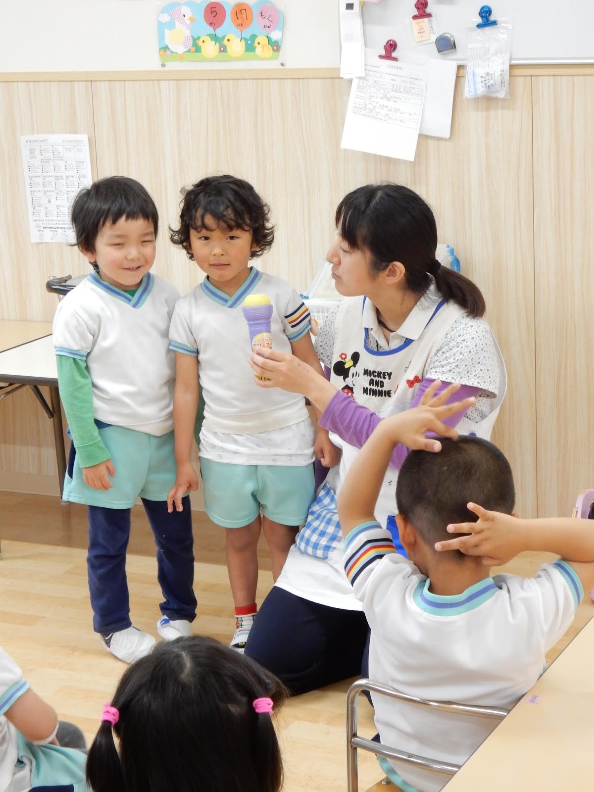 ひまわりさんは英会話。お部屋の中にある物を英語で教えてもらいました。覚えたばかりの単語で、ゲームも。『窓を指さして!』 『床に触って!』という指令を英語で聞いて、答えます。大人でも、あれ??って迷ってしまいますが、みんななかなかいいスピードで反応していました。