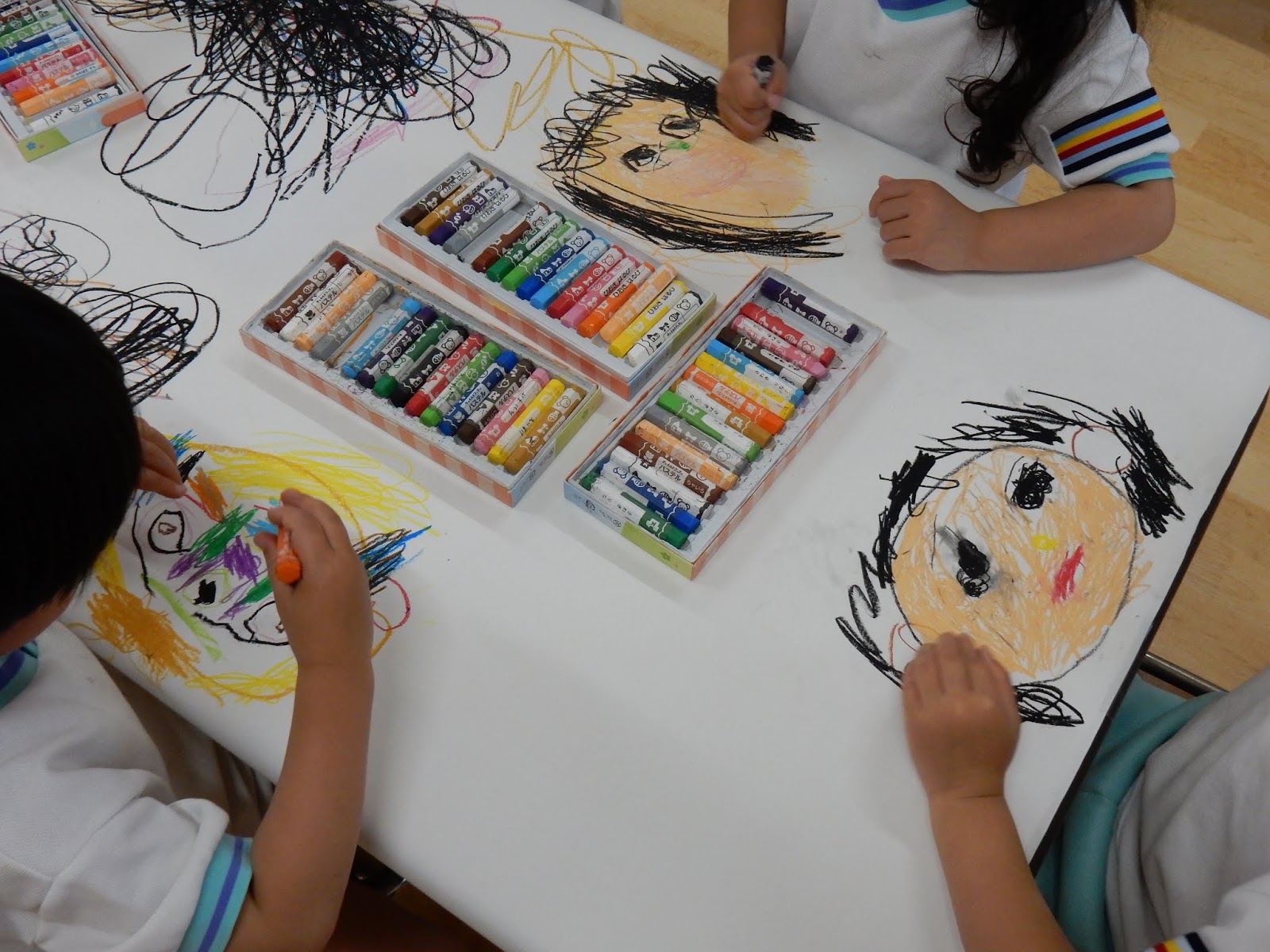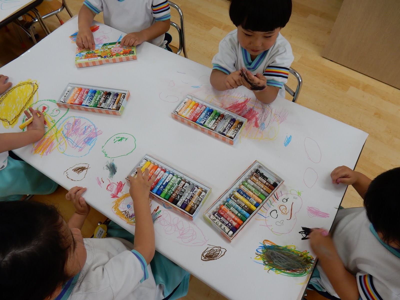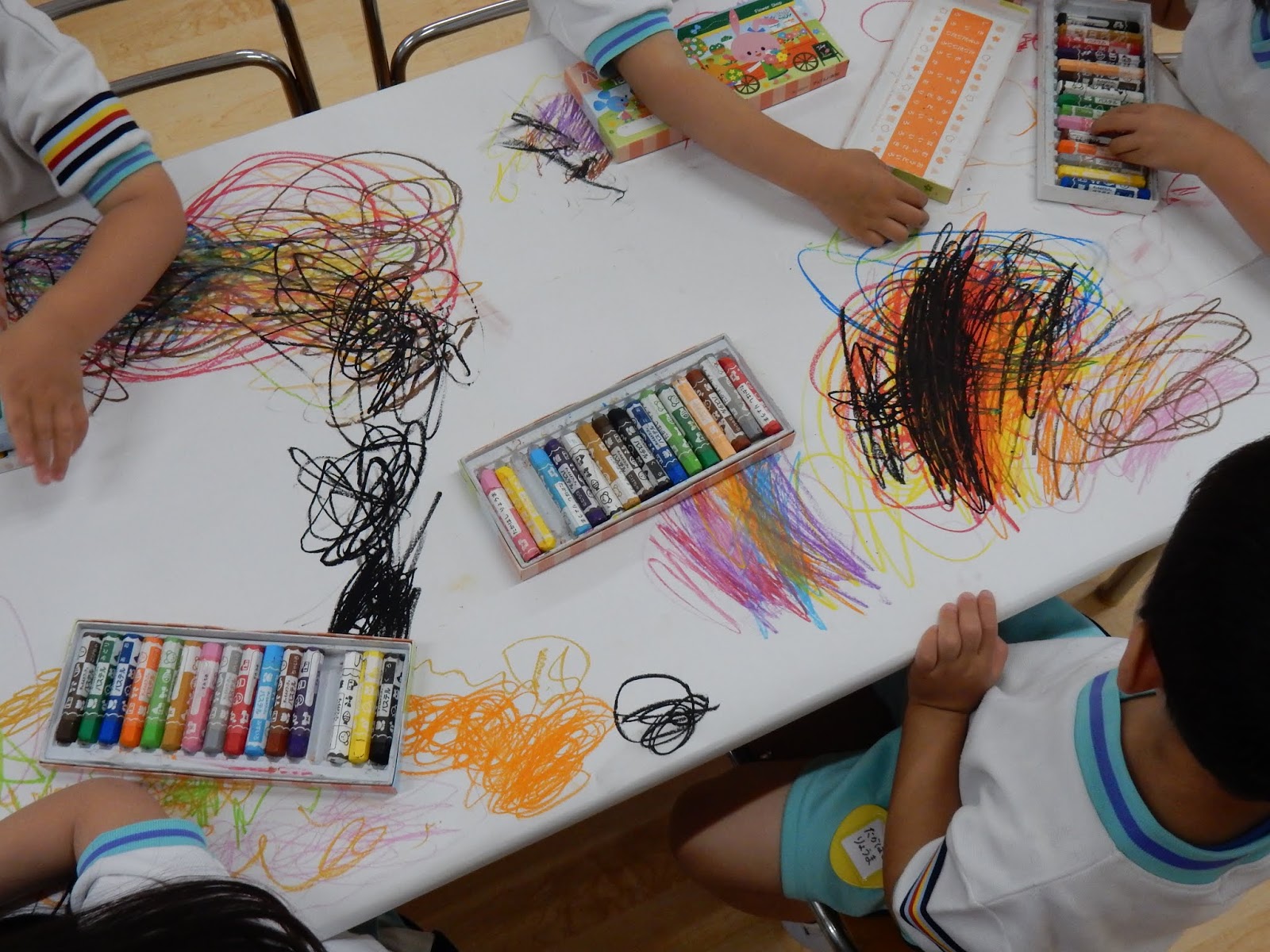 たんぽぽさんは、クレヨンでお絵描き。使い方をみんなで確認して、その後、机に広げた大きな大きな紙にたくさん描きました!1人1人、描くものが違いますが、『何を描いたの??』ときいてみると、みんな、『あのね、これはね…♪』といろんなお話をしてくれます。まだ、形にならない子も、力強く、色々な色を使ってかけている事が大切です。だんだん上手な絵は描けるようになっていくので、その時、その年齢の表現を大切に、認めてあげたいですね!