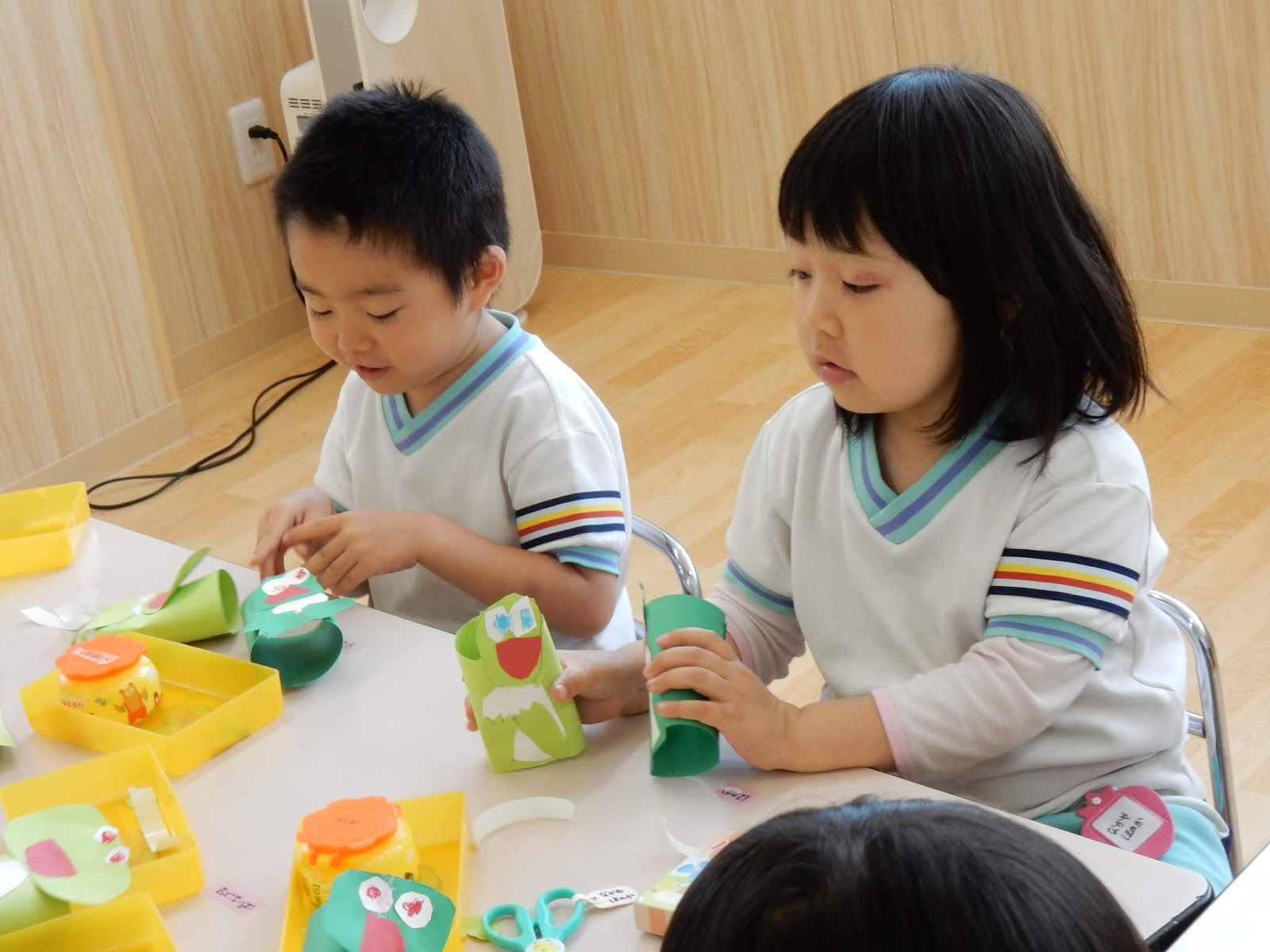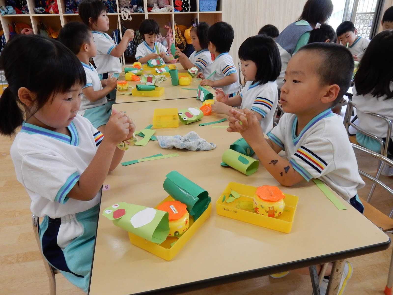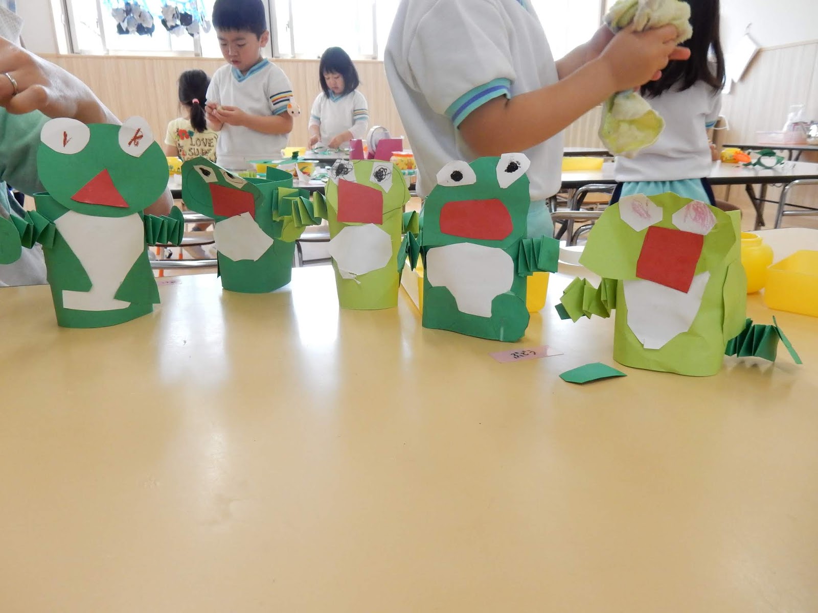 ゆりさんは、みんなでカエルを作っていました。画用紙をクルリと回してくっつけたり、じゃばら折り下手をつけたり。並べてみると、表情豊かな可愛らしいカエルが並びましたよ!作りながら、グループのお友達とカエルを使ってお喋りを楽しんでいる子もたくさんいましたよ!