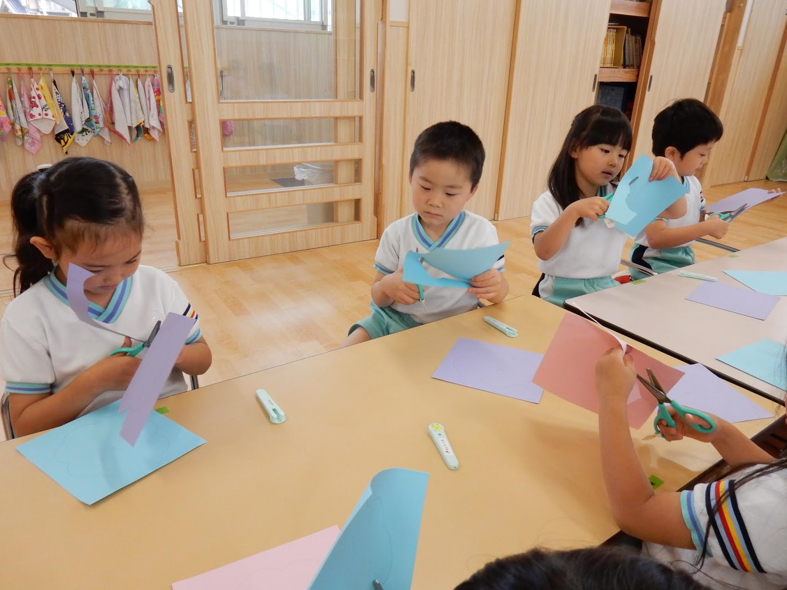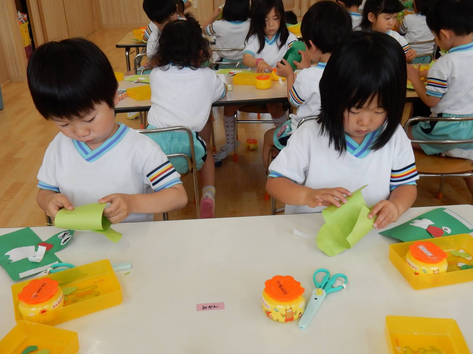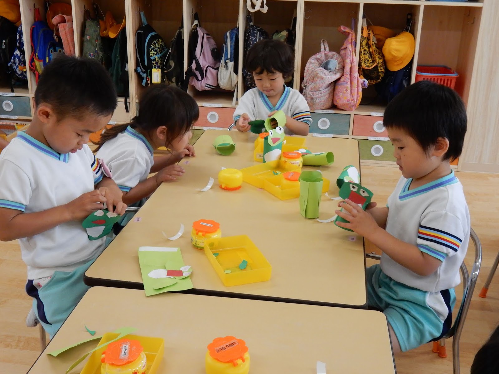 ゆりさんは、みんなでカエルを作っていました。画用紙をクルリと回してくっつけたり、じゃばら折り下手をつけたり。並べてみると、表情豊かな可愛らしいカエルが並びましたよ!作りながら、グループのお友達とカエルを使ってお喋りを楽しんでいる子もたくさんいましたよ!