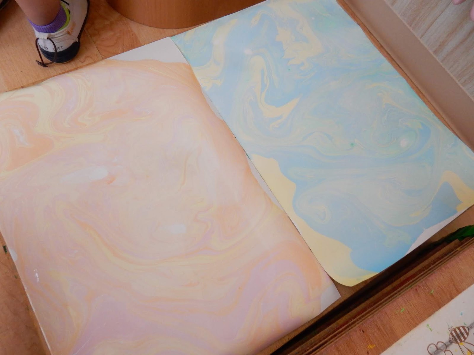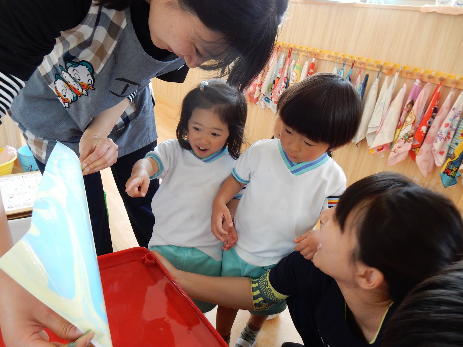たんぽぽさんは、マーブリングをしていました。水の上に液をたらして、まぜまぜ…そこに紙を浮かべると、模様がうつります。ひっくり返した時の子ども達の反応!『うわ~!』と歓声があがったり、???と不思議そうにしたり、様々でした!