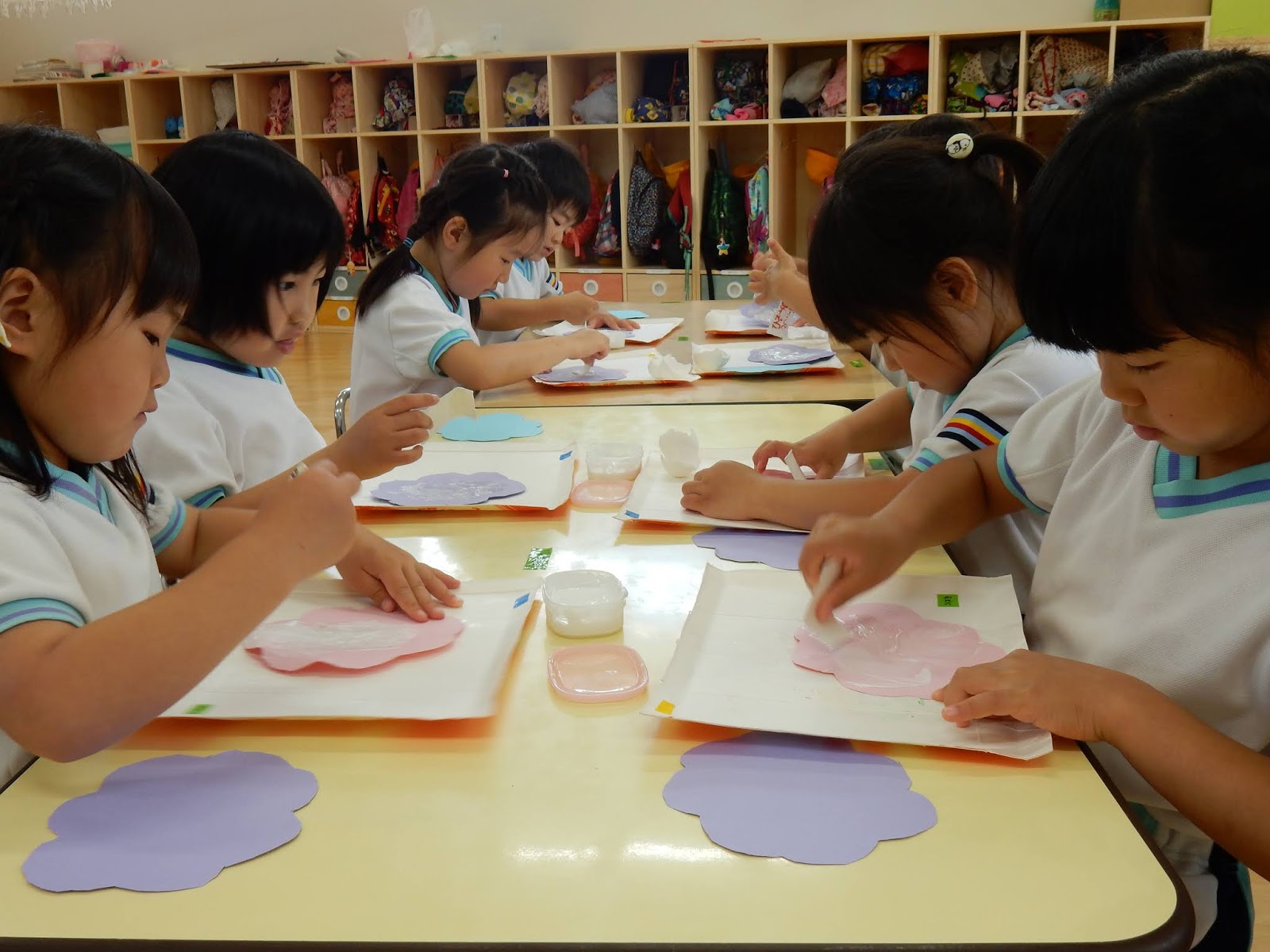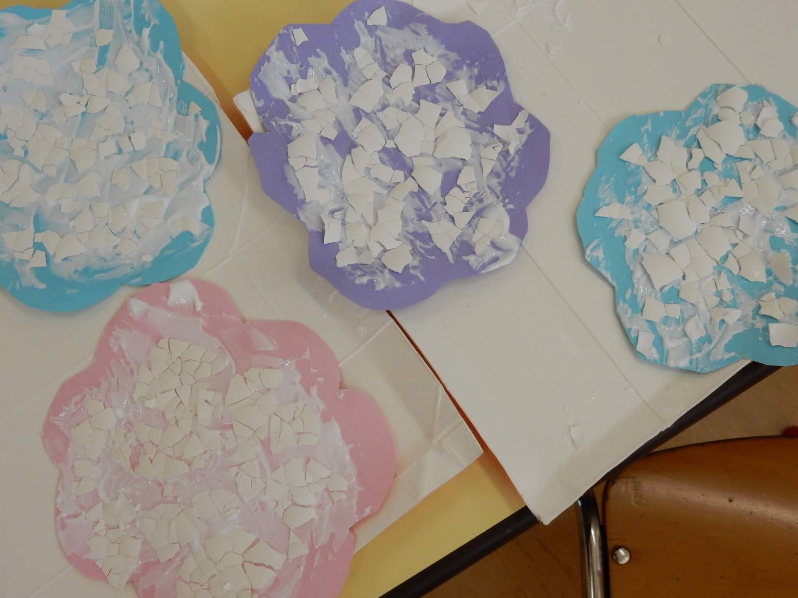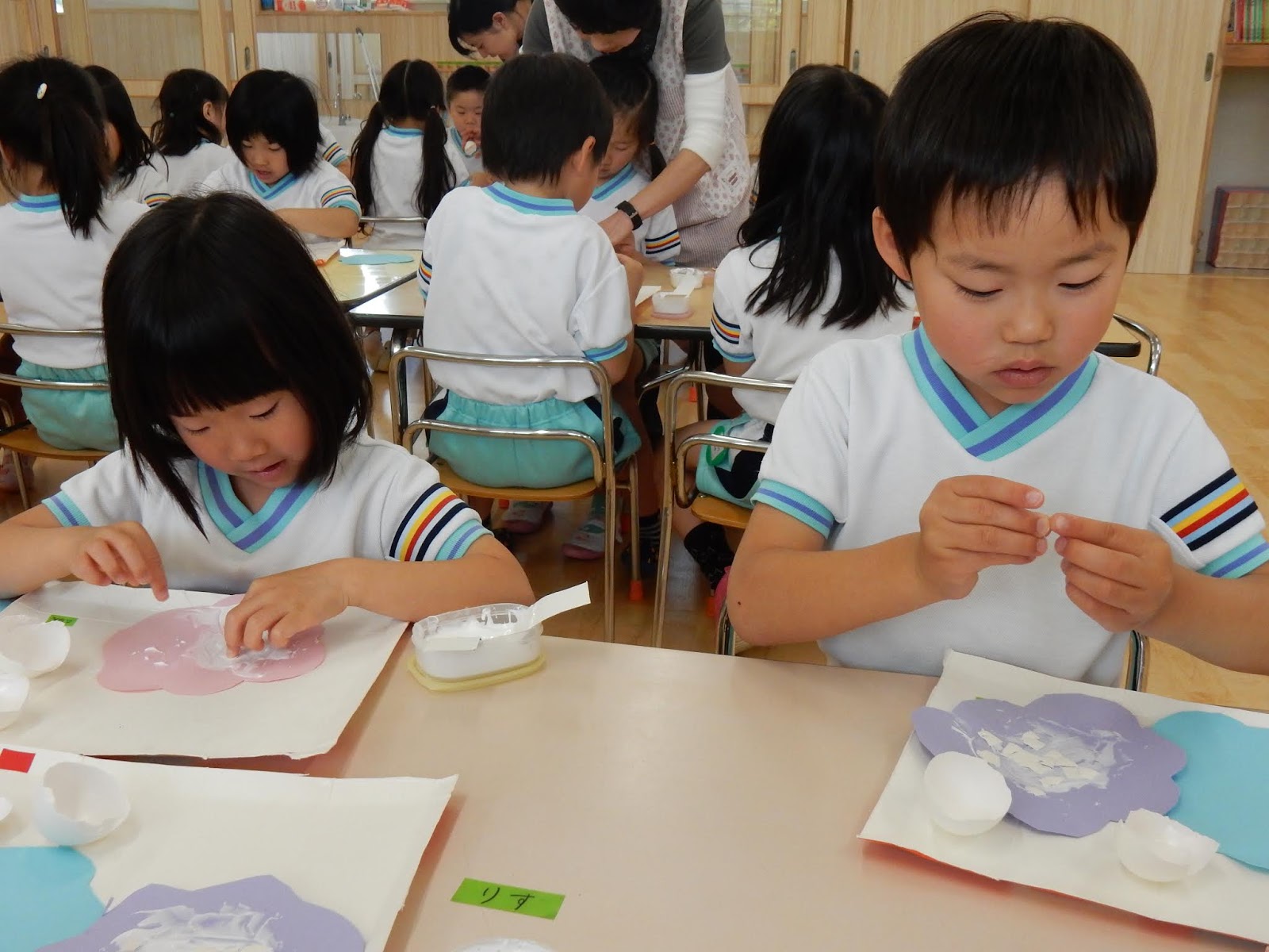 『ちょきちょきペーパー♪』と、土曜日の人形劇講演で聞いた歌が大きな声で聞こえてきたひまわりさん。覗いてみると、みんなも画用紙とはさみを持って、切っていました(笑)とっても楽しかったんでしょうね、人形劇!歌を歌いながらあっという間にアジサイの土台ができました。そこにボンドをぬって、今日は卵のカラを使っての製作です。あまり使ったことのない素材に、子ども達も『おもしろい!!』と大絶賛!さて、ここからどんなアジサイができるのか、楽しみですね!