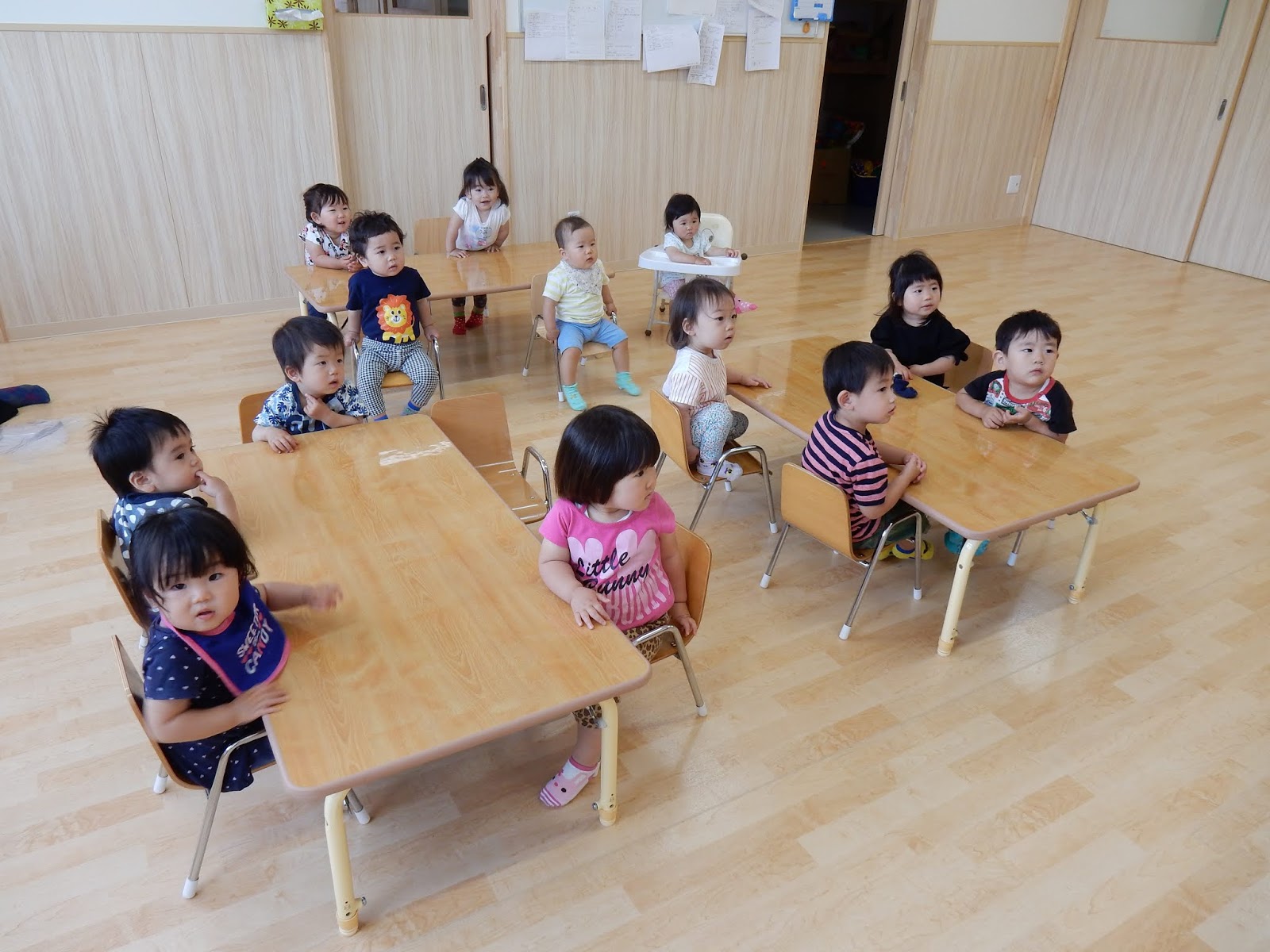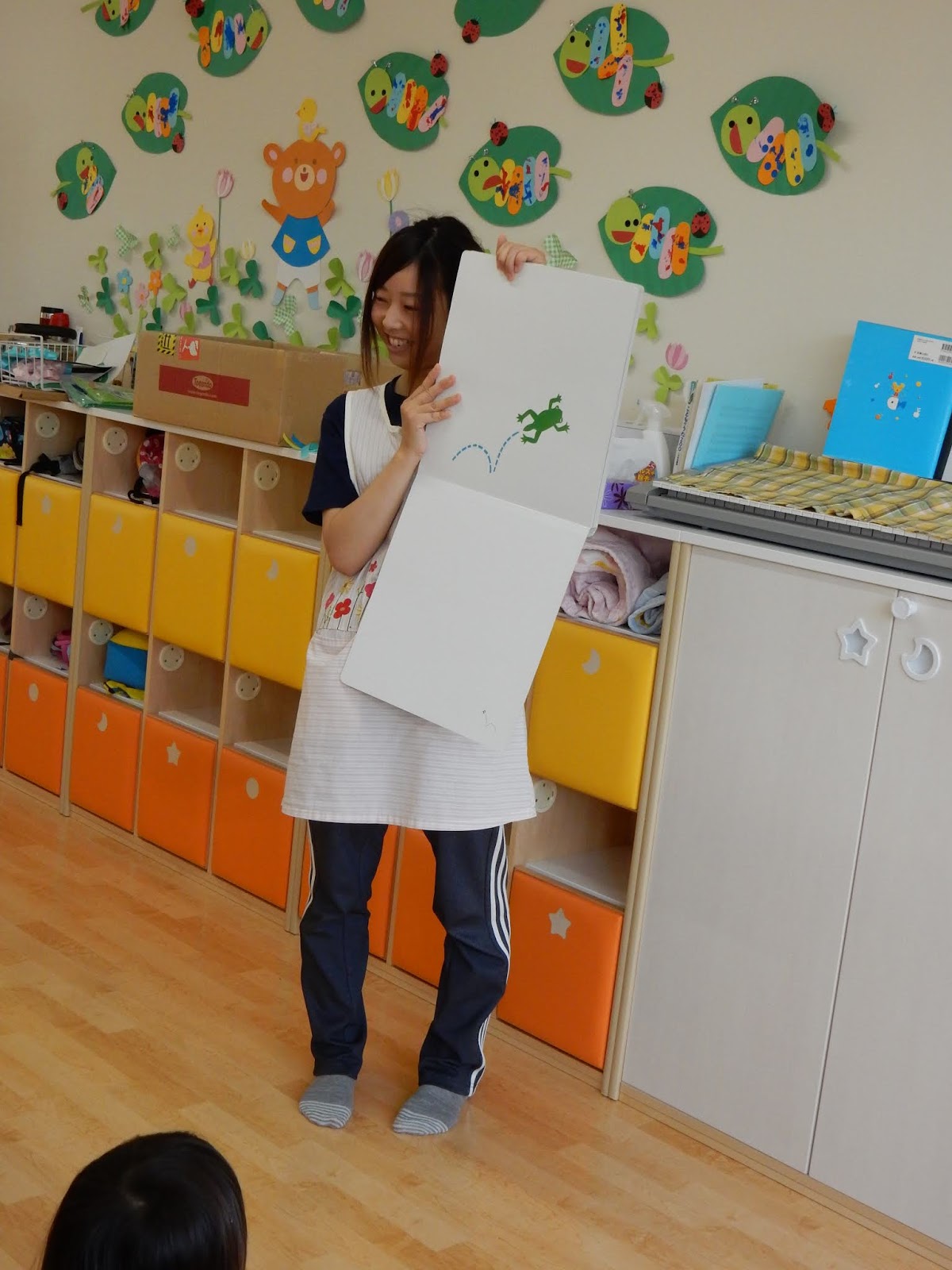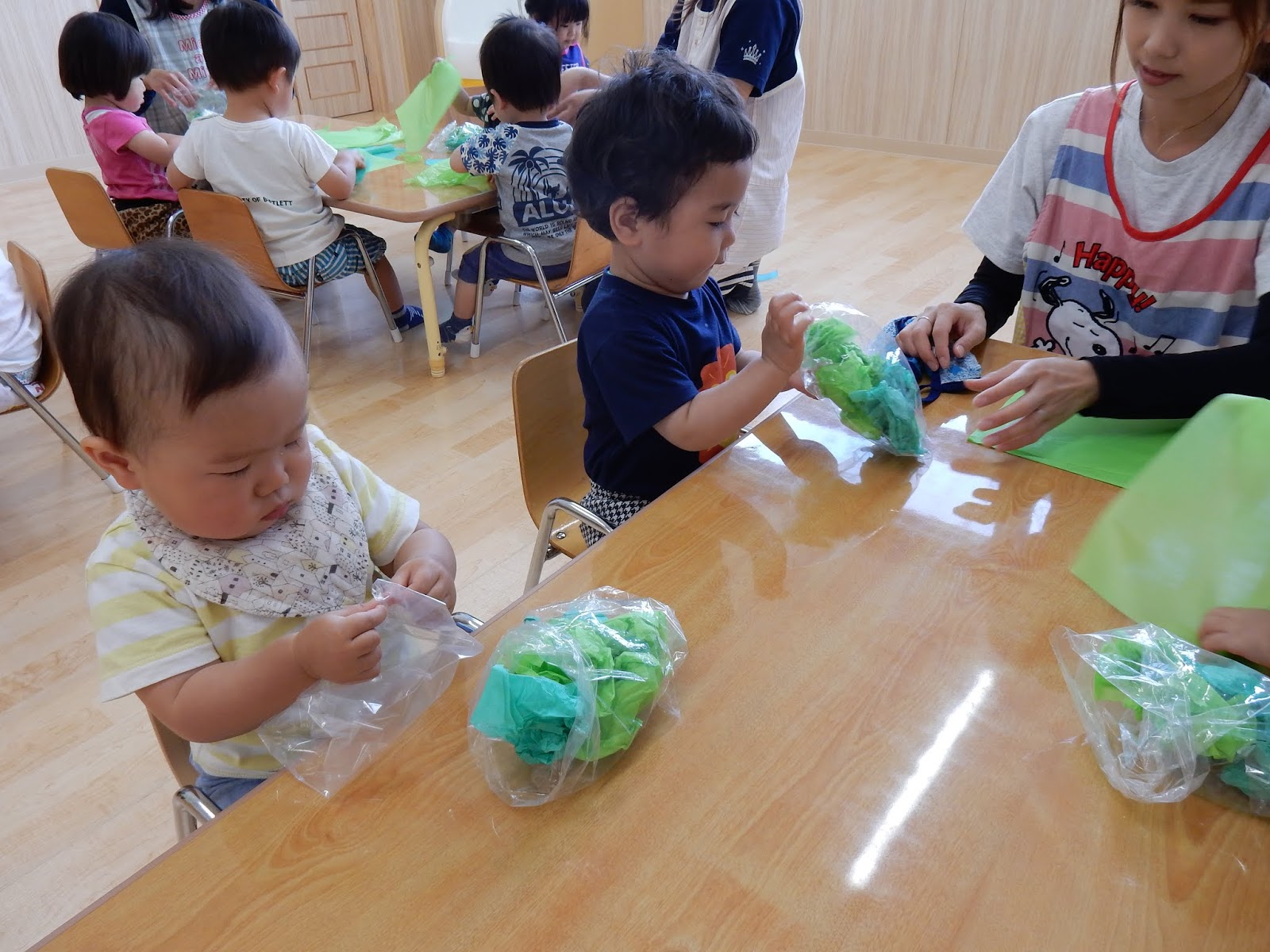 みんなでカエルさんの出てくる絵本を見てから、ビニール袋にお花紙をフワフワ詰め込んでカエルさんを作ったひよこさん。目や口を付けると、みんなそれぞれ可愛らしい出来上がり。『ぴょーん!』 『ぴょーん!』と跳ねるマネっこをして遊んでいました。とっても楽しそうにお友達とぴょんぴょんする横で、先生は『つぶれる~!!!』と慌てていましたけどね(笑)