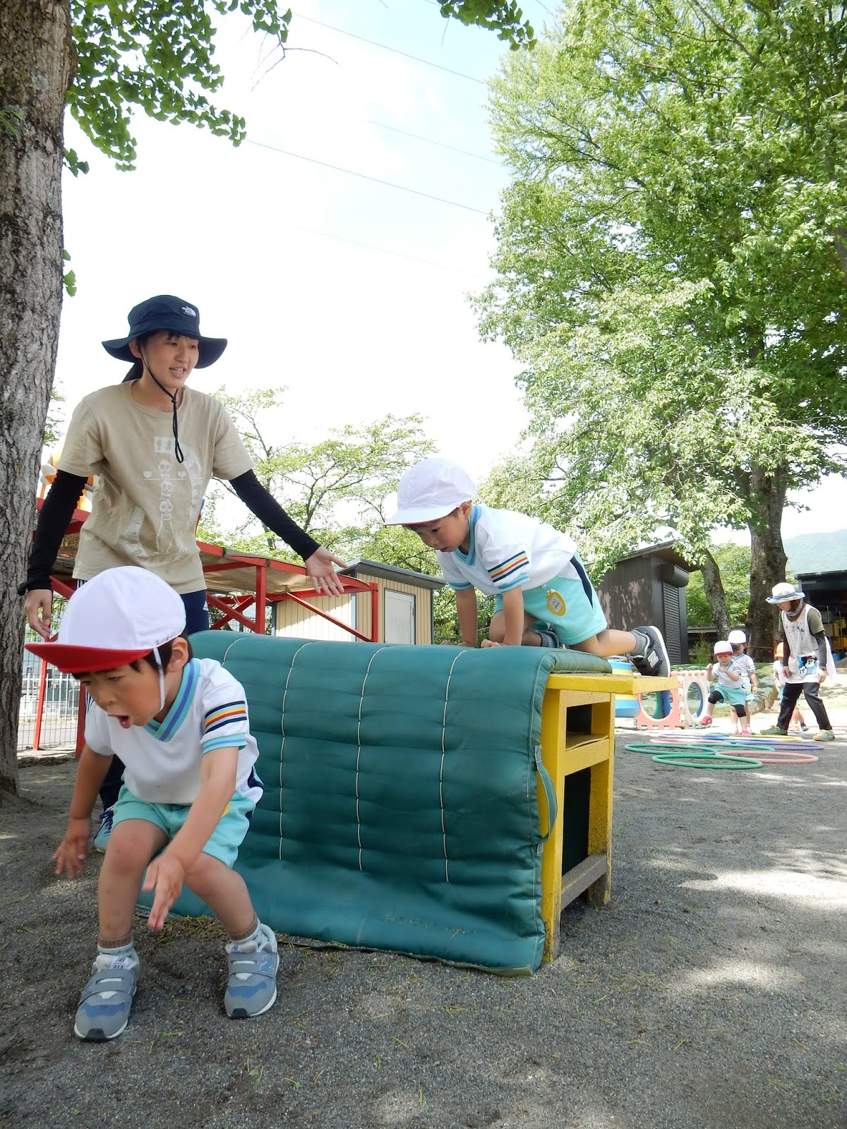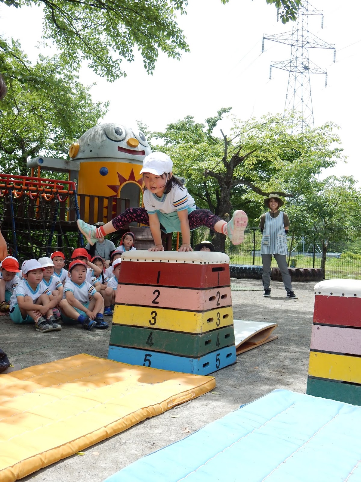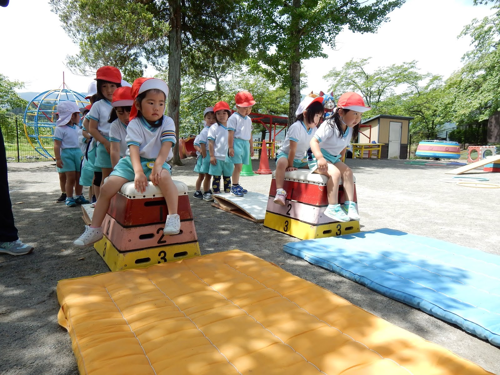 サーキット遊びでは、たんぽぽさんよりも少し難しくなったみたい。やる気満々のゆりさん、ひmあわりさんみたいに、跳び箱を飛び越えられる子も出てきましたよ!