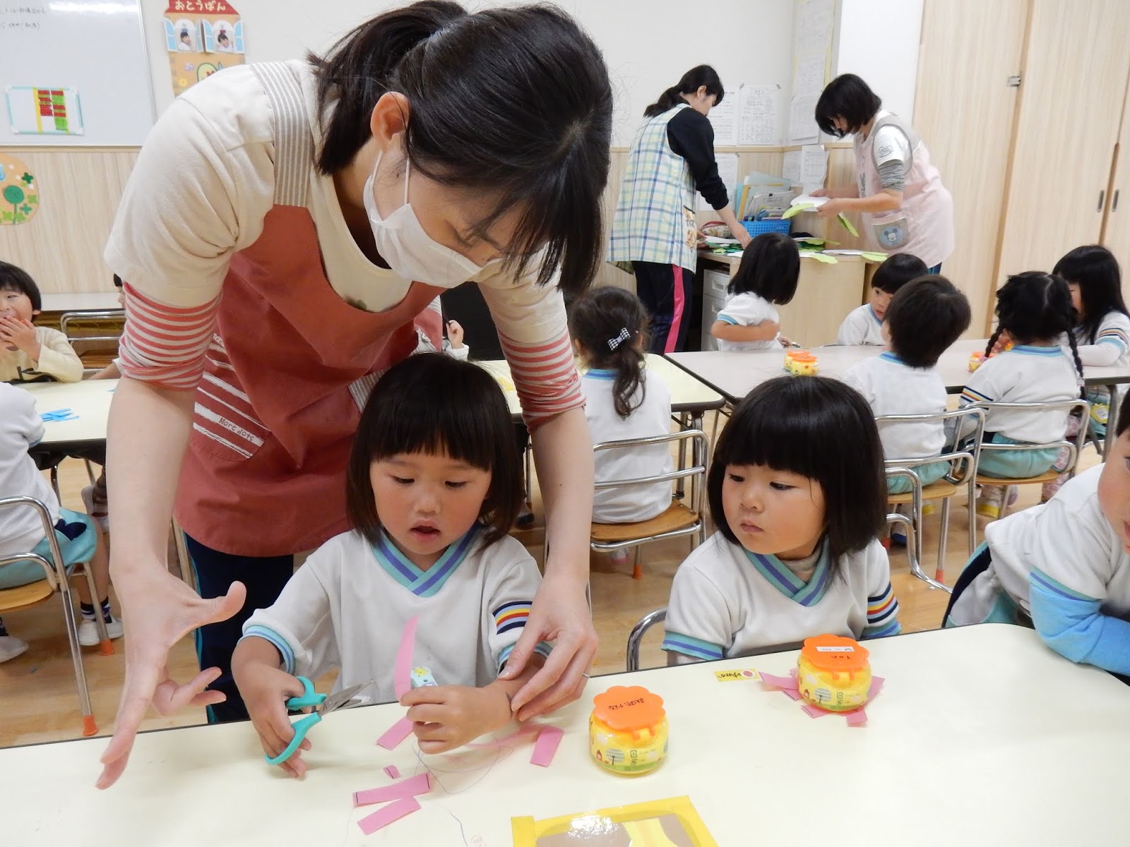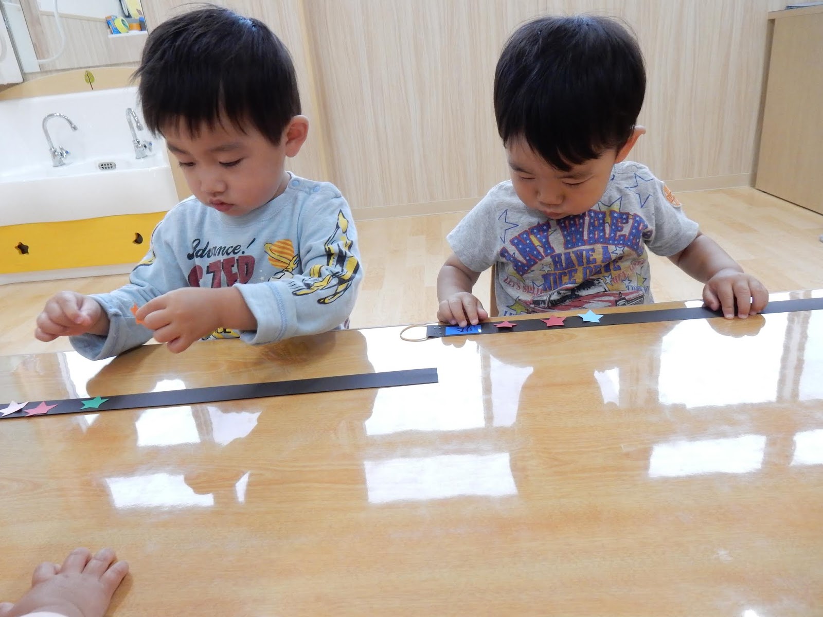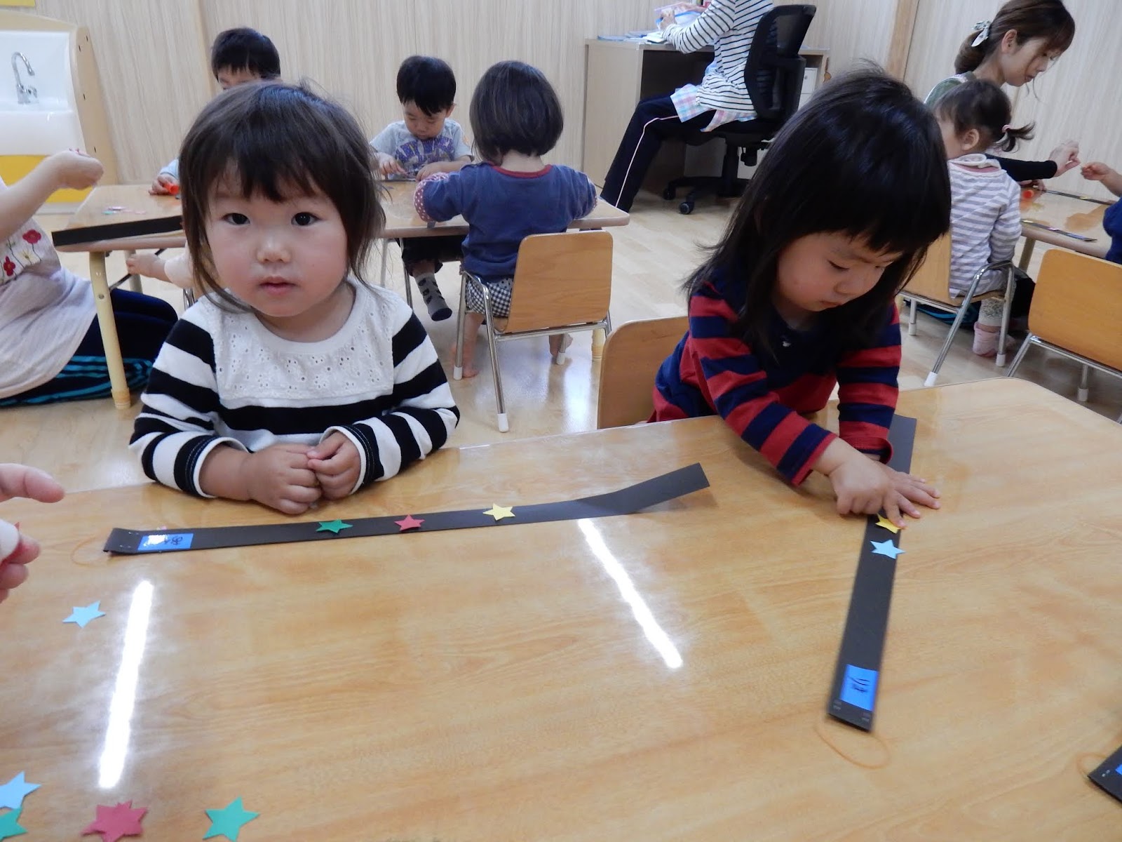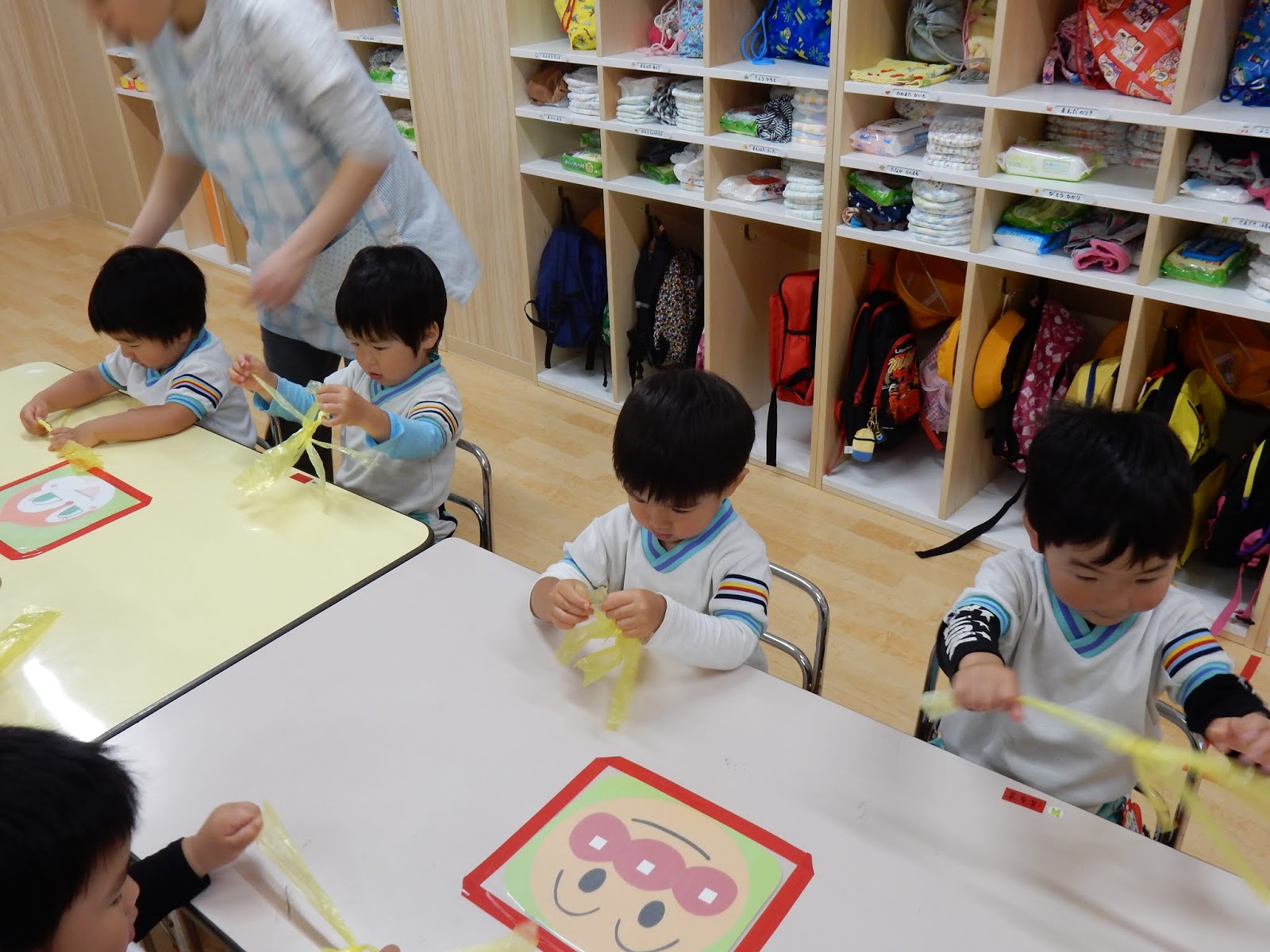 そんなすみれさんは、今日はお星さまにかわいい顔を書いていましたよ!まだまだしっかり、目、口とパーツにはならない子も多いですが、先生と『〇〇くんのおめめはどこかな??』などと会話を楽しみながら、描いていきました。その後は、タフロープの束をもらって、スーッとやぶってみました。普段、“やぶっちゃダメ!!”と言われることは多いと思いますが、これがなかなか楽しいようで、みんな夢中になっていました。