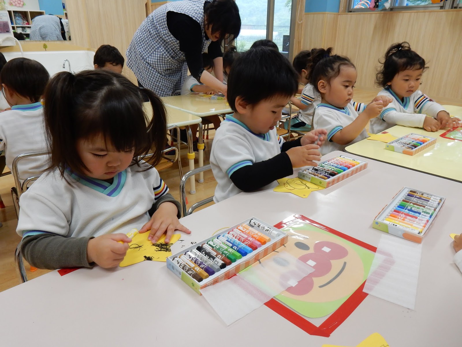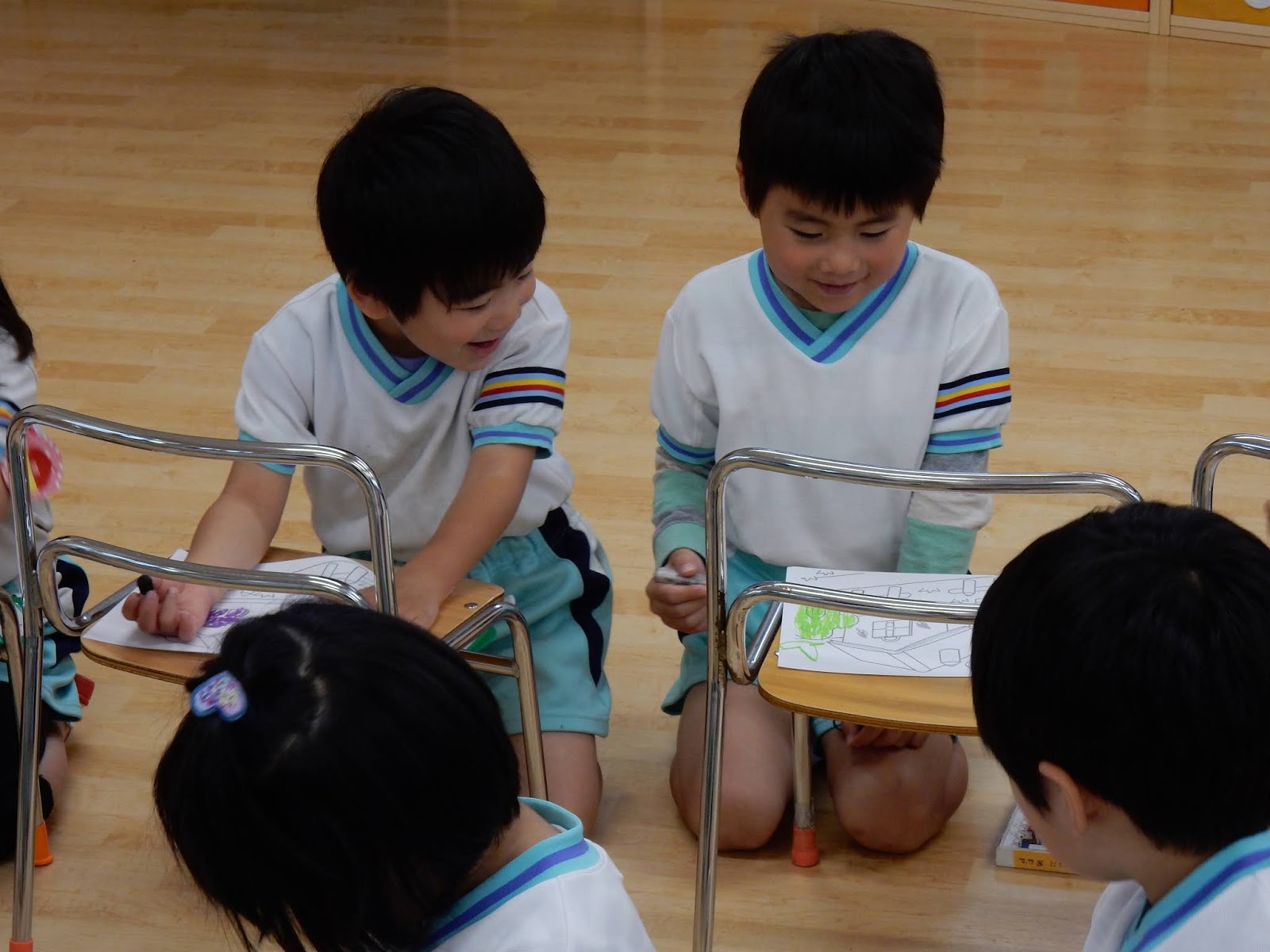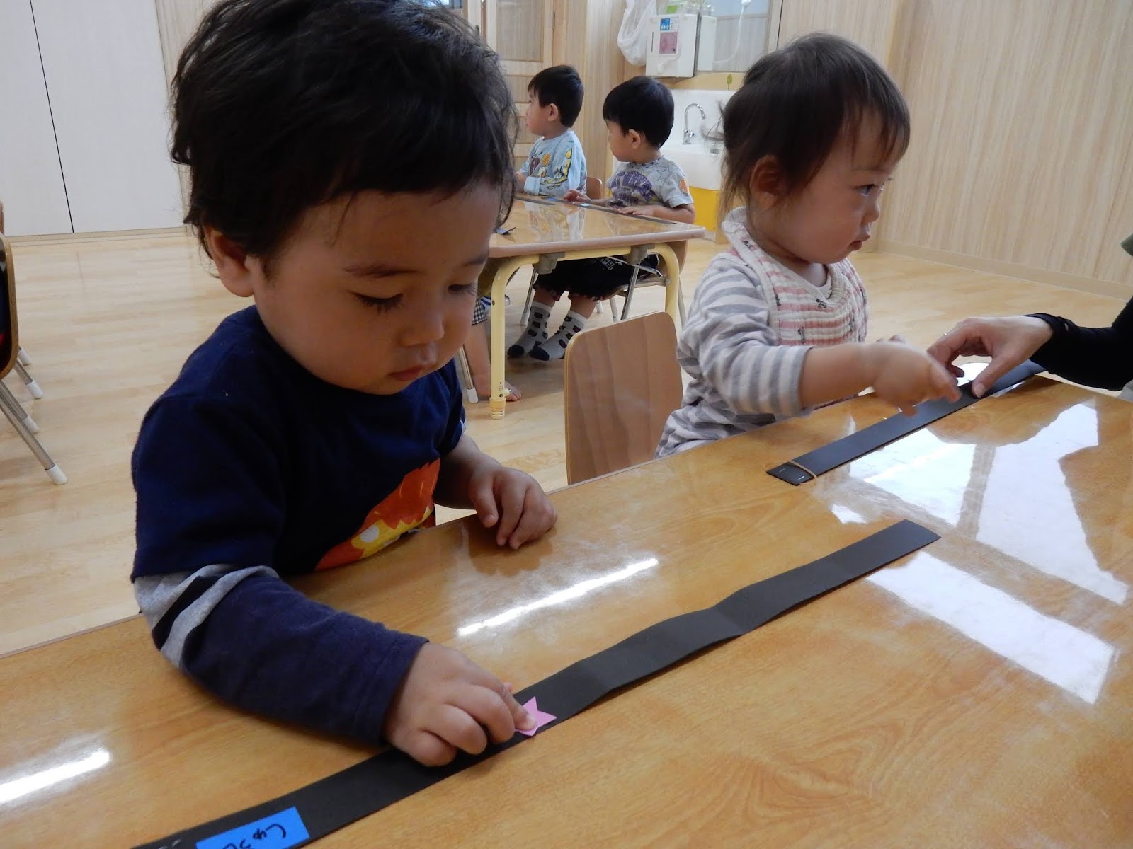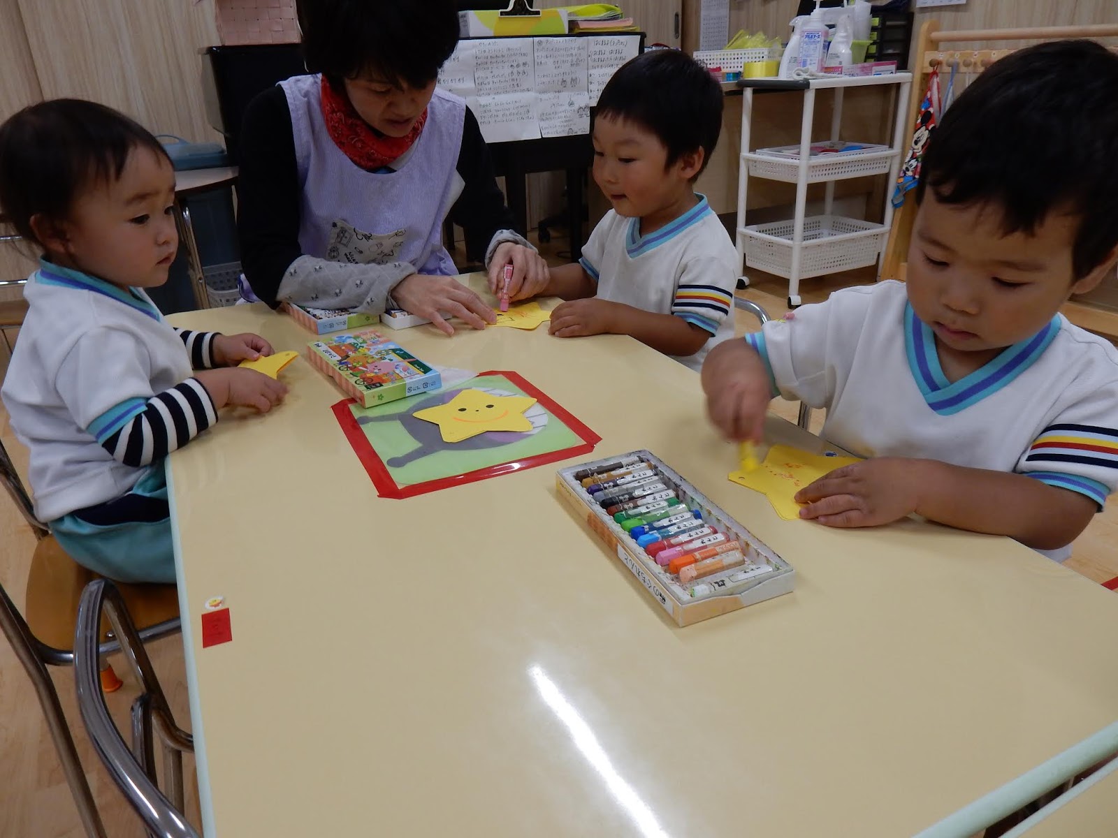 そんなすみれさんは、今日はお星さまにかわいい顔を書いていましたよ!まだまだしっかり、目、口とパーツにはならない子も多いですが、先生と『〇〇くんのおめめはどこかな??』などと会話を楽しみながら、描いていきました。その後は、タフロープの束をもらって、スーッとやぶってみました。普段、“やぶっちゃダメ!!”と言われることは多いと思いますが、これがなかなか楽しいようで、みんな夢中になっていました。